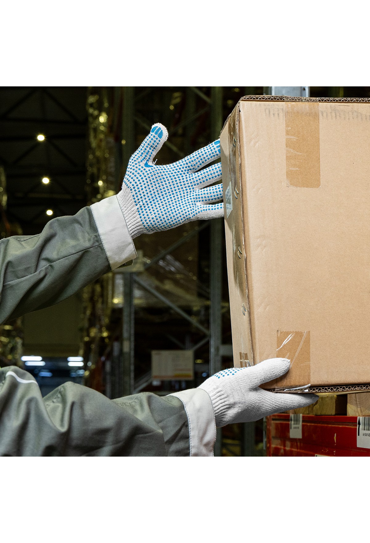 Трикотажные перчатки 67702 со стикером, с ПВХ-покрытием «Точка», 10 класса вязки, защищают руки от царапин, порезов, ссадин, мозолей и загрязнений. Тонкая пряжа сохраняет чувствительность пальцев, поэтому перчатки подходят для выполнения точных работ. Благодаря ПВХ-покрытию ладонной части инструменты не выскальзывают из рук. Перчатки используют в строительстве, на производстве, во время ремонта помещений и обслуживания автомобилей. Пригодятся они и в хозяйстве.