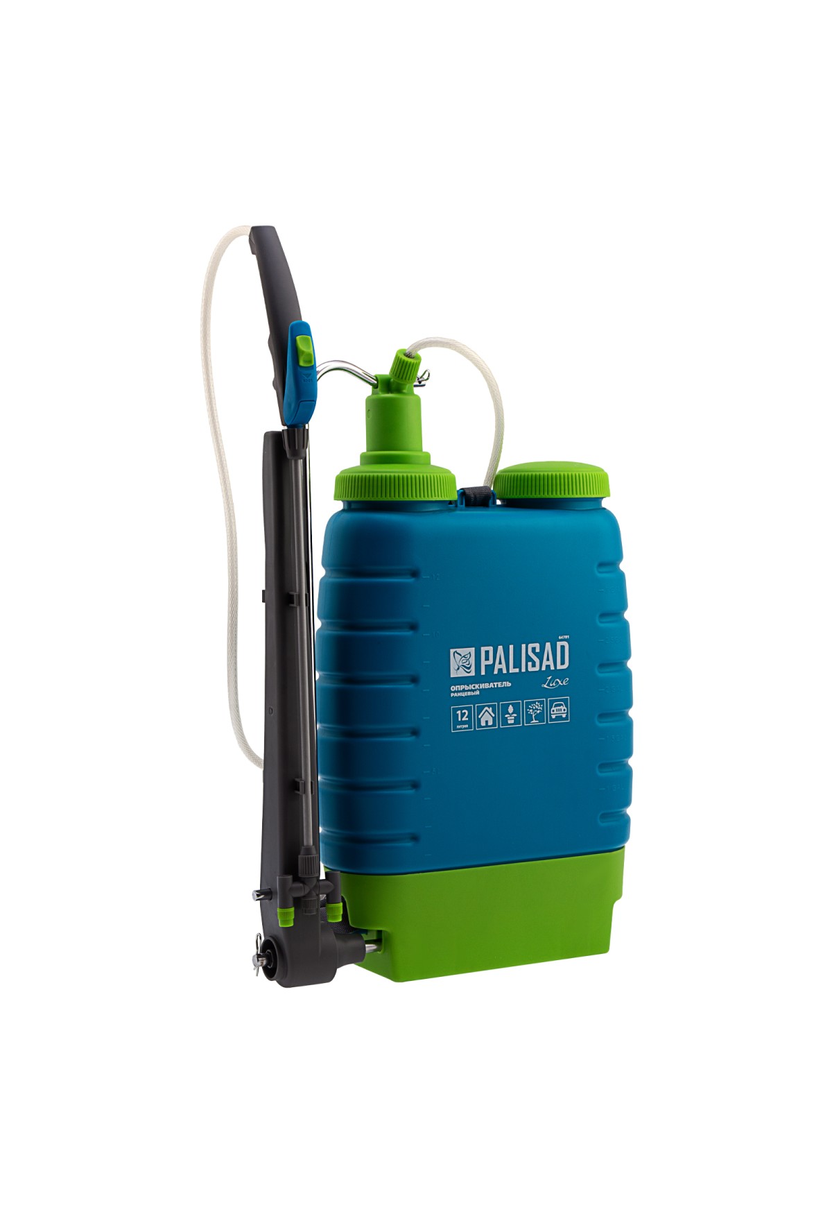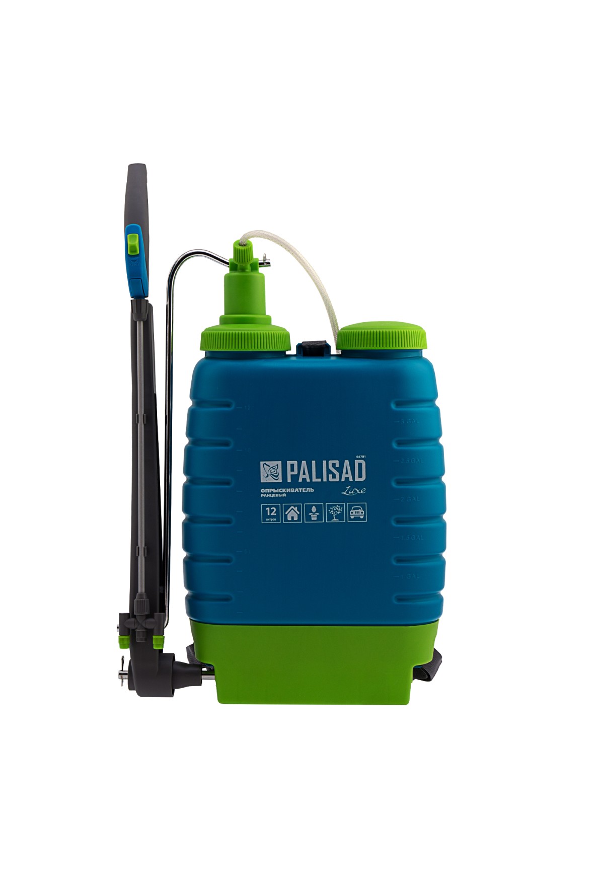 Ранцевый опрыскиватель Palisad LUXE 64781 вместимостью 12 л, с насосом, шлангом и разбрызгивателем, используется для обработки садовых растений пестицидами и для внесения удобрений. Может применяться в быту — например, для мытья автомашины или окон. Опрыскиватель устанавливают на горизонтальную поверхность или вешают за спину при помощи мягких лямок — это удобно при перемещении по большой территории. Бак вмещает 12 л, поэтому устройство долго работает без долива жидкости. Боковое расположение ручки насоса позволяет подкачивать давление в баке, не снимая опрыскиватель со спины.
