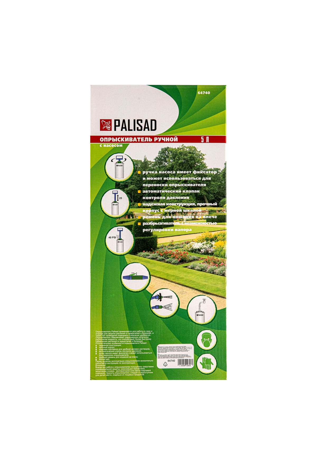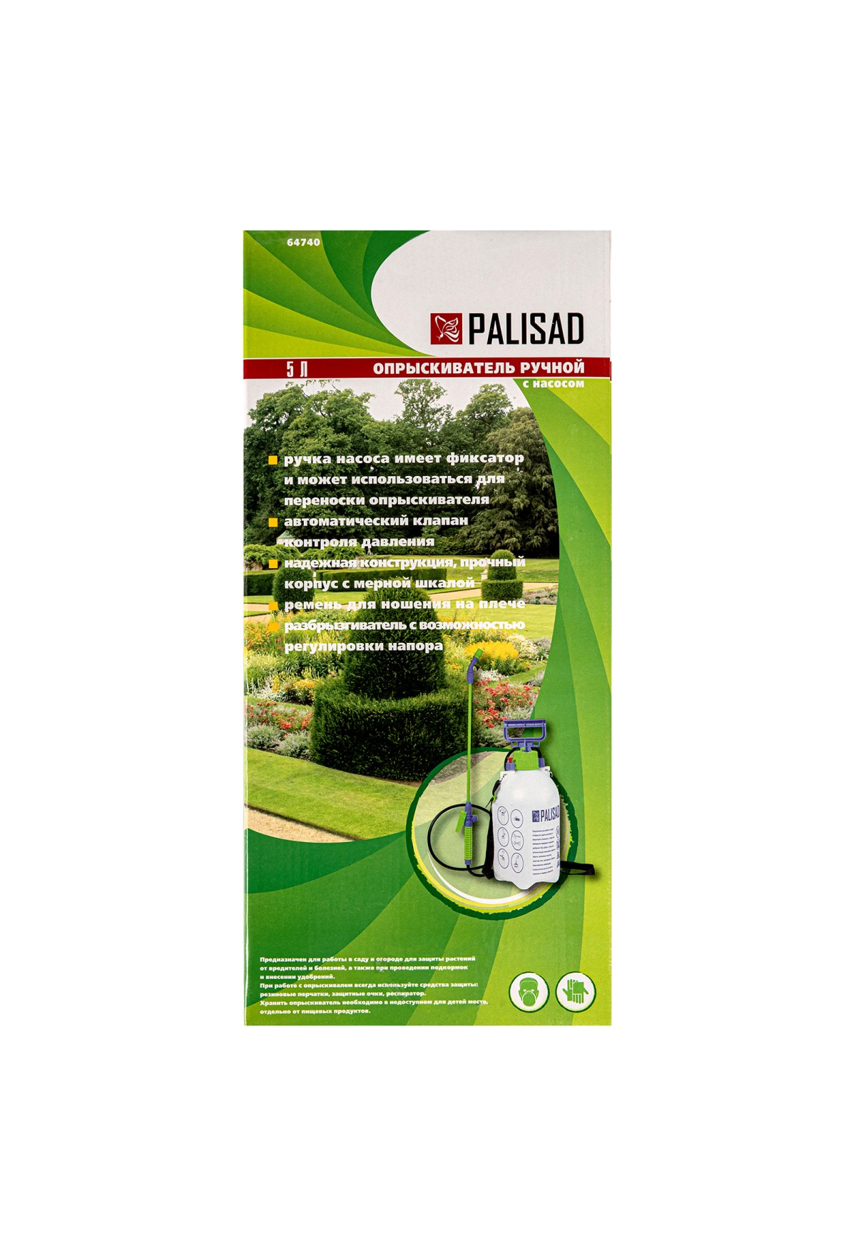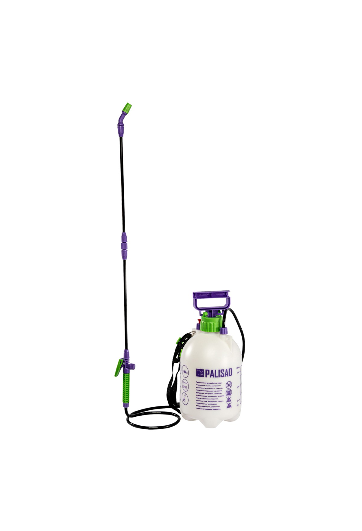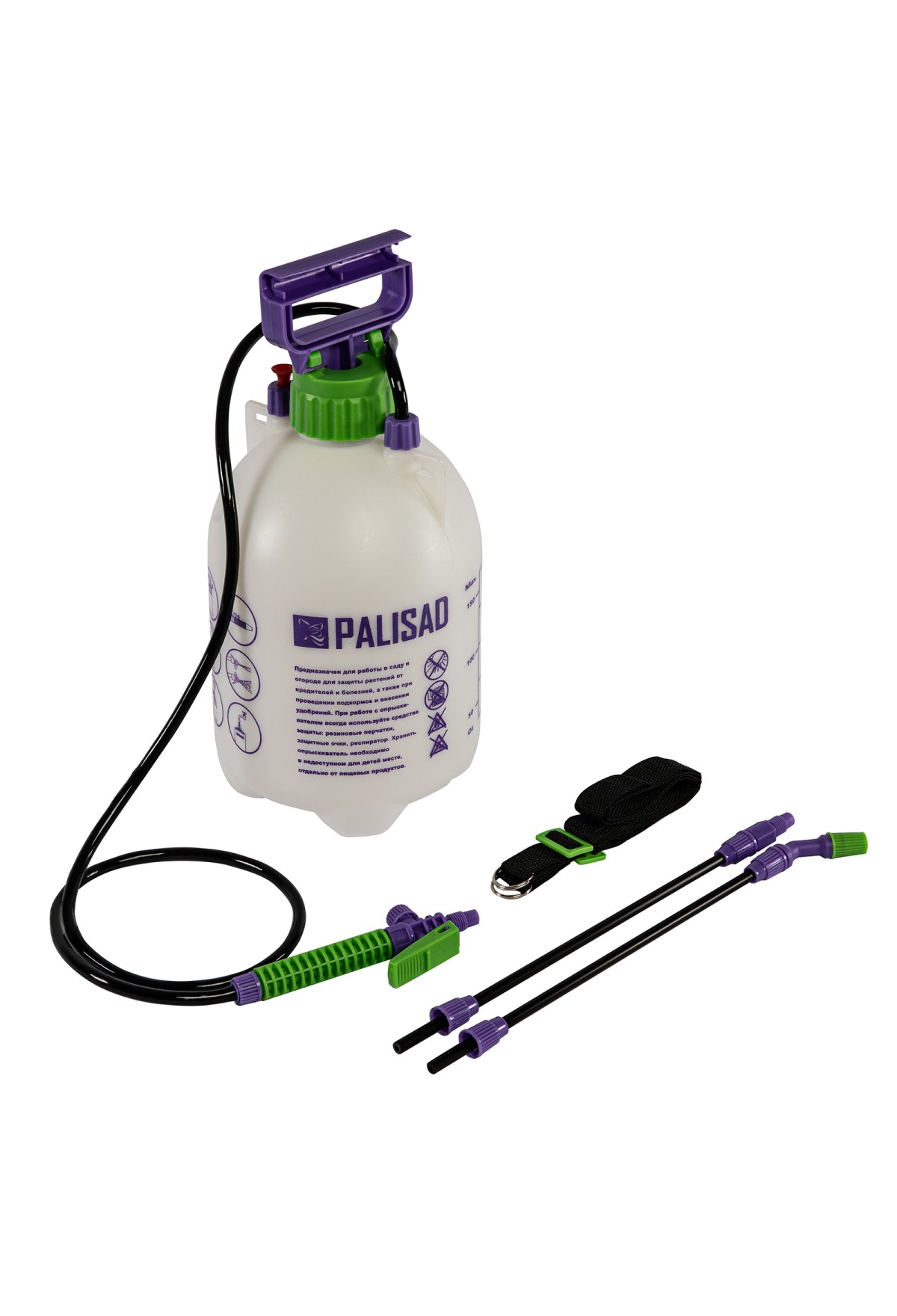 Ручной опрыскиватель Palisad 64740 с баком объемом 5 л, с насосом, шлангом и разбрызгивателем, используется для ухода за растениями на грядках, клумбах и в теплицах. Устройство предназначено для распыления пестицидов и внесения удобрений. Подача жидкости контролируется при помощи регулируемой распыляющей головки. Ремень для ношения на плече позволяет освободить руки для более комфортной работы.