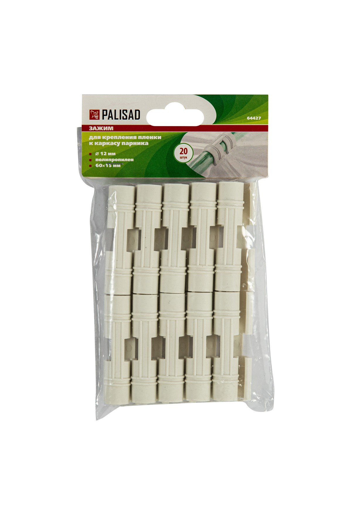 Белый зажим для крепления пленки к каркасу парника Palisad 64427, 20 шт., надежно фиксирует пленку или укрывной материал на дугах диаметром 12 мм. Он всегда пригодится в подсобном хозяйстве при сборке парников для выращивания растений.