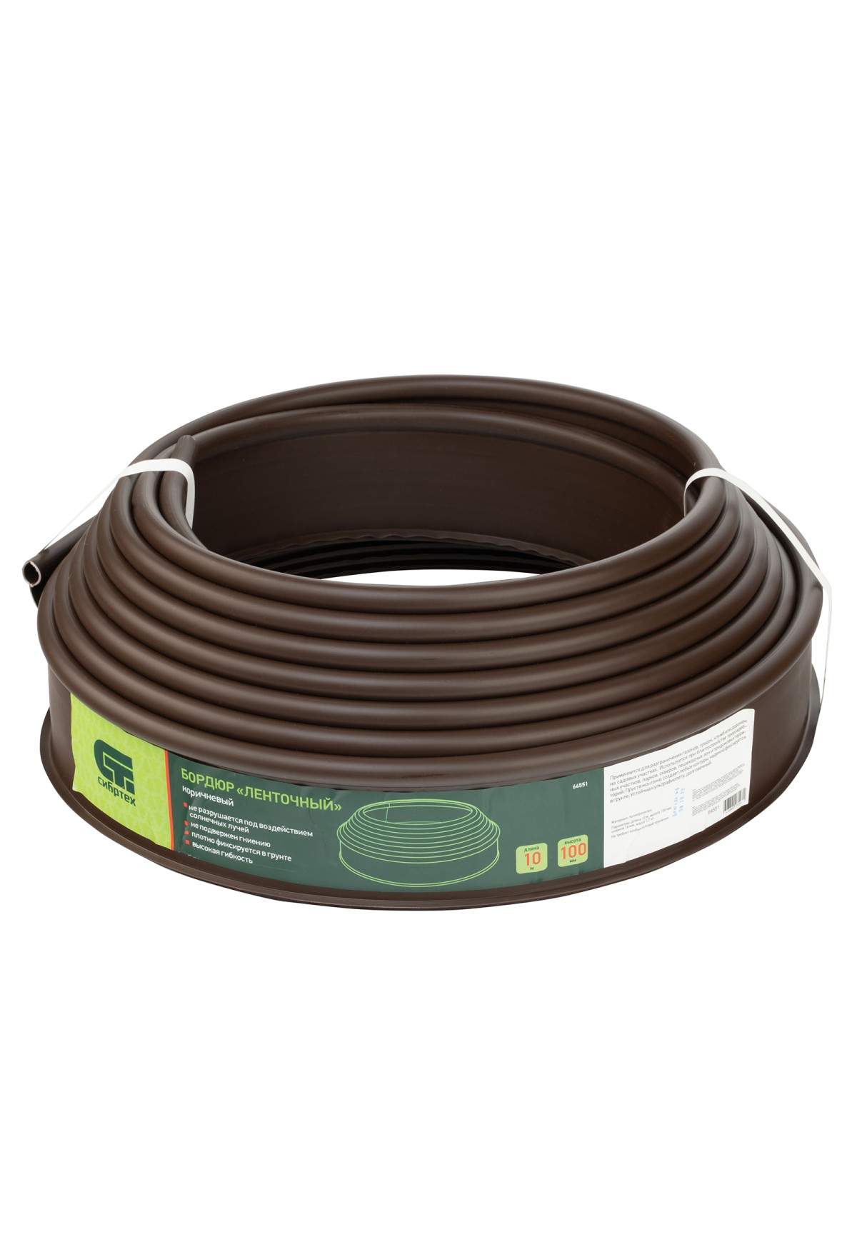 Полиэтиленовый бордюр Сибртех «Лента» 64551 размером 10 х 1000 см, коричневого цвета, предназначен для оформления отдельных участков озелененных территорий. Гибкому ограждению можно придать любую форму, что позволяет подчеркнуть контуры цветников и грядок, защитить грунтовые дорожки от размывания, обозначить границы приствольных кругов деревьев.