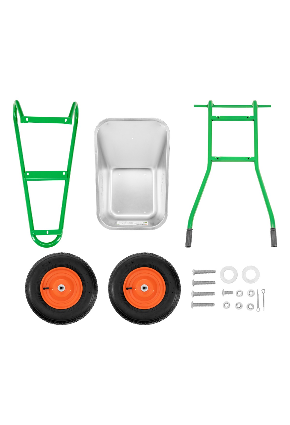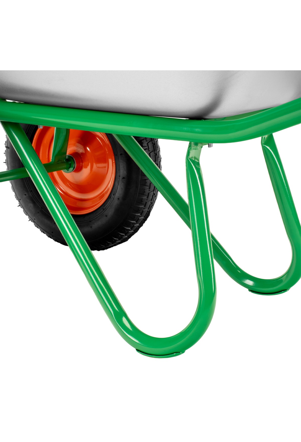 - Надежная конструкция — толщина стенок кузова составляет 0,8 мм, а рамы — 1,5 мм, что обеспечивает увеличенную грузоподъемность тачки.