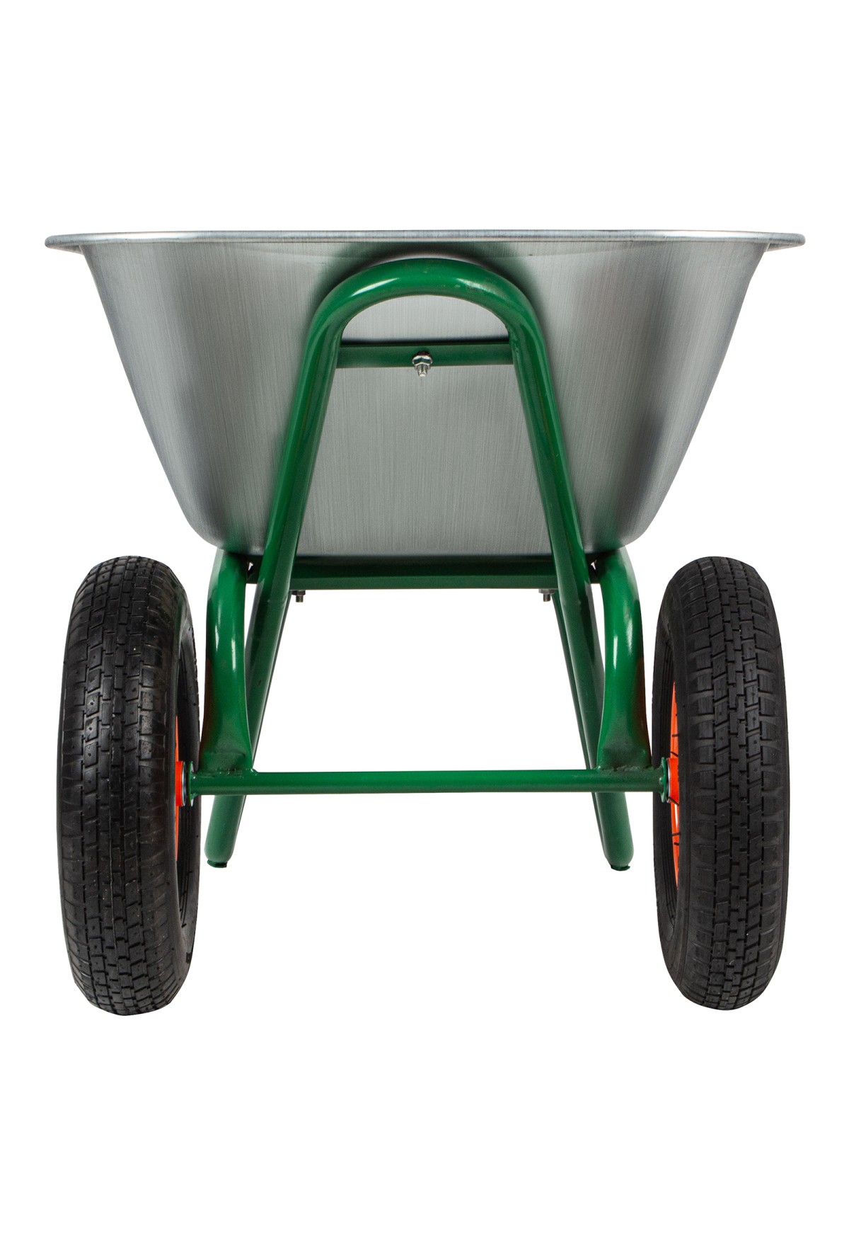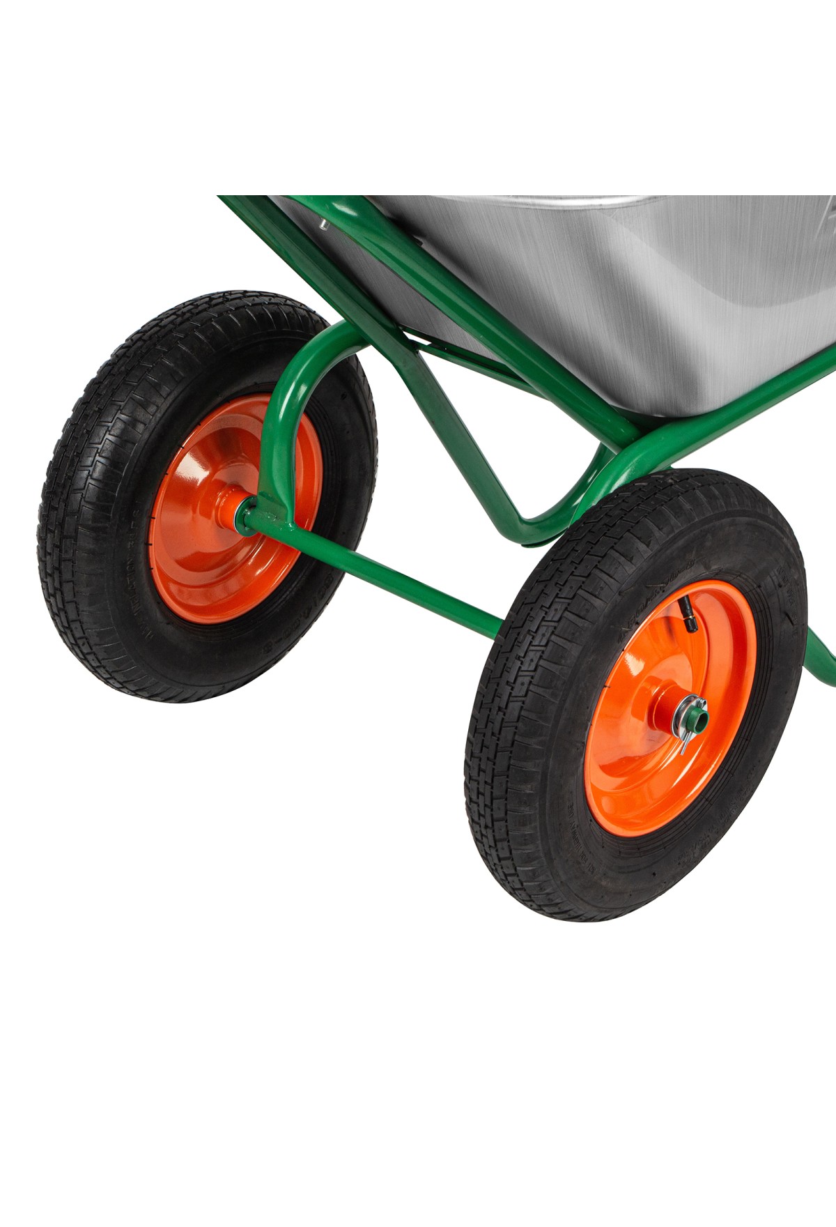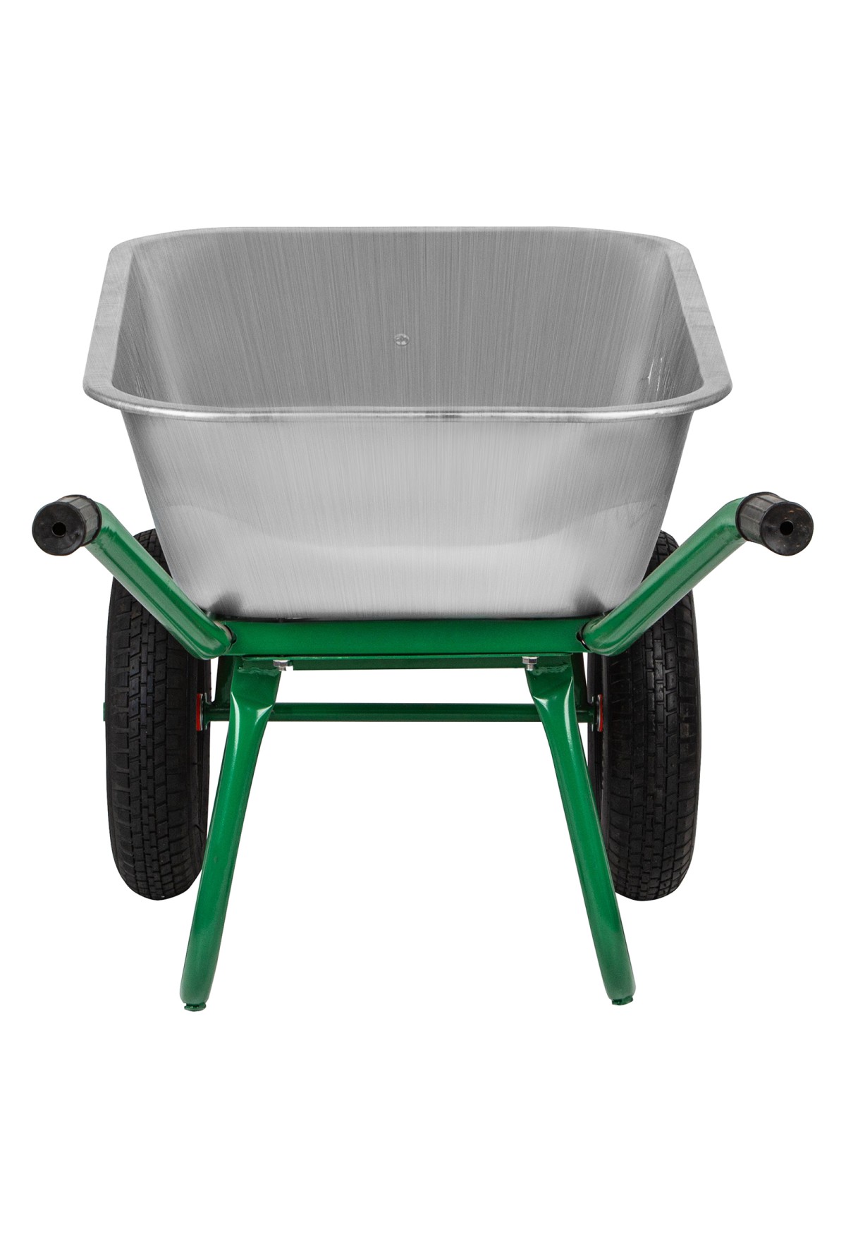 - Увеличенная грузоподъемность — переднюю часть кузова поддерживает дополнительная опора, поэтому тачка выдерживает грузы массой до 320 кг.