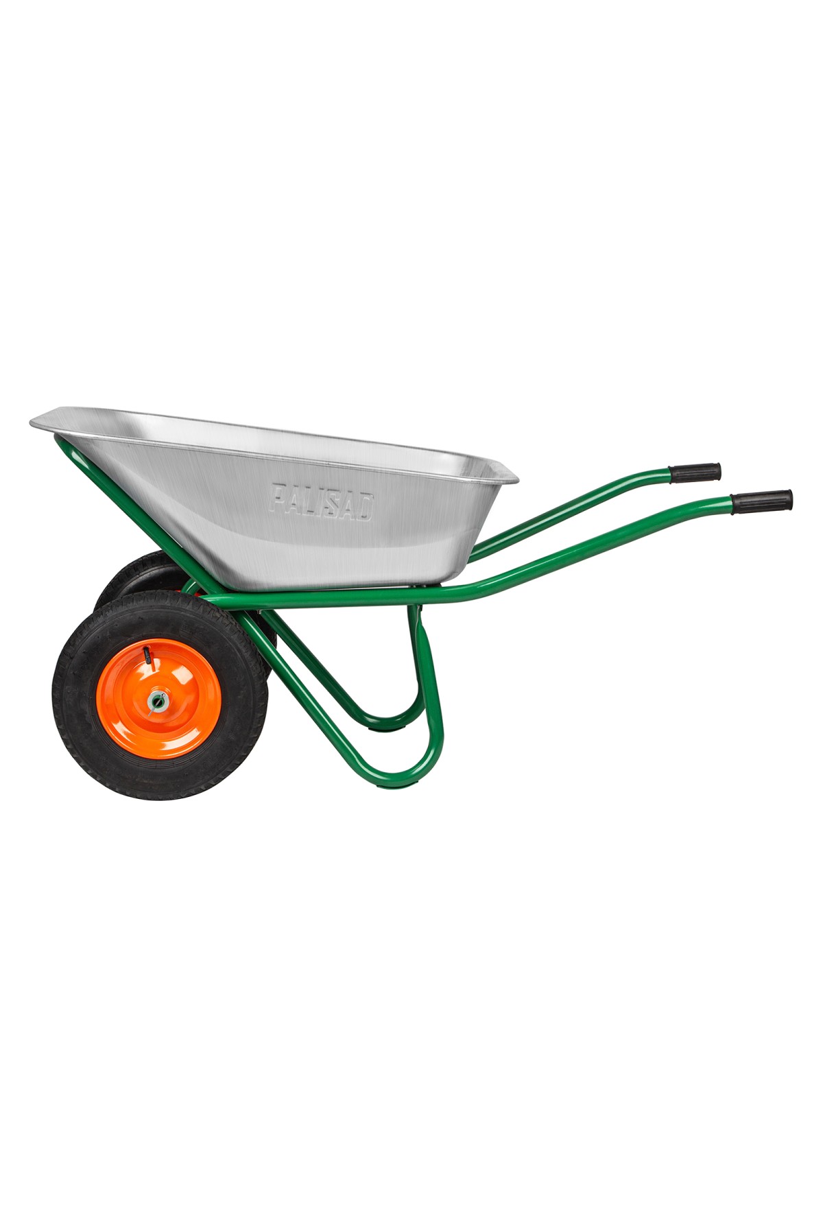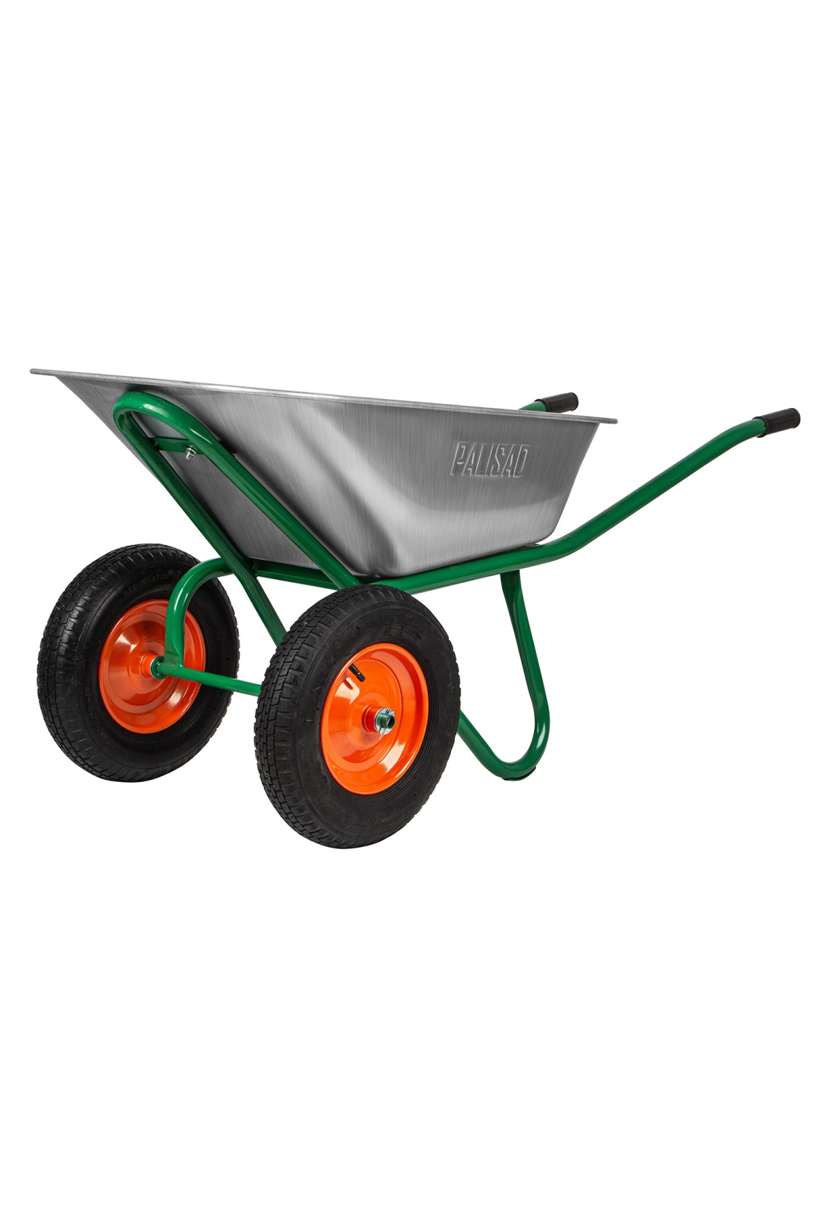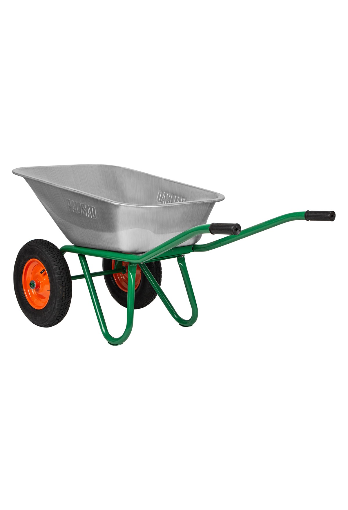 Усиленная садово-строительная тачка Palisad 689860, 2-колесная, грузоподъемностью 320 кг и объемом корыта 100 л, будет полезна во время строительства или ухода за дачным участком. Ее используют для перемещения мусора, веток, листьев, грунта, щебня, песка, а также строительных смесей. Необходимая грузоподъемность достигается благодаря стальной раме с толщиной стенок 1,2 мм и кузову со стенками толщиной 0,7 мм. 2 колеса увеличивают устойчивость тачки. Шарикоподшипники облегчают вращение колес, поэтому тачку легко перемещать по неровной поверхности.