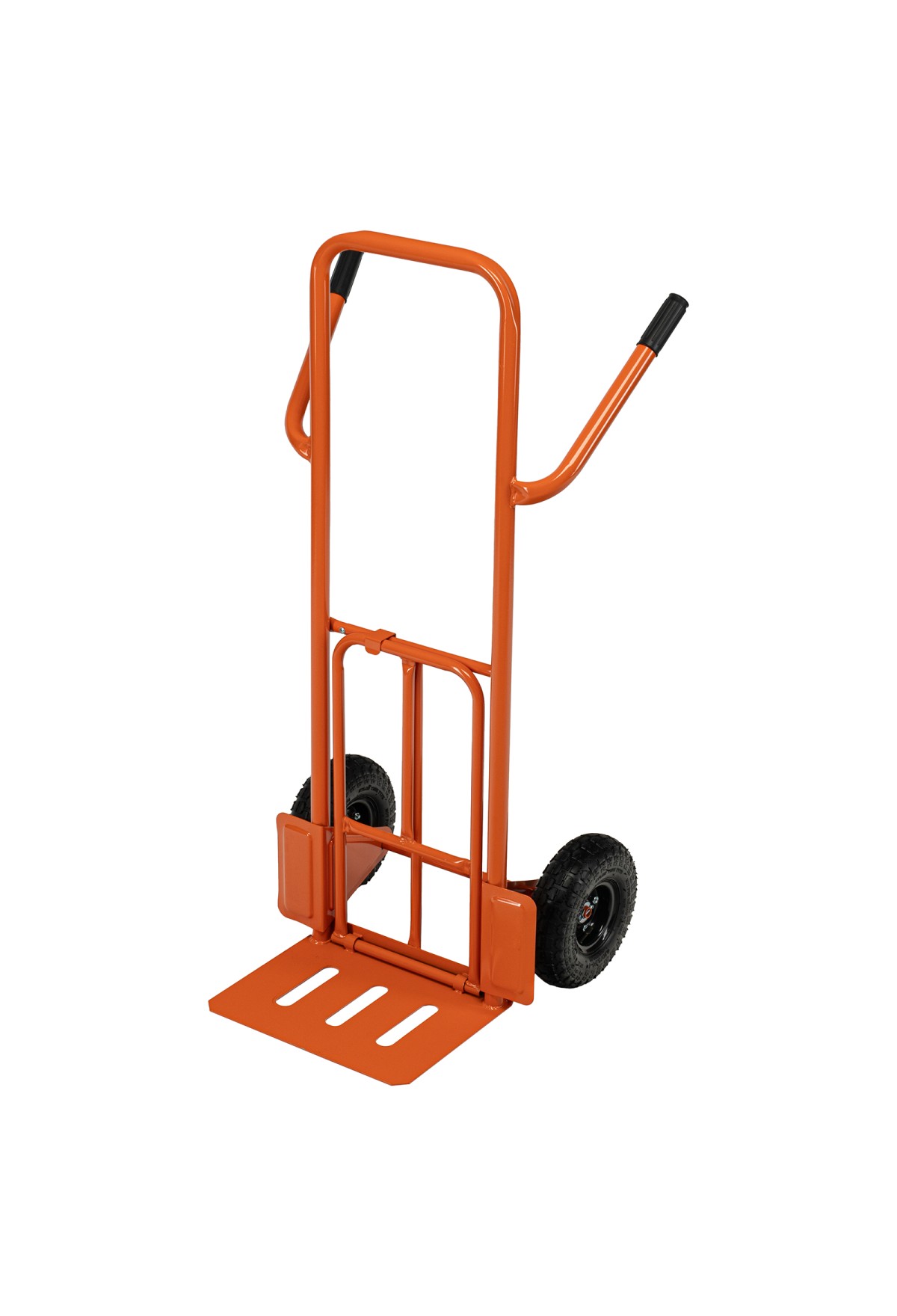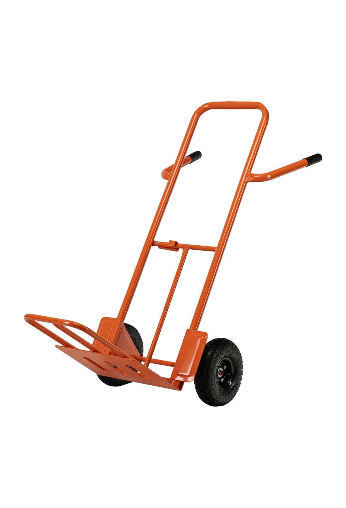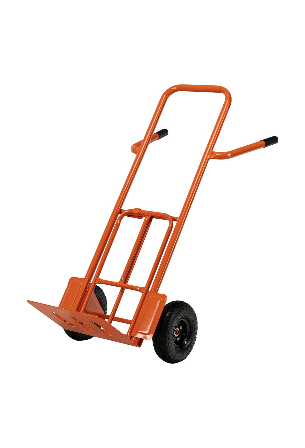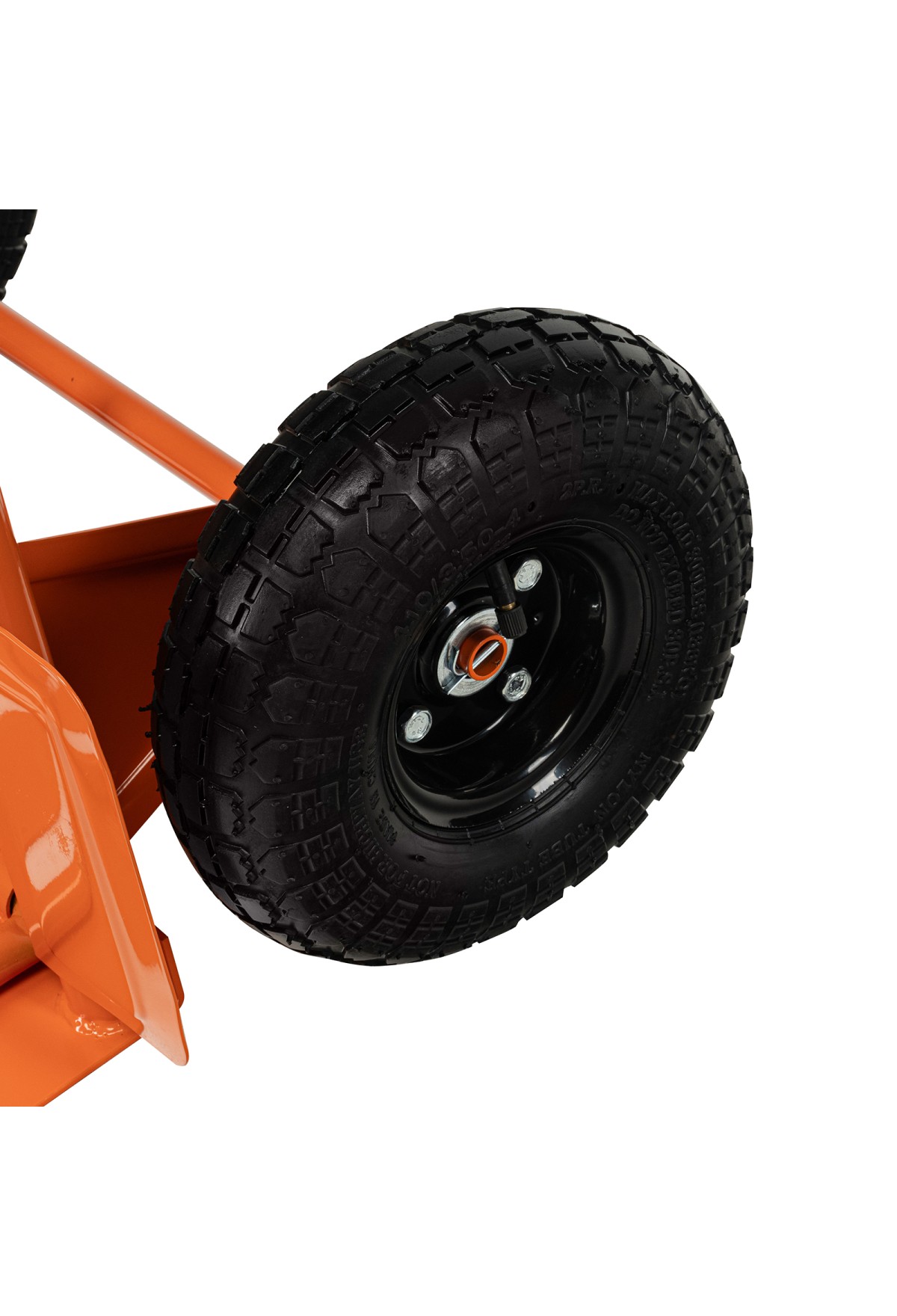 - Удобная транспортировка груза — пневматические колеса с камерами, резиновыми шинами и 2 шарикоподшипниками в каждом гасят вибрации и обеспечивают плавность хода.