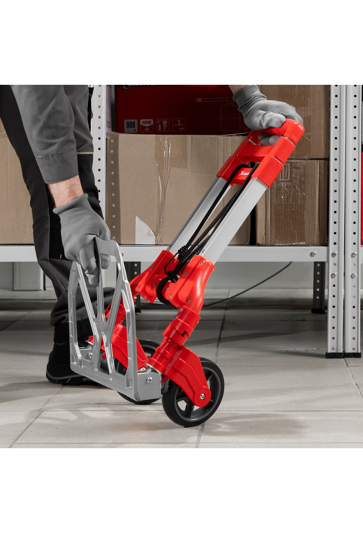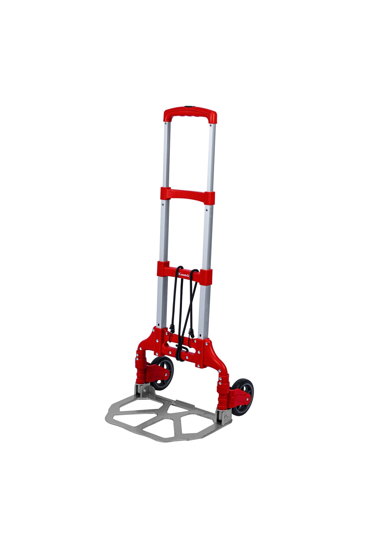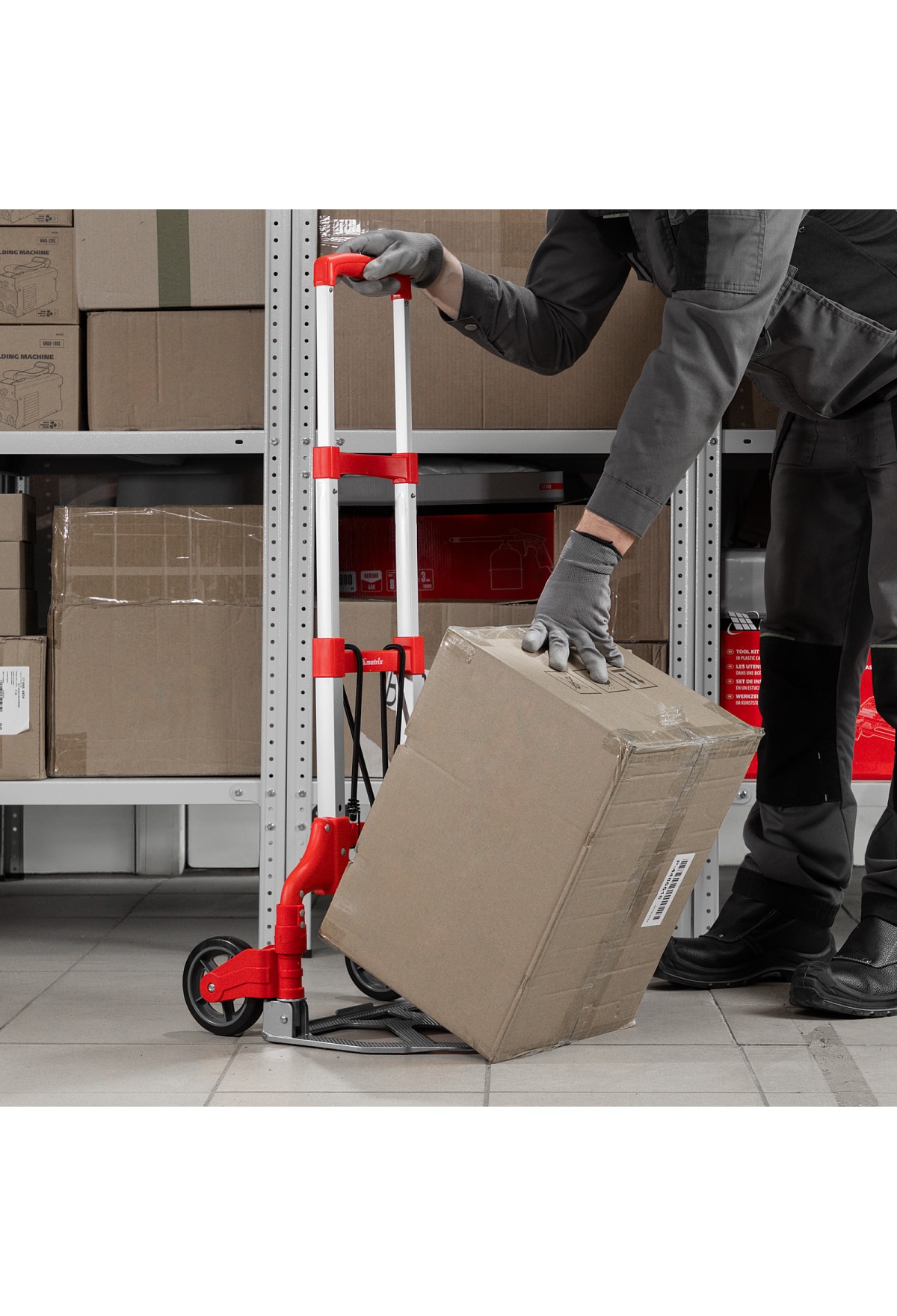 - Удобное хранение и транспортировка — платформа и колеса складываются, поэтому тележка не занимает много места.