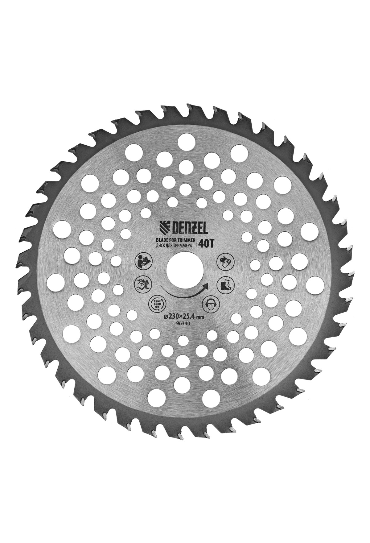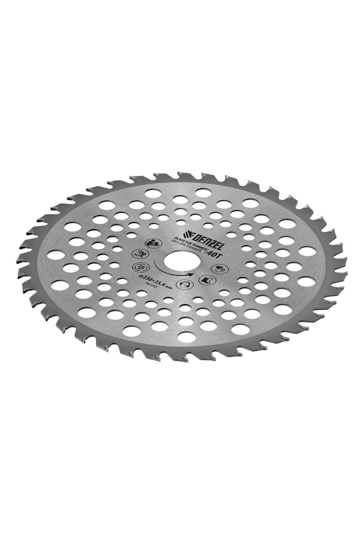 Диск для триммера Denzel 96340 размером 230 х 25,4 мм, толщиной 1,3 мм, с 40 зубьями, предназначен для скашивания травы всех типов, в том числе травы с жесткими древовидными стеблями (полыни, крапивы, лебеды, борщевика), а также кустарника и молодых побегов деревьев с диаметром стволов до 10 мм. Рекомендован к использованию со всеми типами бензиновых триммеров, а также с электрическими триммерами мощностью не менее 1,2 кВт, например, Denzel 96611 и 96612.