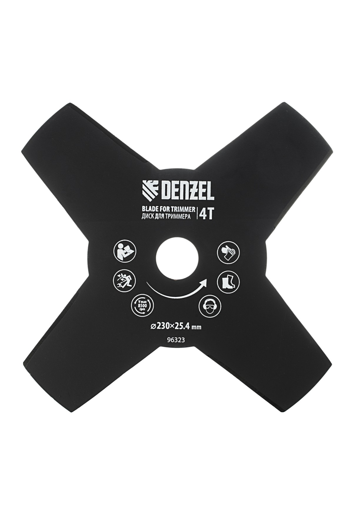 Диск для триммера Denzel 96323 размером 230 х 25,4 мм, толщиной 1,6 мм, с 4 лезвиями, предназначен для скашивания травы различных типов, в том числе с жесткими стеблями (полыни, крапивы, лебеды). Рекомендован к использованию со всеми типами бензиновых триммеров, а также с электрическими триммерами мощностью не менее 1,0 кВт, например Denzel 96611 и 96612.