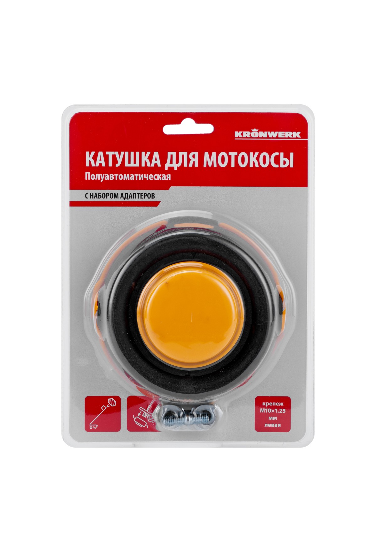 Катушка для триммера Kronwerk 96354 с креплением M10 с шагом 1,25 мм и левой резьбой — сменный элемент для бензиновых и электрических моделей. В качестве режущего элемента используется прочная нейлоновая леска диаметром до 3 мм. Подходящее сечение лески: круг, звезда, треугольник, квадрат, клевер или другое. Катушка поставляется с гайками M8 с правой и левой резьбой, а также адаптером M8.