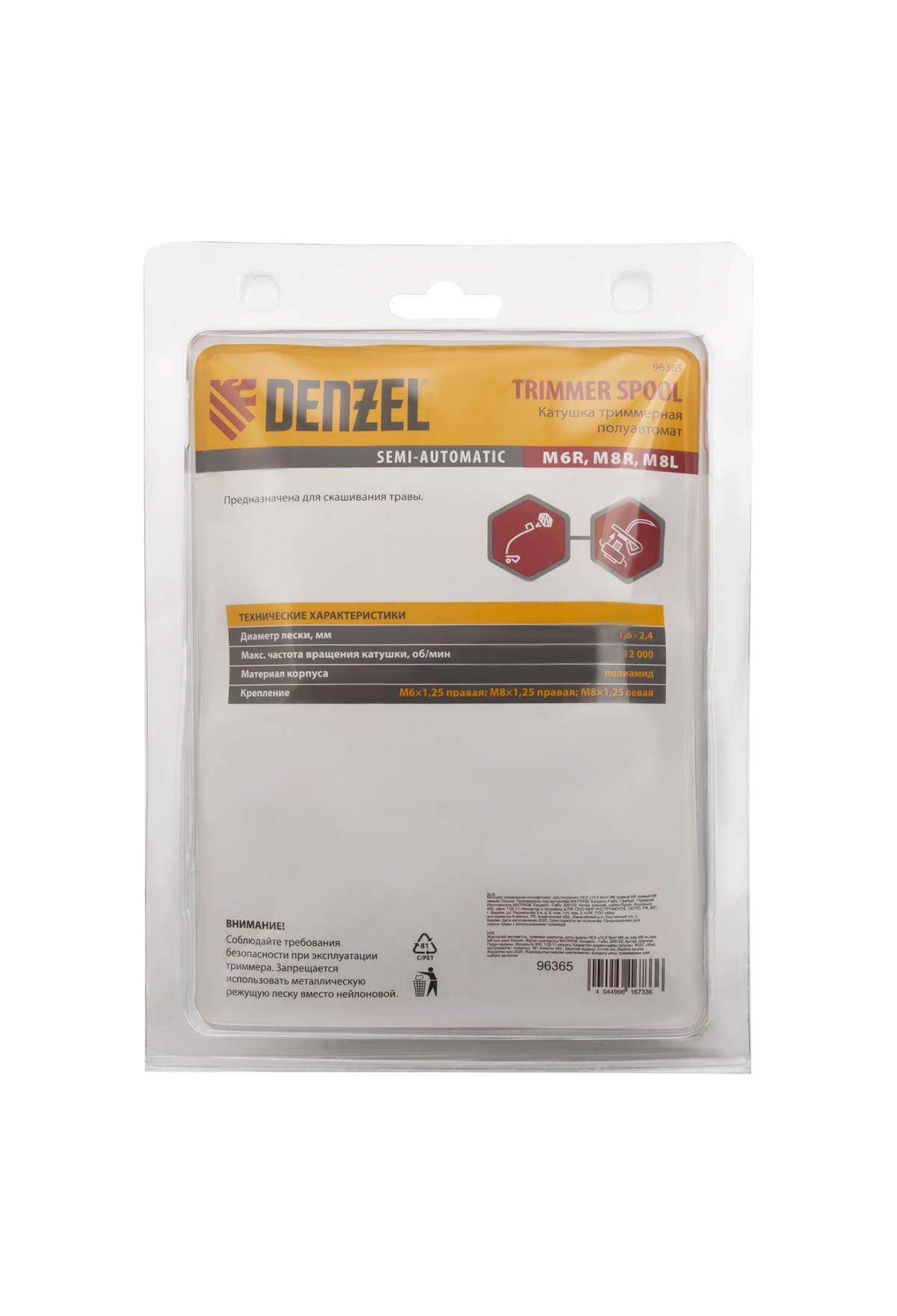 Полуавтоматическая катушка для триммера Denzel 96365 устанавливается на любые марки электрических и бензиновых кос с креплением на оси НЕХ х 15/6. Режущая леска сечением до 2 мм обеспечивает комфортное скашивание молодой травы на приусадебном участке.