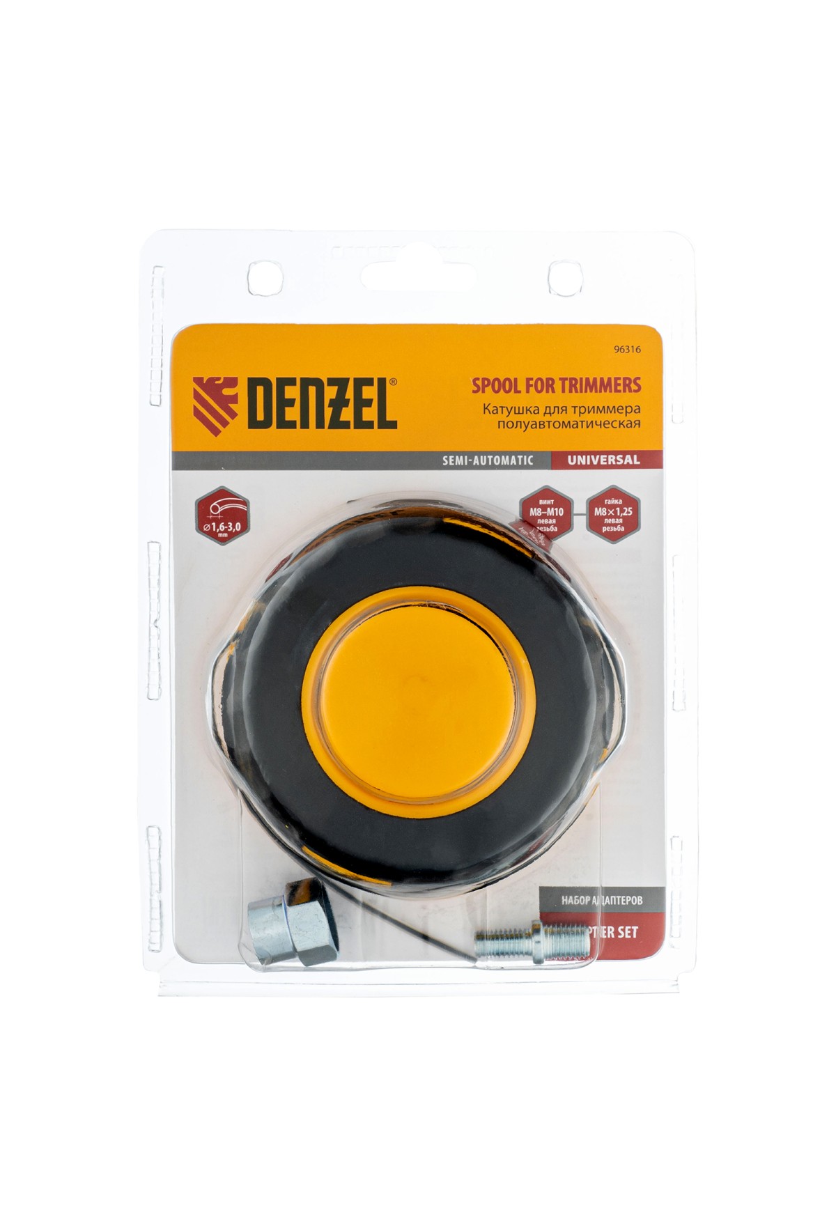 Технические характеристики Катушка универсальная триммерная, гайка М10 х 1.25, гайка М8, винт М8-М10, левая резьба, шаг 1.25 мм Denzel