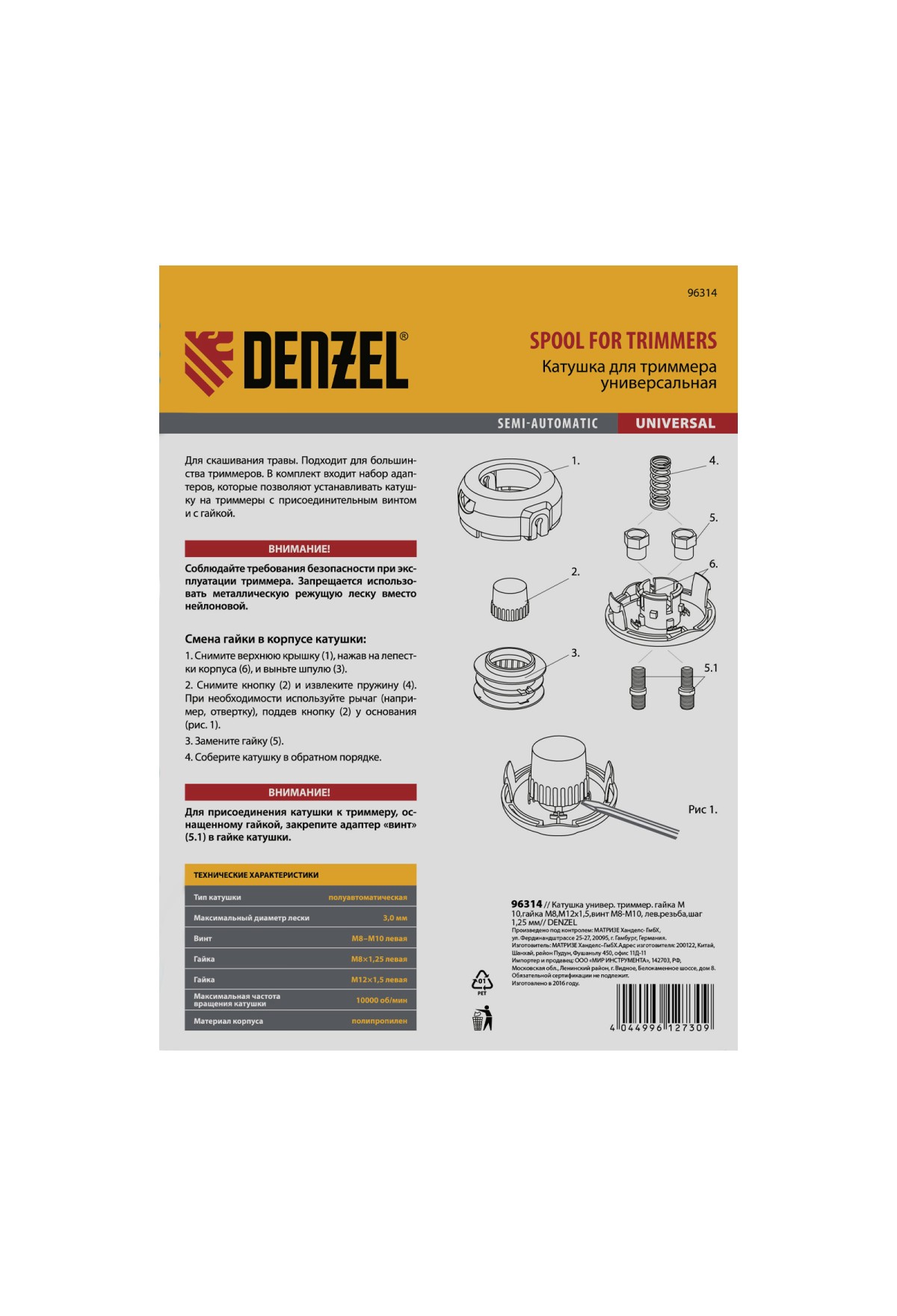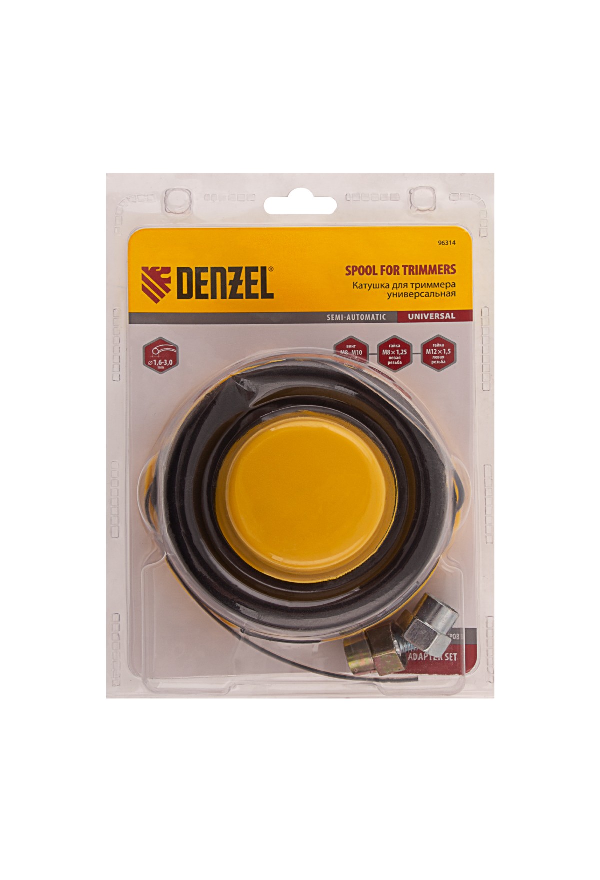 Технические характеристики Катушка универсальная триммерная, гайка М10 х 1.25, М8, М12, винт М8-М10, левая резьба, шаг 1.5 мм Denzel