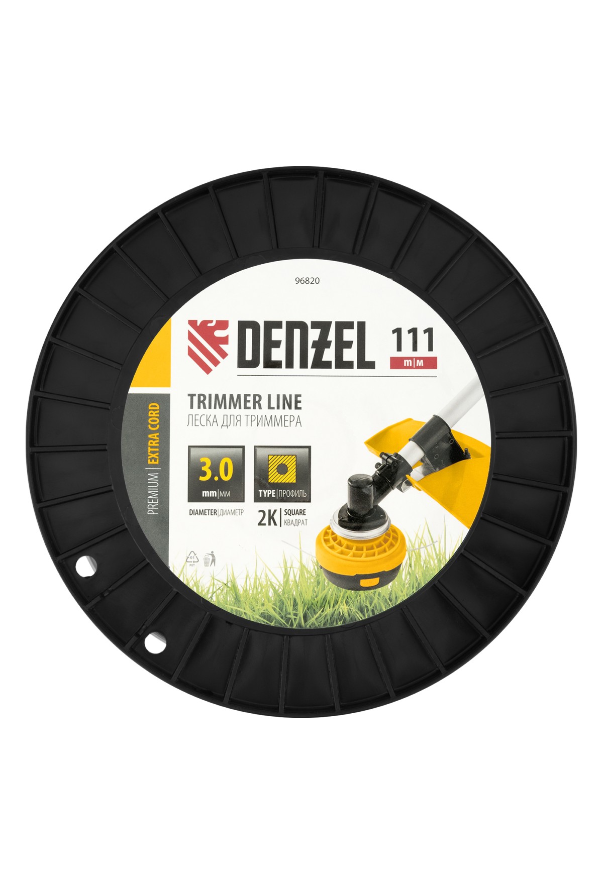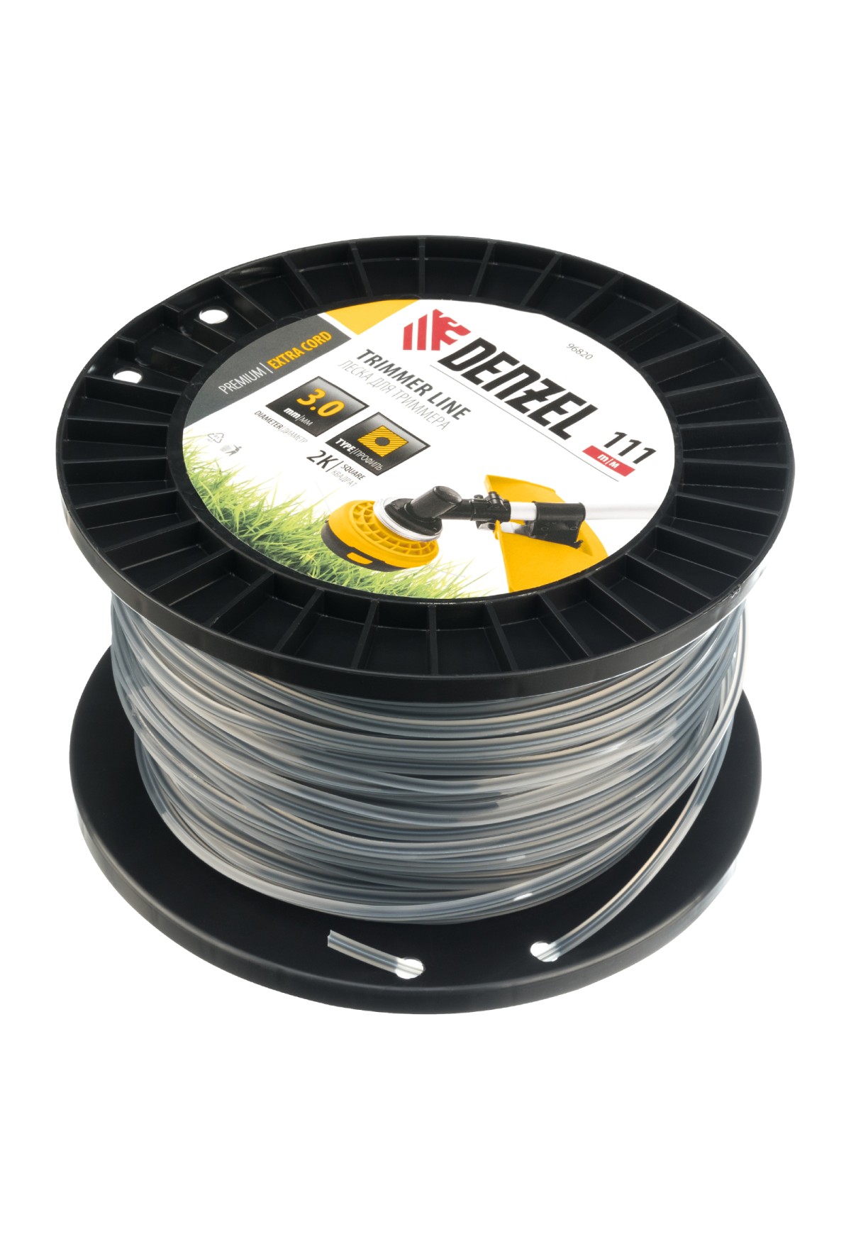 Двухкомпонентная леска для триммера Denzel EXTRA CORD 96820 размером 3,0 мм х 111 м, с сечением «квадрат», на DIN-катушке, используется для скашивания густых зарослей травы и сорных растений на дачном участке и придомовой территории. Заправляется в катушку бензокос с объемом двигателя 25-52 см3. Благодаря острым граням леска успешно справляется с толстыми, жесткими стеблями, позволяя быстро обработать участок большой площади.