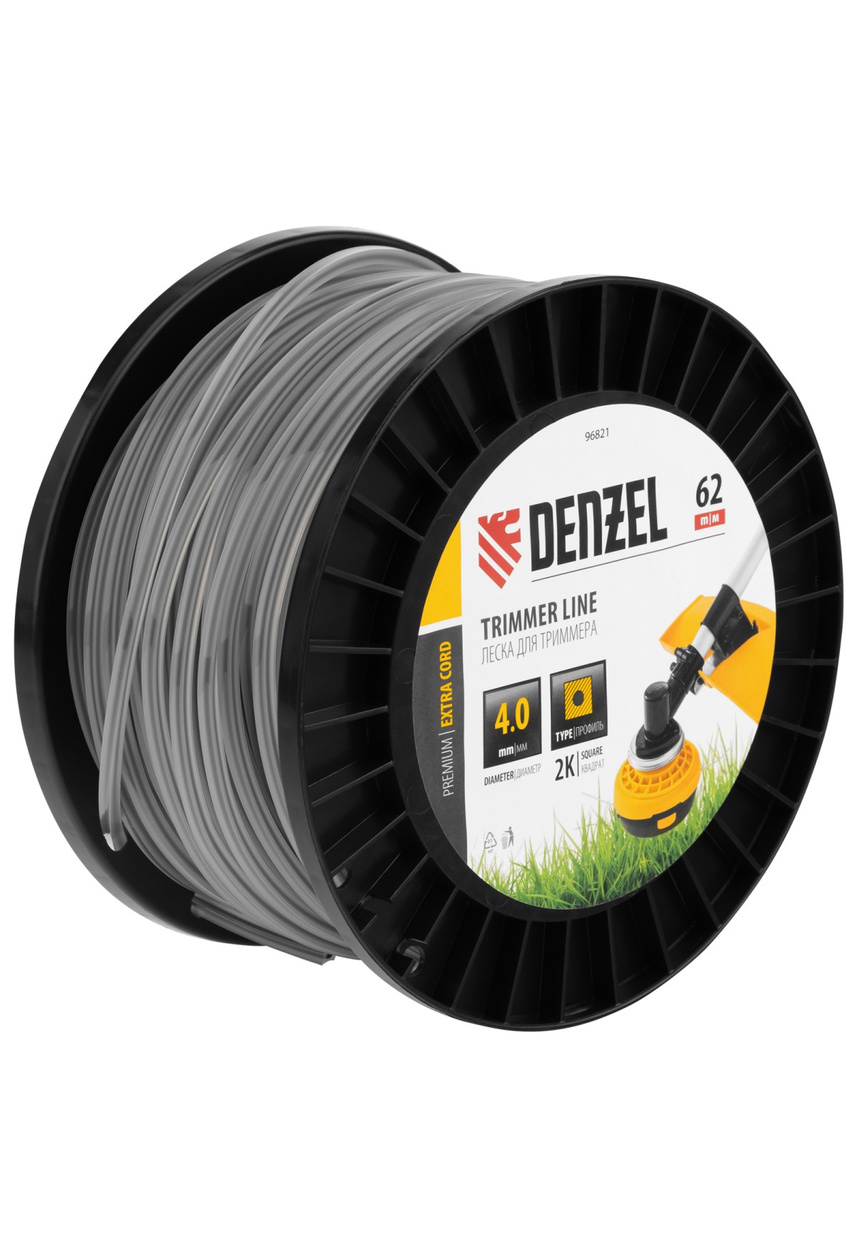 Двухкомпонентная леска для триммера Denzel EXTRA CORD 96821 размером 4,0 мм х 62 м, с сечением «квадрат», на DIN-катушке, используется для скашивания густых зарослей травы и сорных растений на дачном участке и придомовой территории. Заправляется в катушку мощных бензотриммеров. Благодаря острым граням леска успешно справляется с толстыми, жесткими стеблями, позволяя быстро обработать участок большой площади.