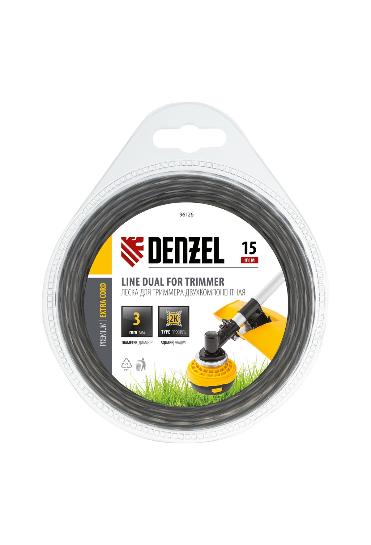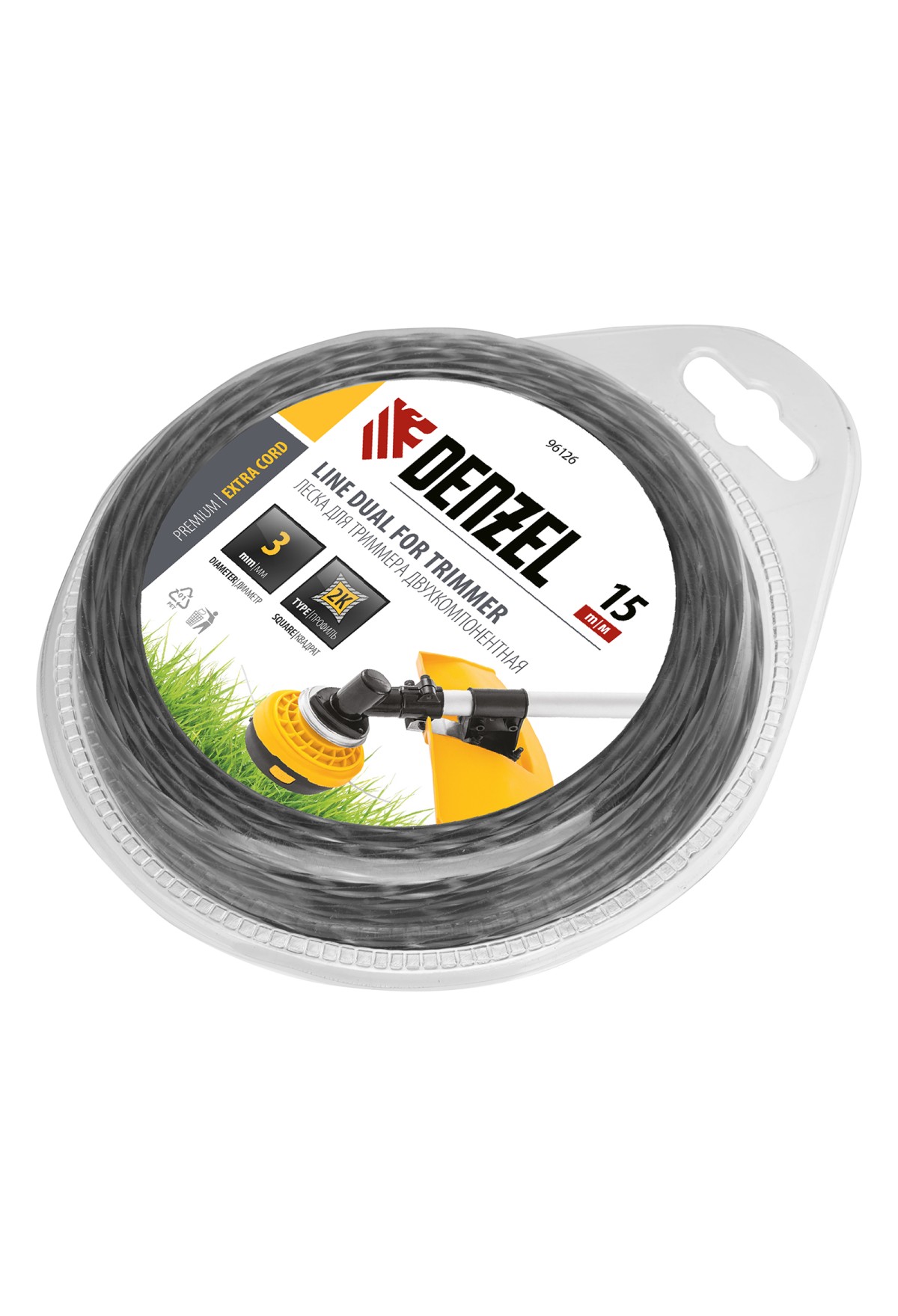 Двухкомпонентная леска Denzel Extra cord 96126 размером 3 мм х 15 м, с квадратным сечением, предназначена для использования с высокопроизводительными бензотриммерами мощностью не менее 1500 Вт. Благодаря наличию высокопрочного сердечника рабочий ресурс корда увеличен на 40% по сравнению с однокомпонентными лесками. Леска идеально подходит для срезания сухостоя, травы любой жесткости, небольших кустарников и бурьяна на участках любой сложности.
