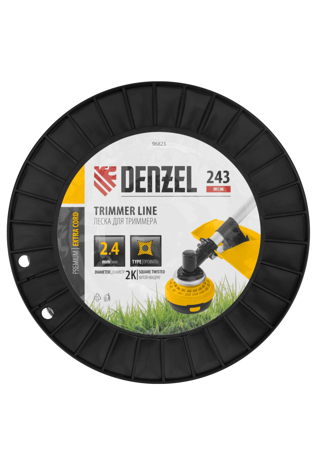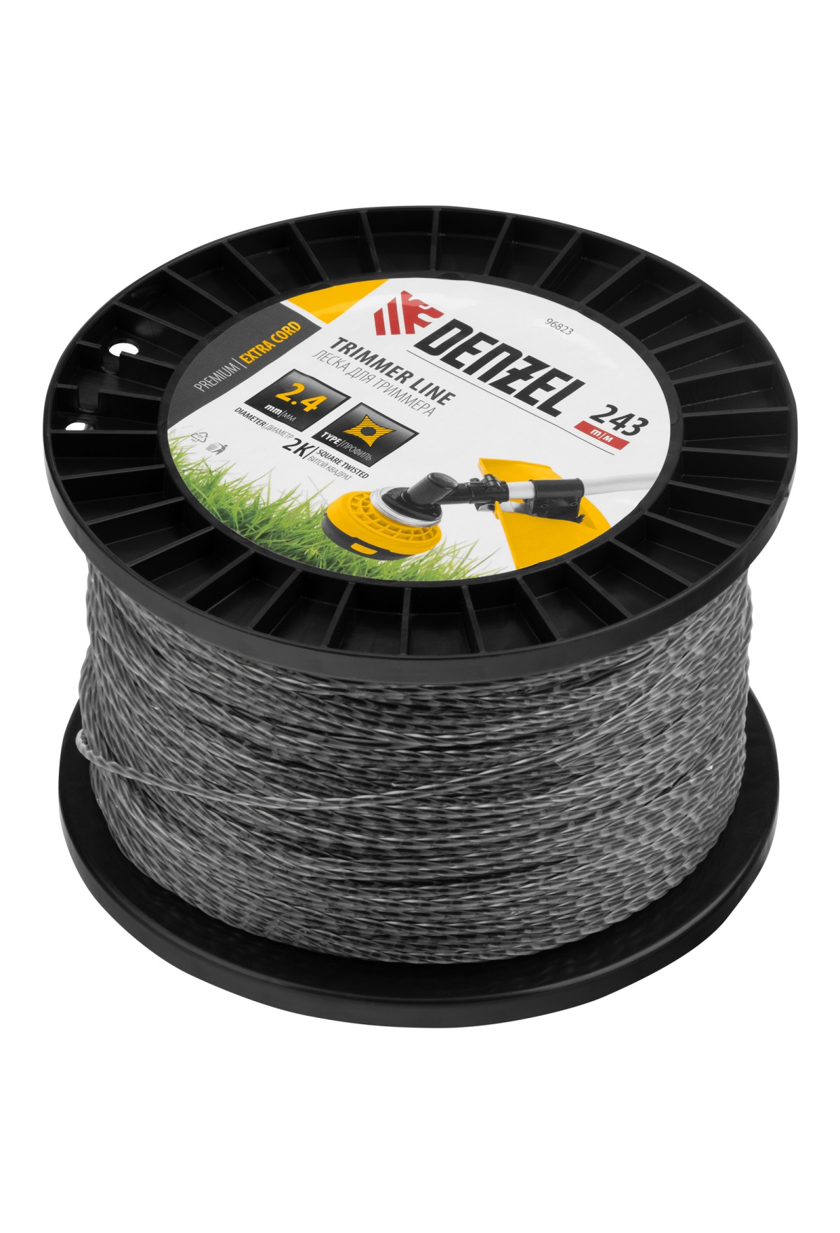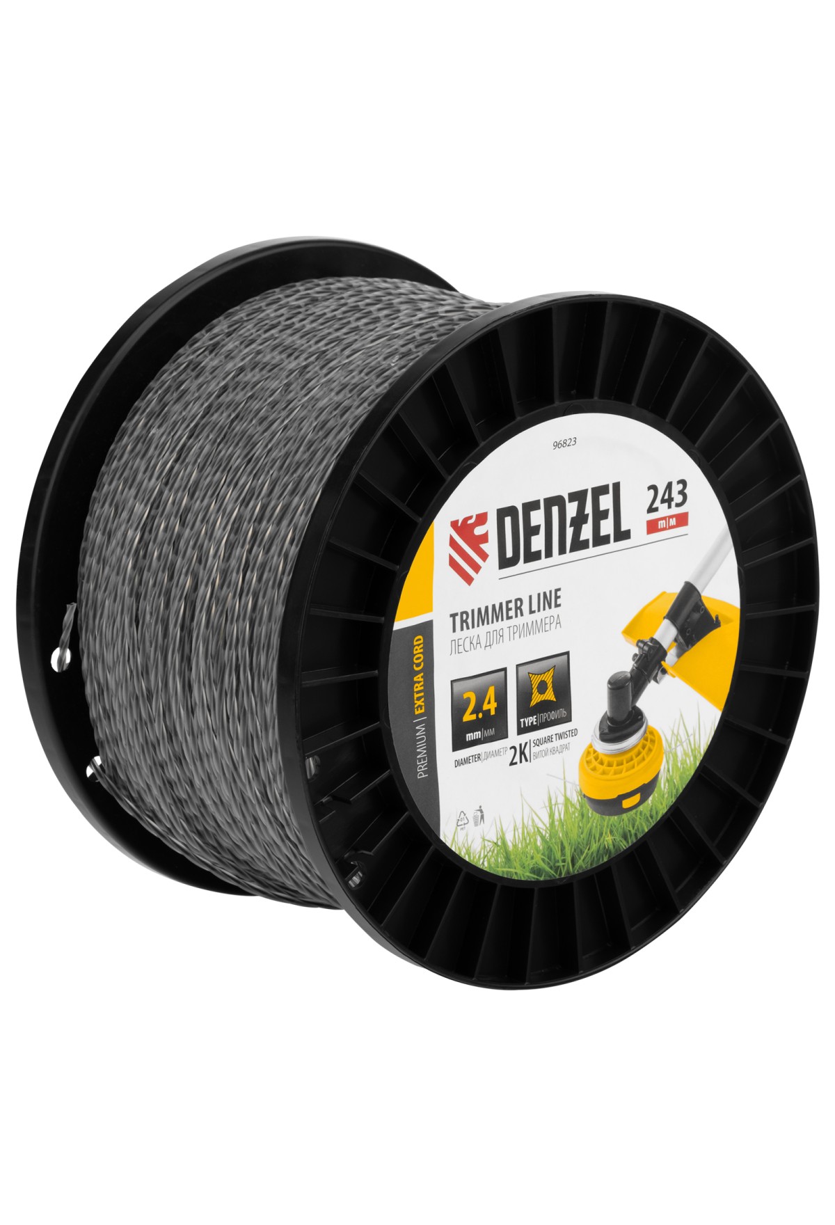 Двухкомпонентная леска для триммера Denzel EXTRA CORD 96823 размером 2,4 мм х 243 м, с сечением «витой квадрат», на DIN-катушке, используется для скашивания густых зарослей травы и сорных растений на дачном участке и придомовой территории. Предназначена для электротриммеров и бензокос с объемом двигателя 25-52 см3. Устойчива к излому, что облегчает ее заправку в катушку. Благодаря острым граням леска успешно справляется с толстыми, жесткими стеблями, позволяя быстро обработать участок большой площади.