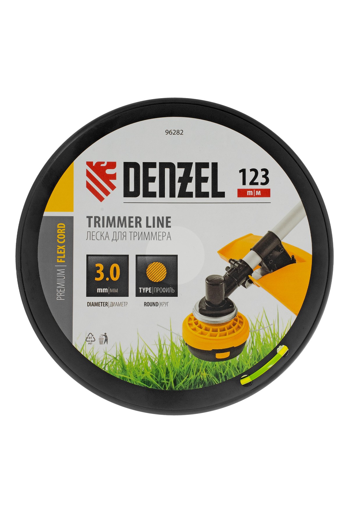 Технические характеристики Леска для триммера круглая, 3,0мм х 123м, на DIN катушке FLEX CORD, Denzel