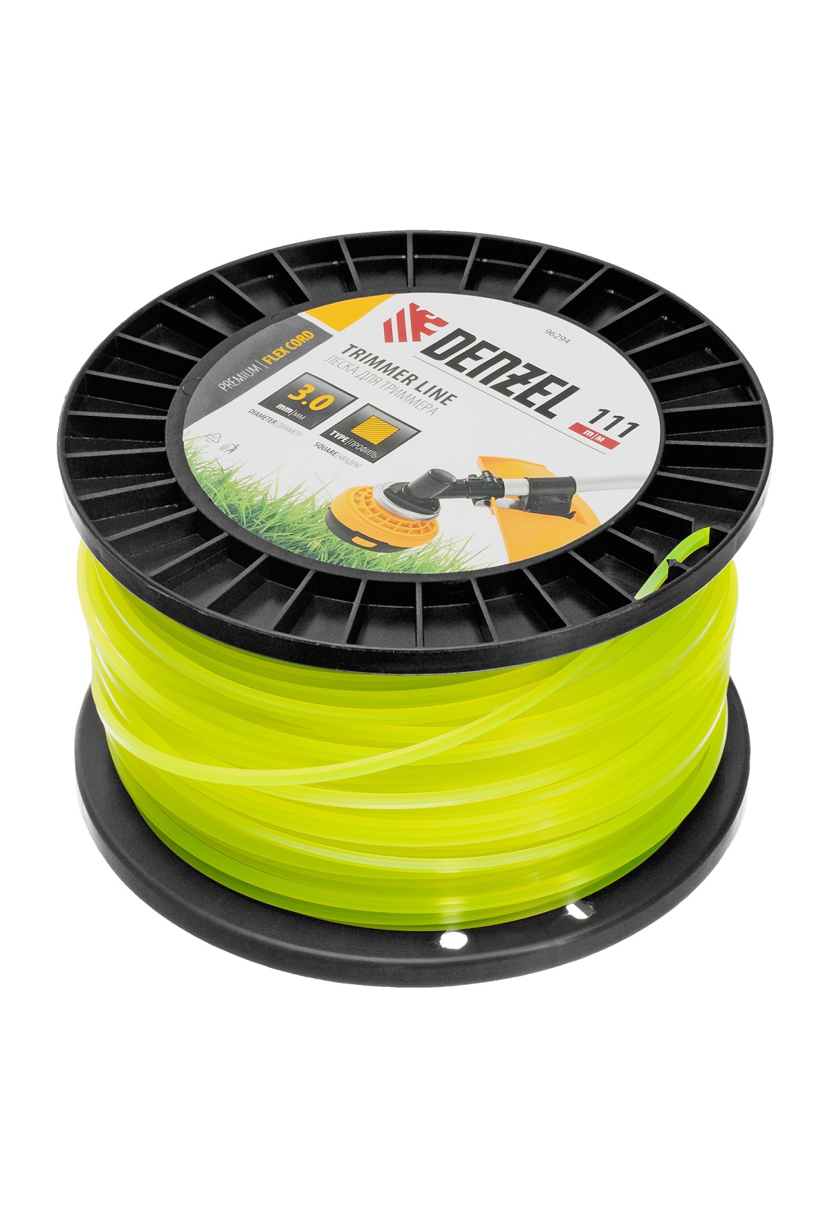 Леска для триммера Denzel FLEX CORD 96294 с сечением «квадрат», толщиной 3,0 мм и длиной 111 м, на DIN-катушке, предназначена для скашивания крупностеблевой растительности. Заправляется в катушку бензотриммеров с объемом двигателя 25-52 см3 и электротриммеров мощностью от 1 до 1,5 кВт.