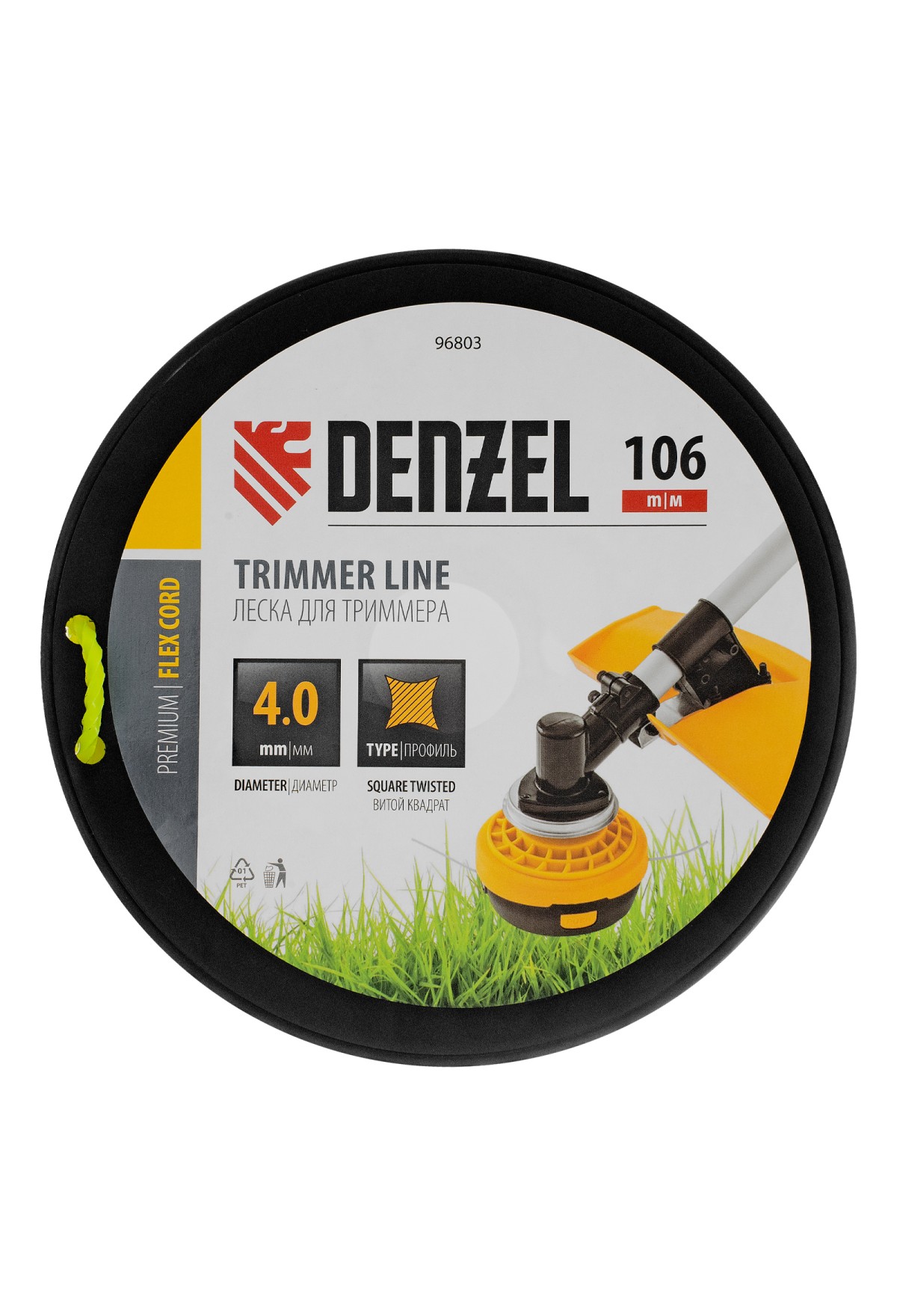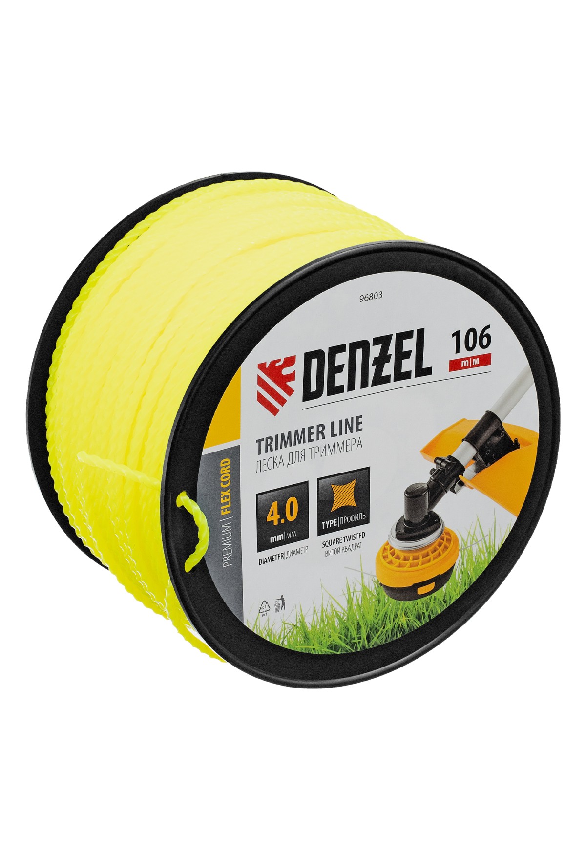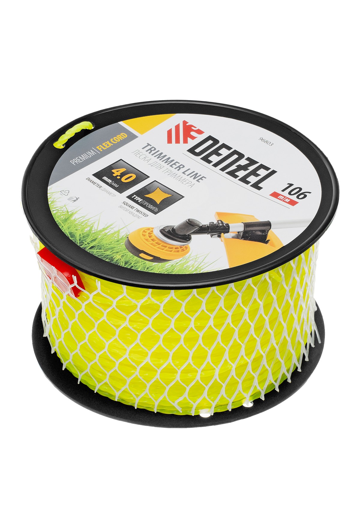 Леска для триммера Denzel FLEX CORD 96803 с сечением «витой квадрат», толщиной 4,0 мм и длиной 106 м, на DIN-катушке, предназначена для скашивания крупностеблевой растительности, сорняков, борщевика. Используется на бензиновых триммерах с объемом двигателя более 52 см3.