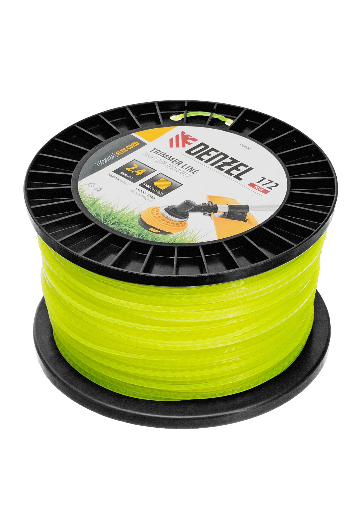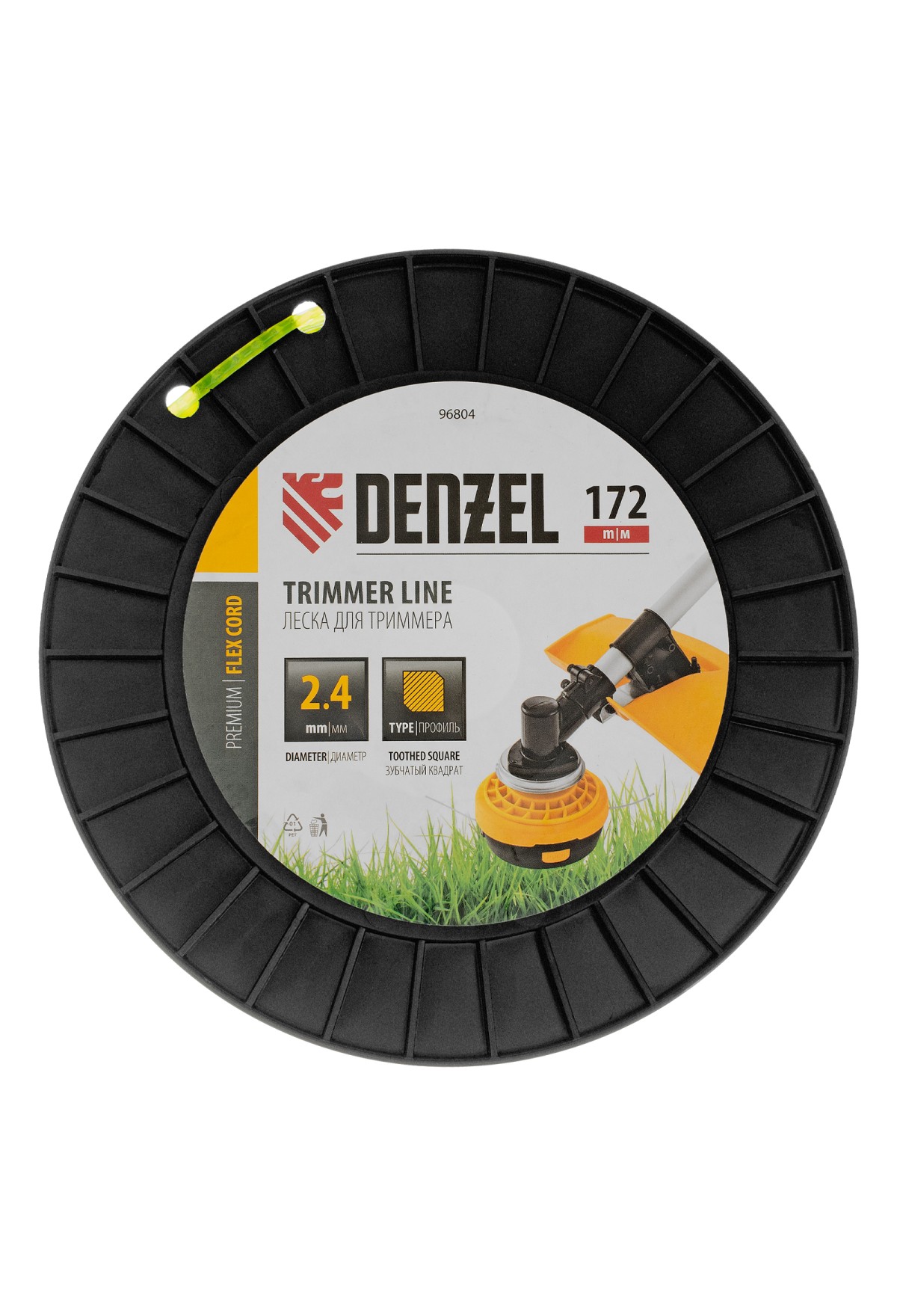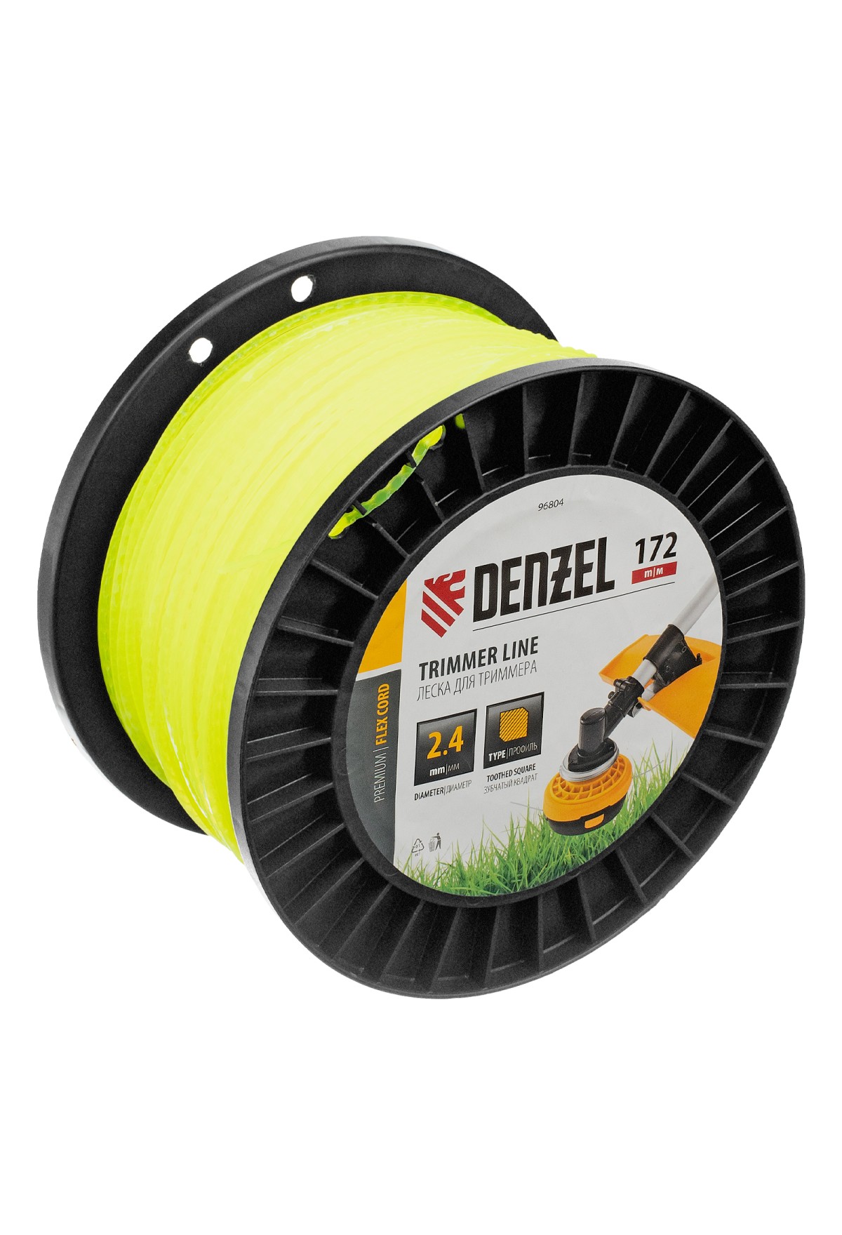 Леска для триммера Denzel FLEX CORD 96804 с сечением «зубчатый квадрат», толщиной 2,4 мм и длиной 172 м, на DIN-катушке, предназначена для скашивания крупностеблевой растительности, бурьяна и молодого кустарника. Заправляется в катушку бензиновых триммеров с объемом двигателя 25-52 см3 и электрических триммеров мощностью от 1 до 1,5 кВт.