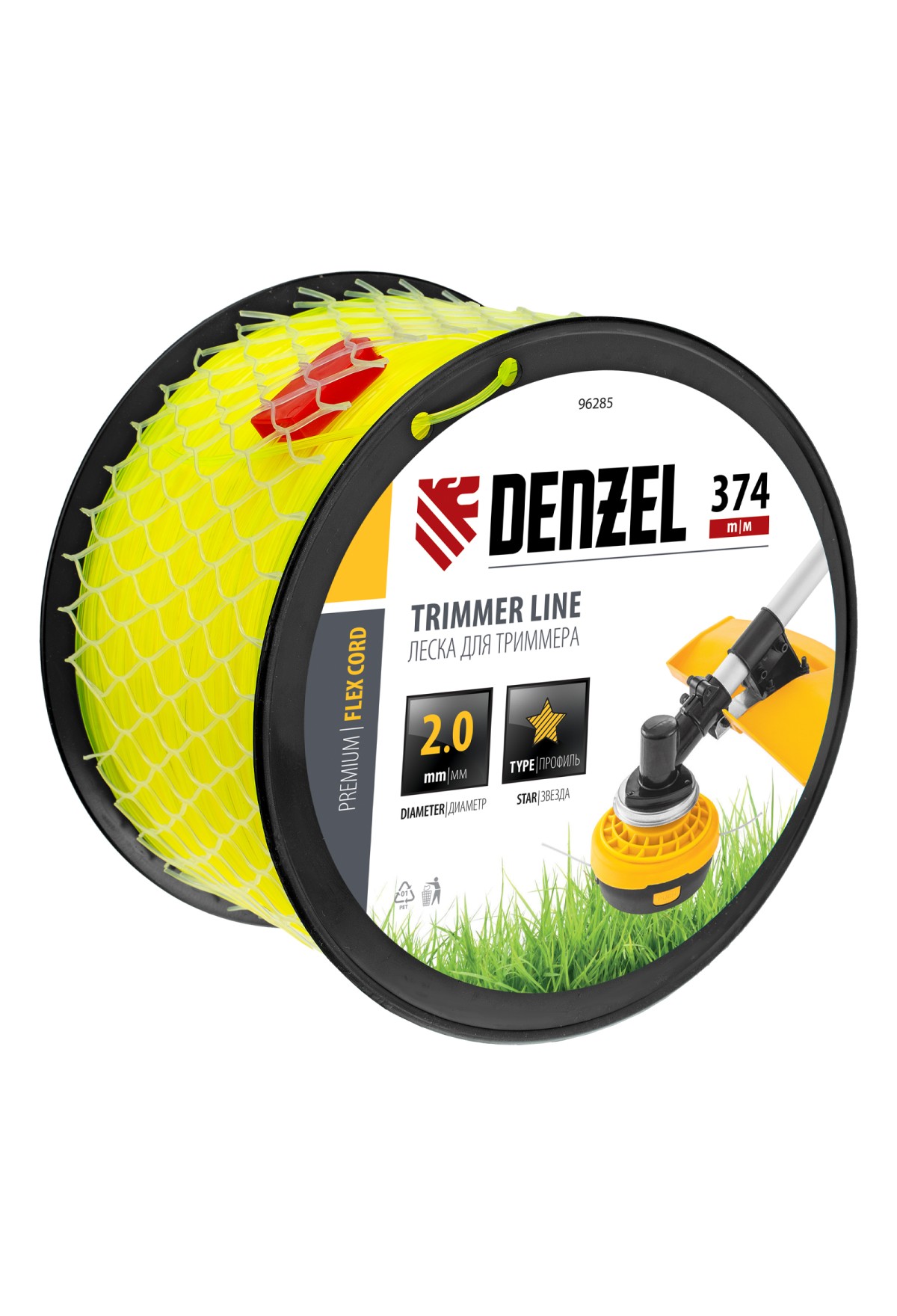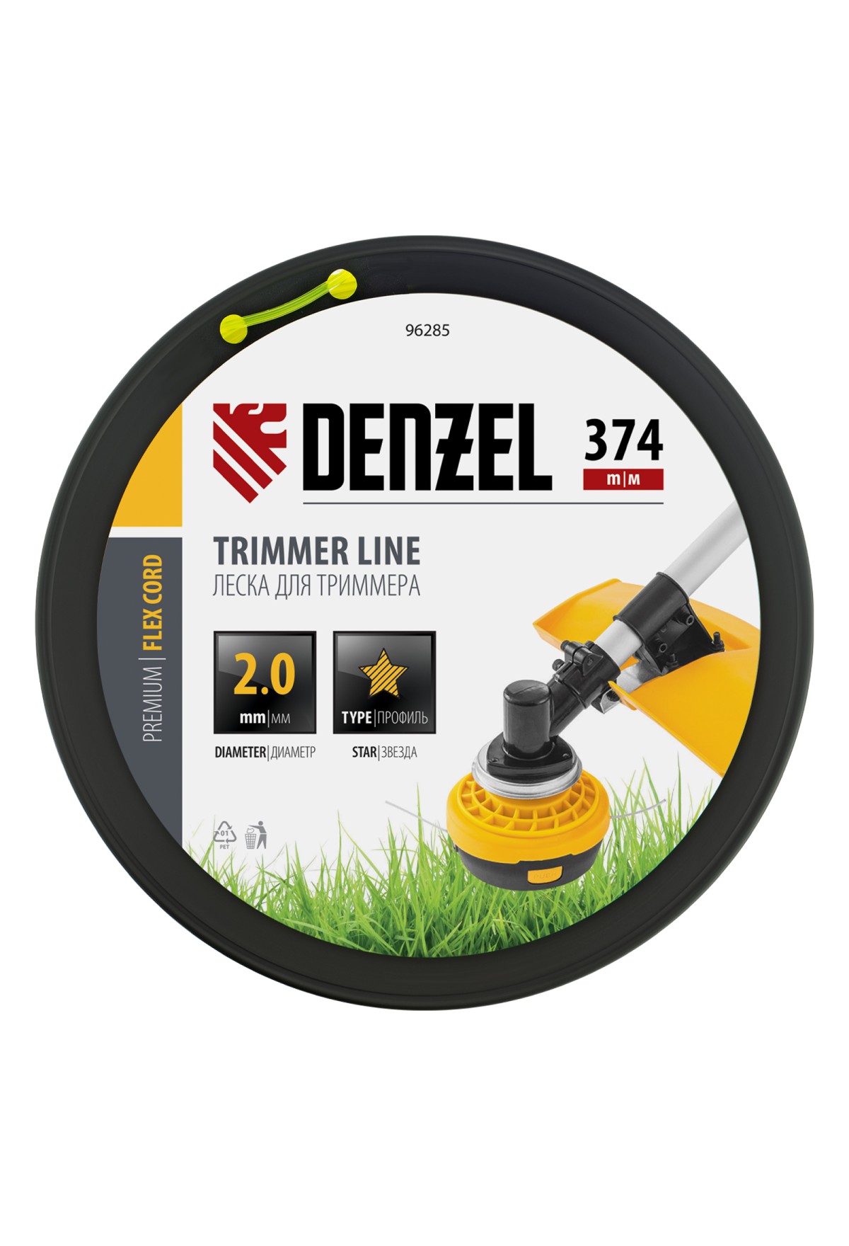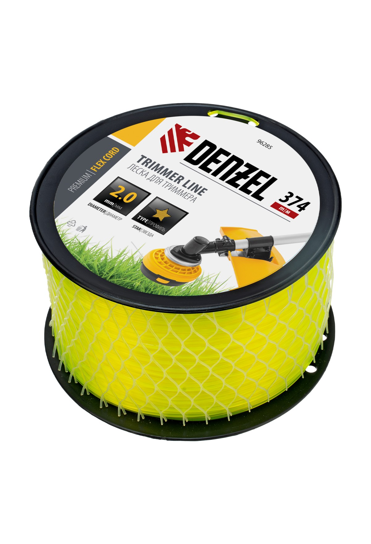 Леска для триммера Denzel FLEX CORD 96285 с сечением «звезда», диаметром 2,0 мм и длиной 374 м, на DIN-катушке, предназначена для скашивания газонной травы, также справляется с крупностеблевой растительностью. Эффективна даже на замусоренной территории. Заправляется в катушку бензотриммеров с объемом двигателя 25-52 см3 и электротриммеров мощностью от 1 до 1,5 кВт.
