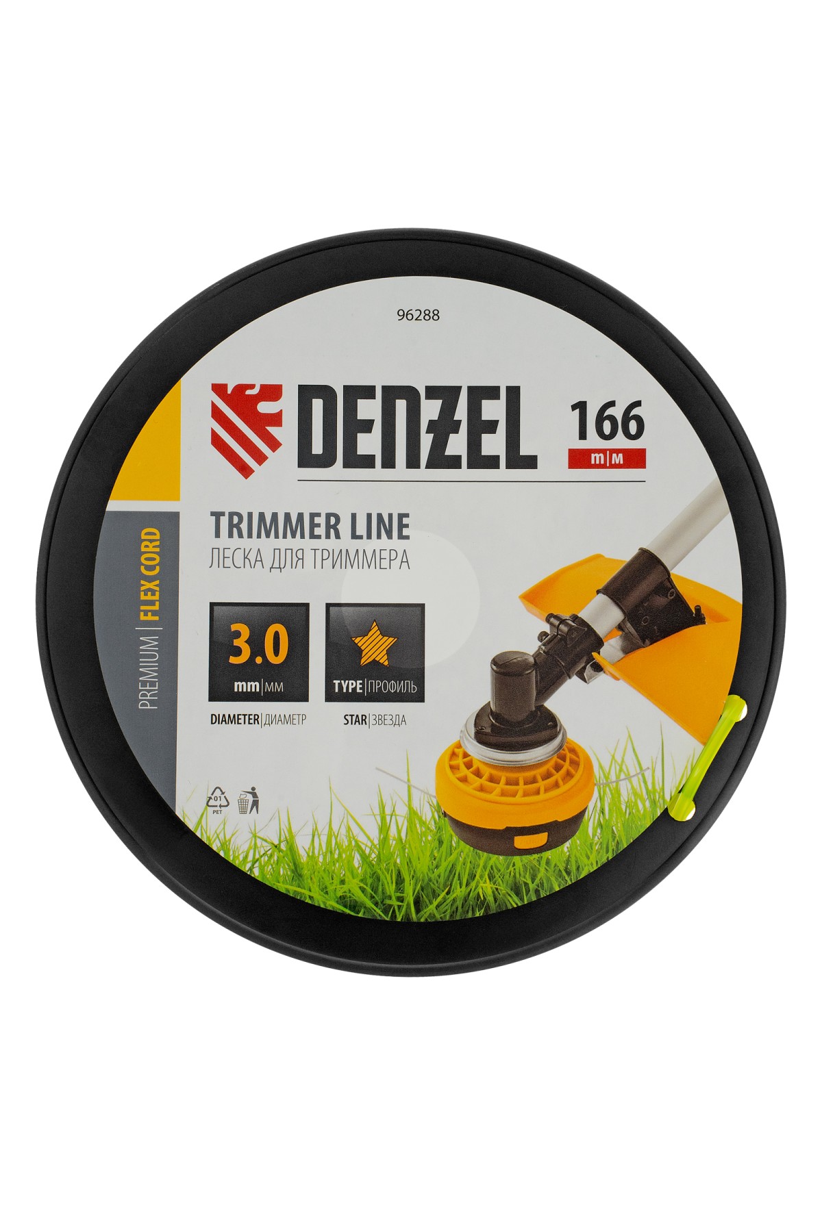 Леска Denzel FLEX CORD 96288 с сечением «звезда», диаметром 3,0 мм и длиной 166 м, на DIN-катушке, предназначена к использованию в бензиновых триммерах с объемом двигателя 25-52 см3. Применяется для ухода за газоном, скашивает даже растительность с жесткими и толстыми стеблями. Пригодится владельцам дачных участков, а также работникам коммунальных служб.