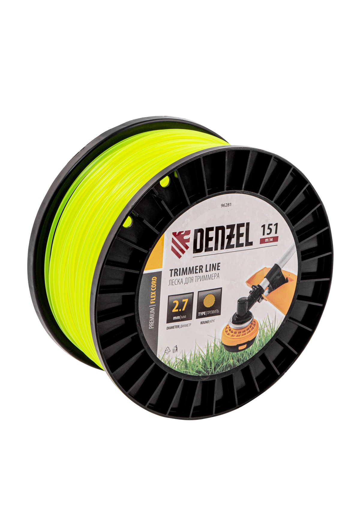 Леска для триммера Denzel FLEX CORD 96281 круглого сечения, диаметром 2,7 мм и длиной 151 м, на DIN-катушке, предназначена для скашивания как мягкой, молодой травы, так и более густой растительности. Подходит для бензиновых триммеров с объемом двигателя 25-52 см3 и электрических триммеров мощностью от 1 до 1,5 кВт.