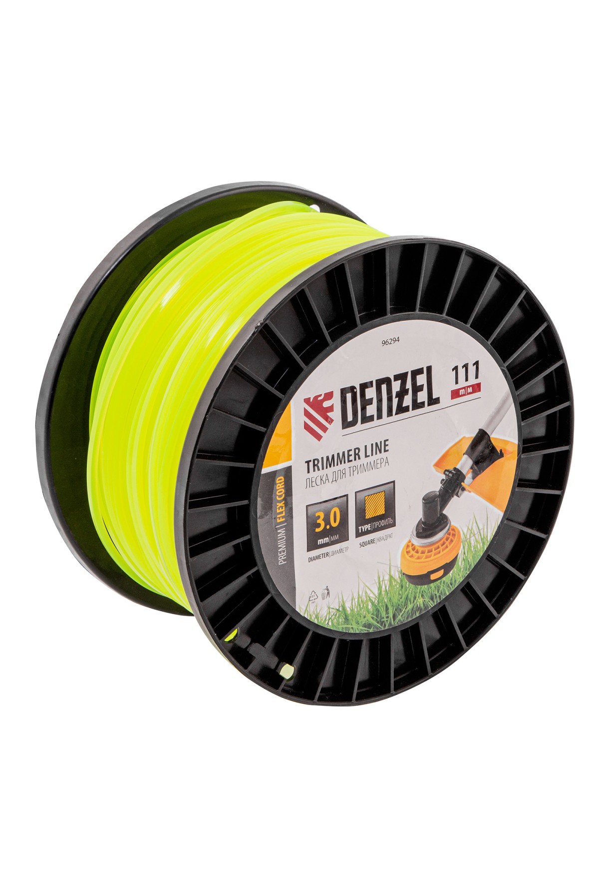 Леска для триммера Denzel FLEX CORD 96294 с сечением «квадрат», толщиной 3,0 мм и длиной 111 м, на DIN-катушке, предназначена для скашивания крупностеблевой растительности. Заправляется в катушку бензотриммеров с объемом двигателя 25-52 см3 и электротриммеров мощностью от 1 до 1,5 кВт.
