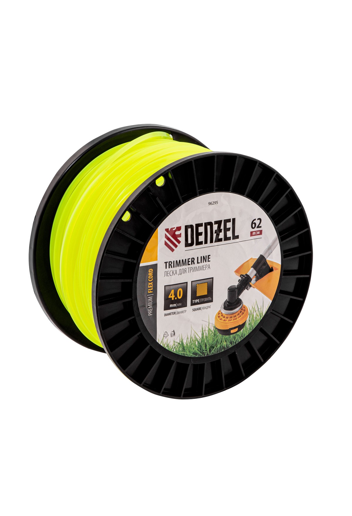 Леска для триммера Denzel FLEX CORD 96295 с сечением «квадрат», толщиной 4,0 мм и длиной 62 м, на DIN-катушке, предназначена для скашивания крупностеблевой растительности, сорняков, борщевика. Заправляется в катушку бензотриммеров с объемом двигателя свыше 52 см3.