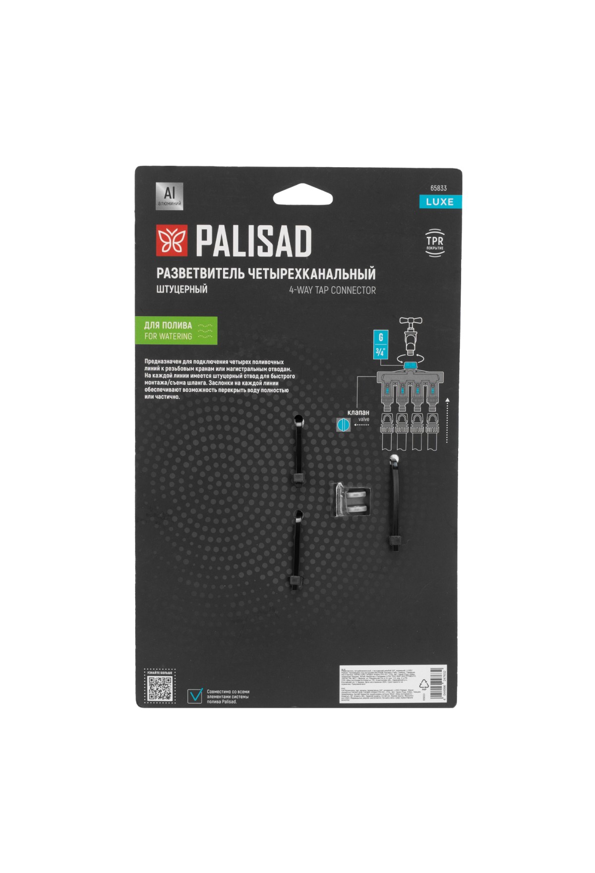 Технические характеристики Разветвитель четырёхканальный, с внутренней резьбой 3/4", алюминий, LUXE Palisad