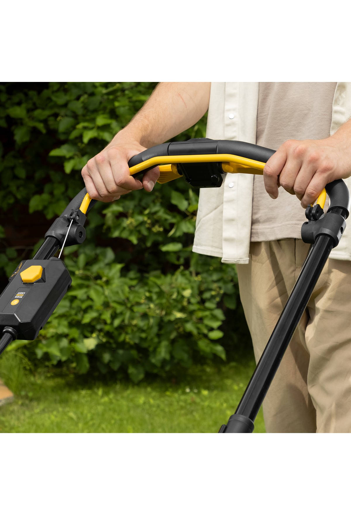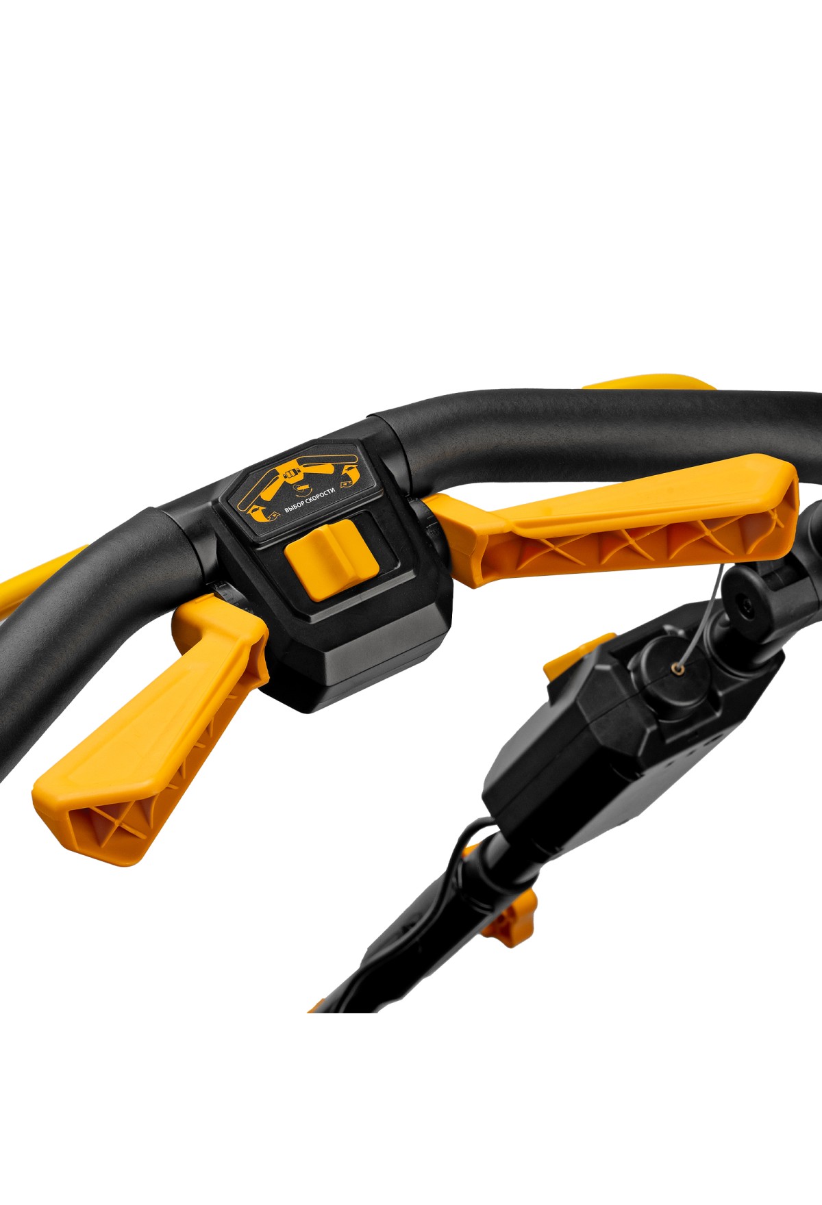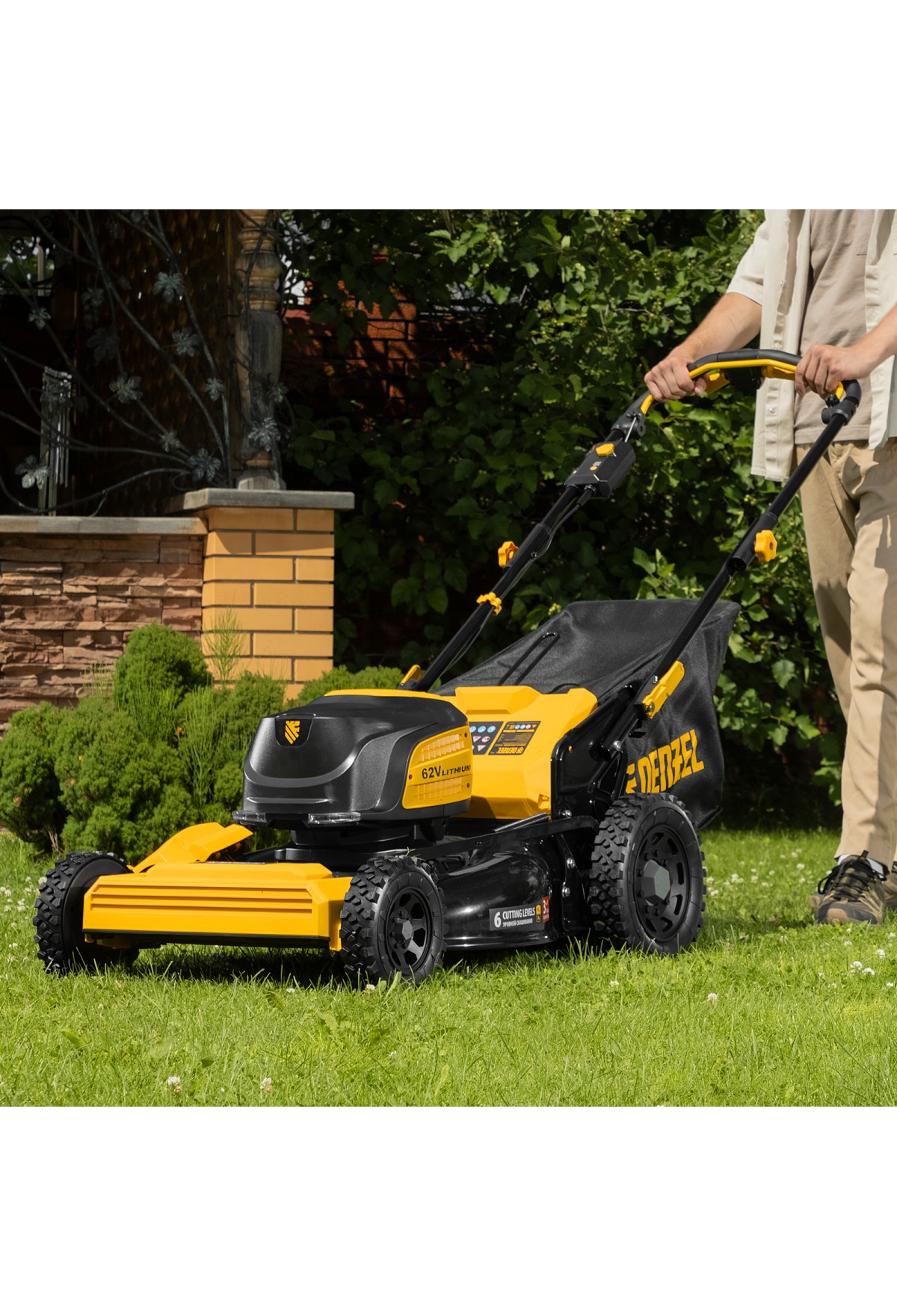 - 6 уровней скашивания — высота травяного покрова регулируется одним рычагом в диапазоне 30-95 мм.
