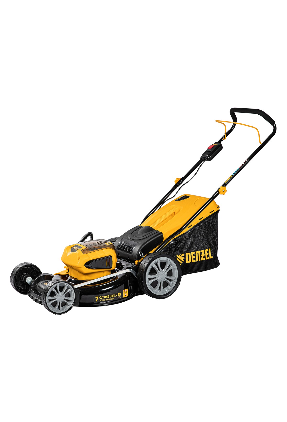 Бесщеточная аккумуляторная газонокосилка Denzel RLM450-36 58910 работает от двух батарей Li-Ion суммарным напряжением 36 В и емкостью 4 Ач, оснащена объемным травосборником на 40 л и обеспечивает ширину скашивания 450 мм за один проход. Машина предназначена для ухода за газоном и подрезания травы на небольших приусадебных участках. Высокоэффективный бесщеточный двигатель позволяет скашивать больше травы на одном заряде АКБ. 7-ступенчатая настройка высоты среза позволяет регулировать уровень скашивания травы в диапазоне 25-75 мм.,Аккумуляторная газонокосилка выгодно отличается от бензиновых и сетевых аналогов по уровню безопасности. Она не требует сложного техобслуживания, пользователю не нужно готовить топливную смесь, а управление будет комфортным даже для новичков.