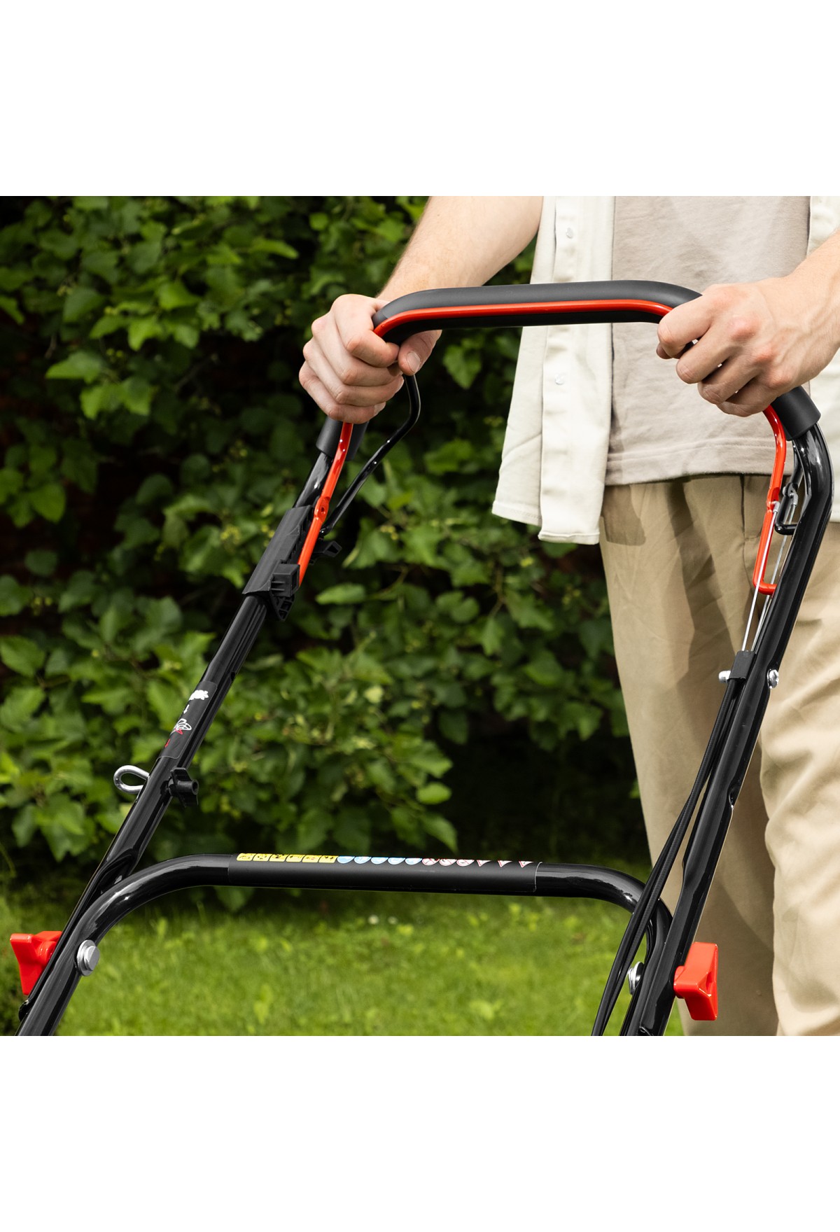 - Компактность — благодаря складной рукоятке и комбинированному травосборнику газонокосилка не занимает много места в зоне хранения.