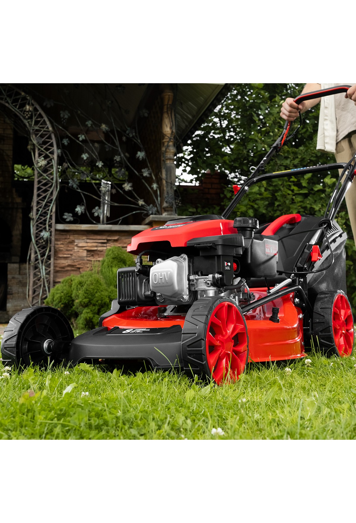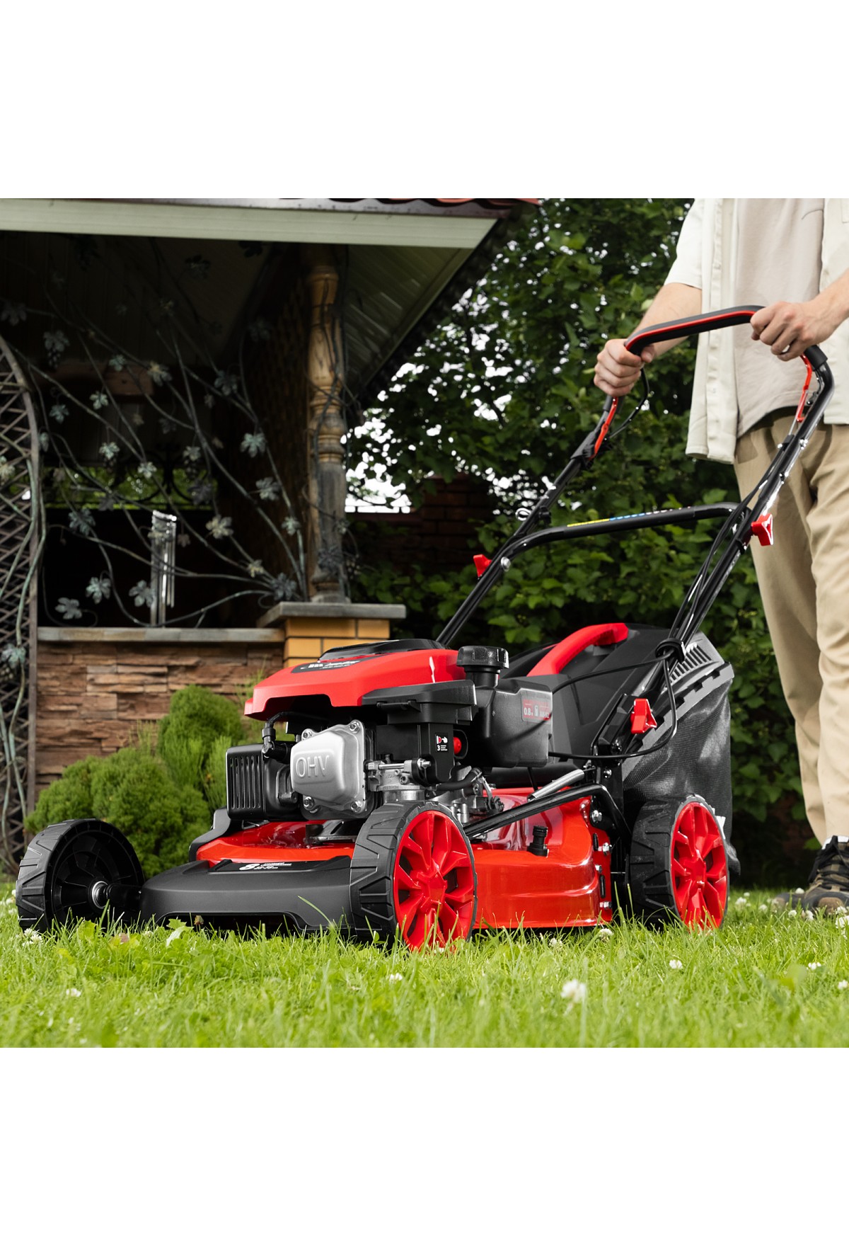 - Привод на колеса — можно с легкостью направлять газонокосилку, не толкая ее.