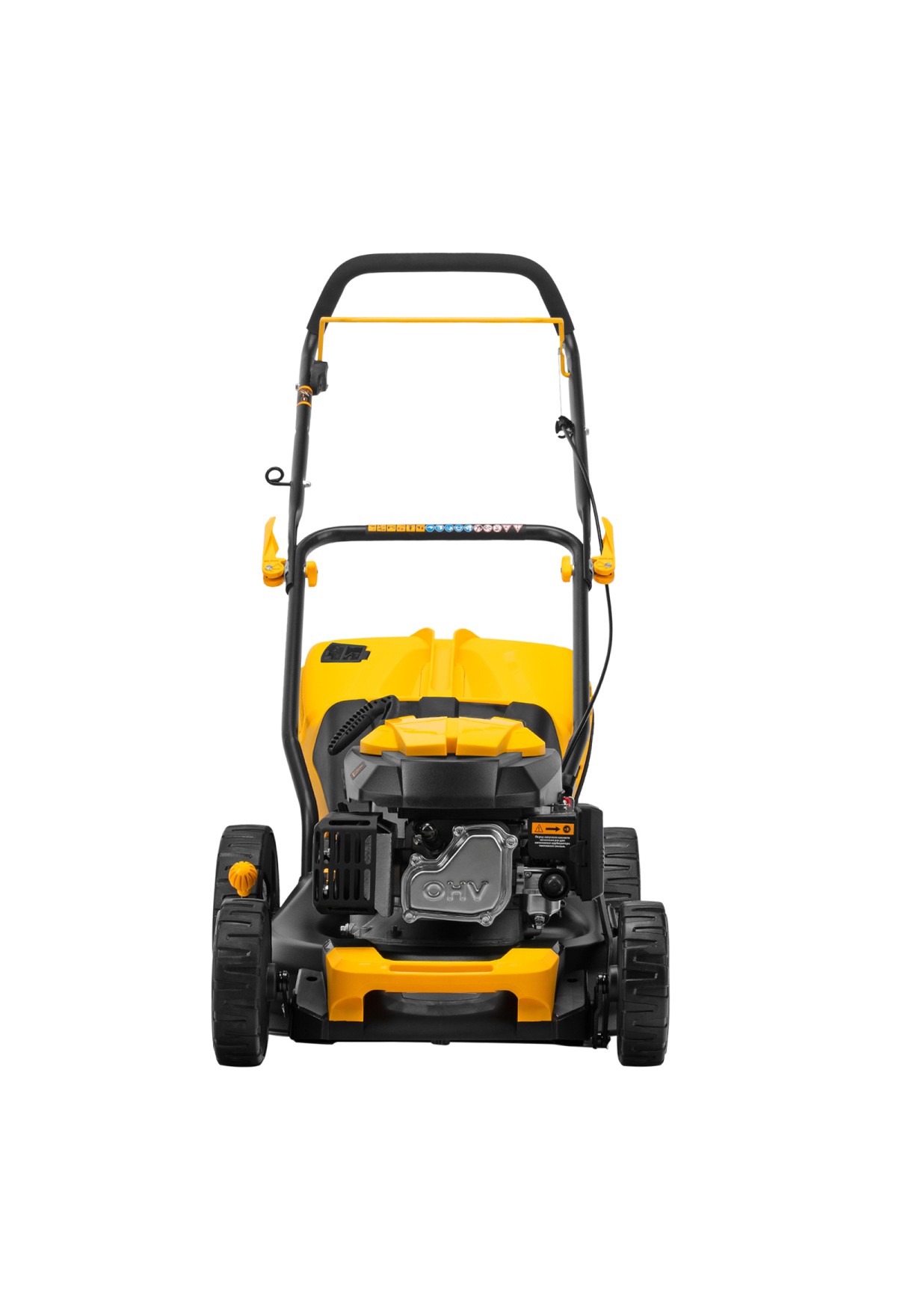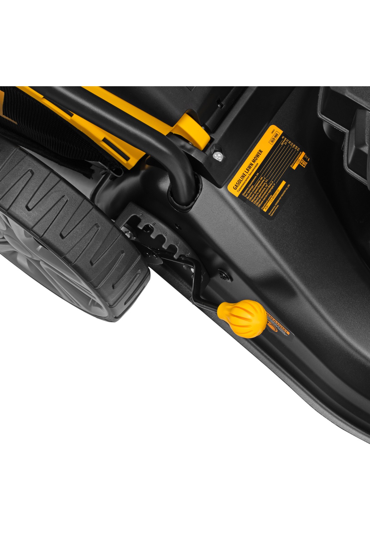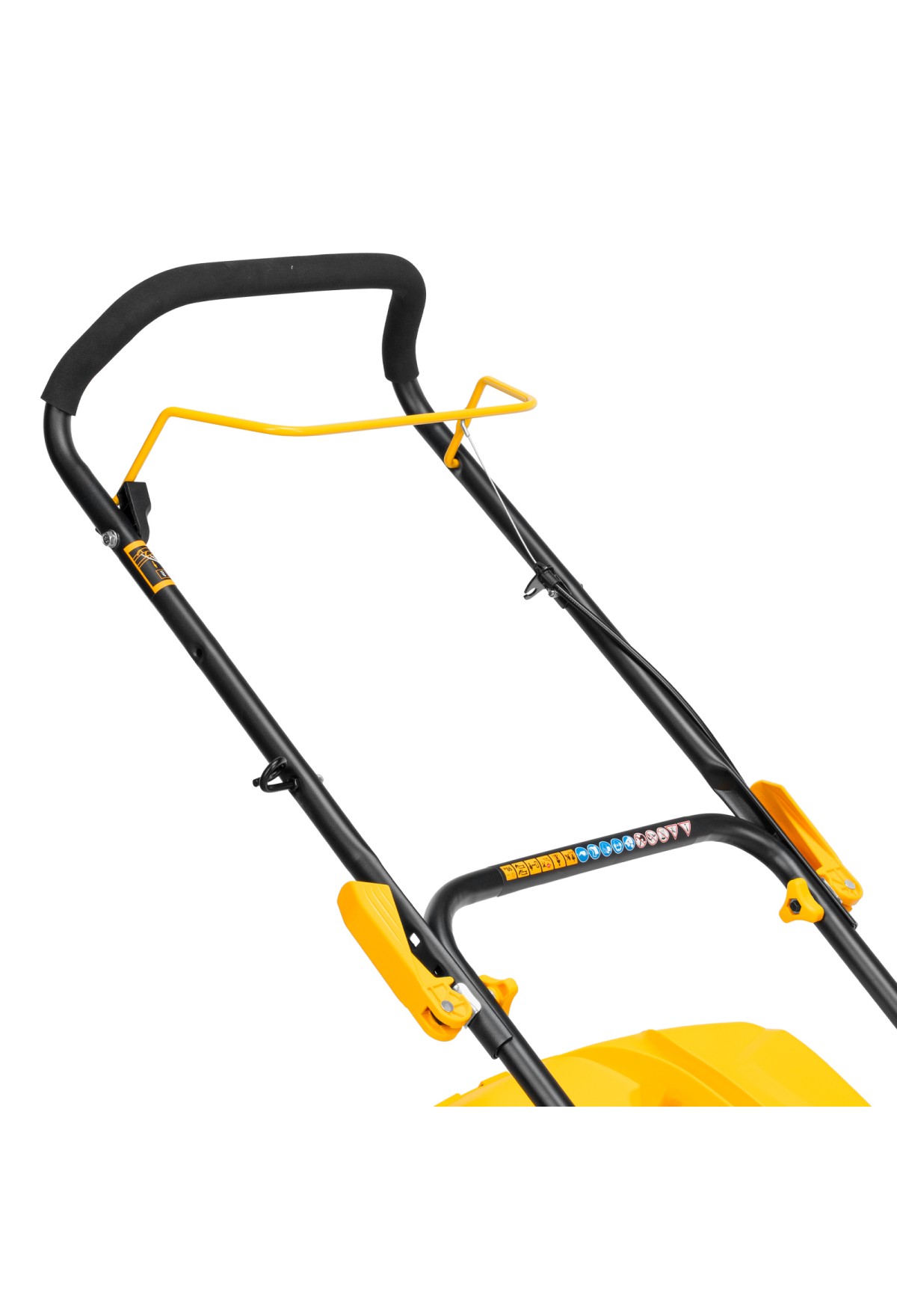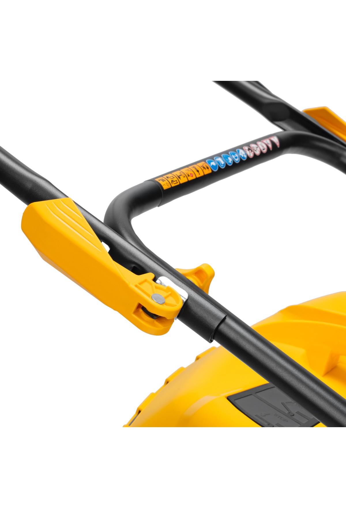 - Быстрая настройка — эксцентриковые фиксаторы ручки позволяют оперативно перевести газонокосилку в рабочее или транспортировочное положение, а 3 точки крепления обеспечивают регулировку вылета ручки под рост пользователя.