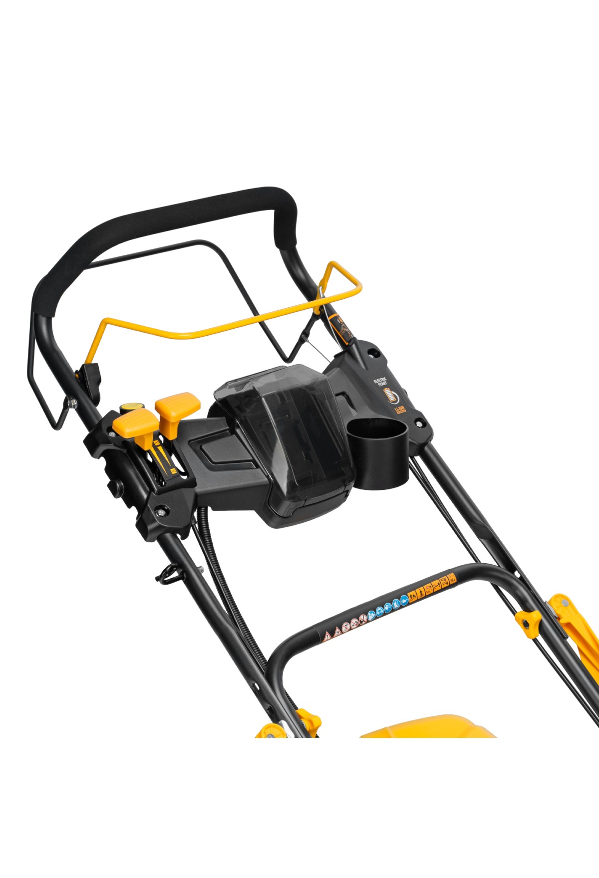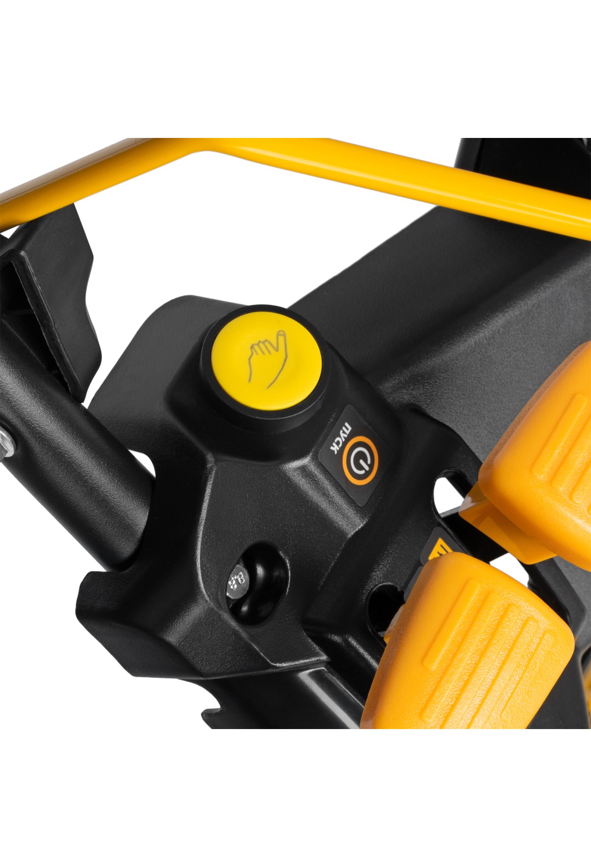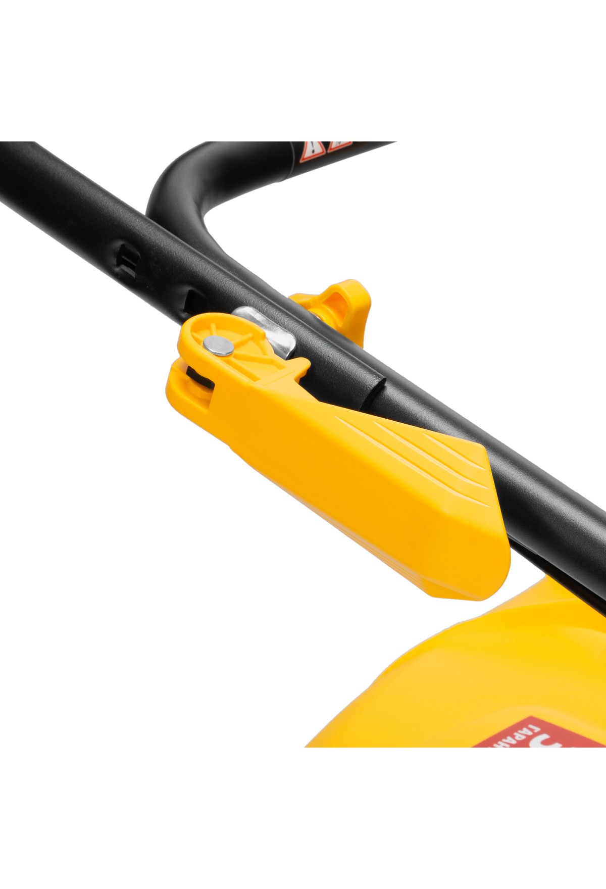 - Регулировка скорости вращения двигателя — запуск и маневрирование происходят на низких оборотах, скашивание — на высоких, что позволяет выполнять работу аккуратно и не снижать производительность.