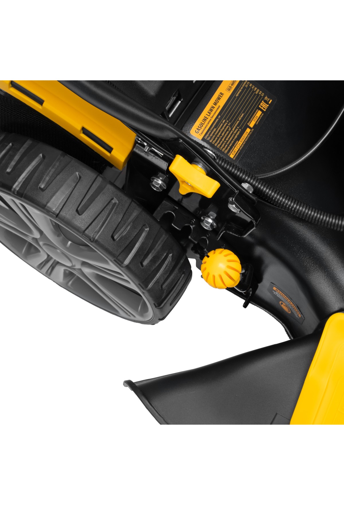 - Регулировка скорости движения — низкая частота вращения колес оптимальна для скашивания густой травы и работы на ограниченном участке, высокая — для подстригания редко растущей и молодой травы.