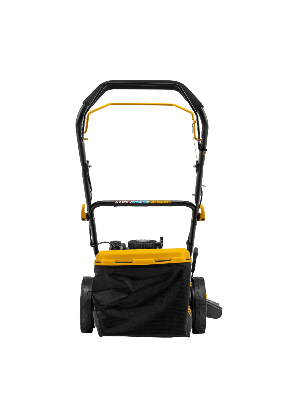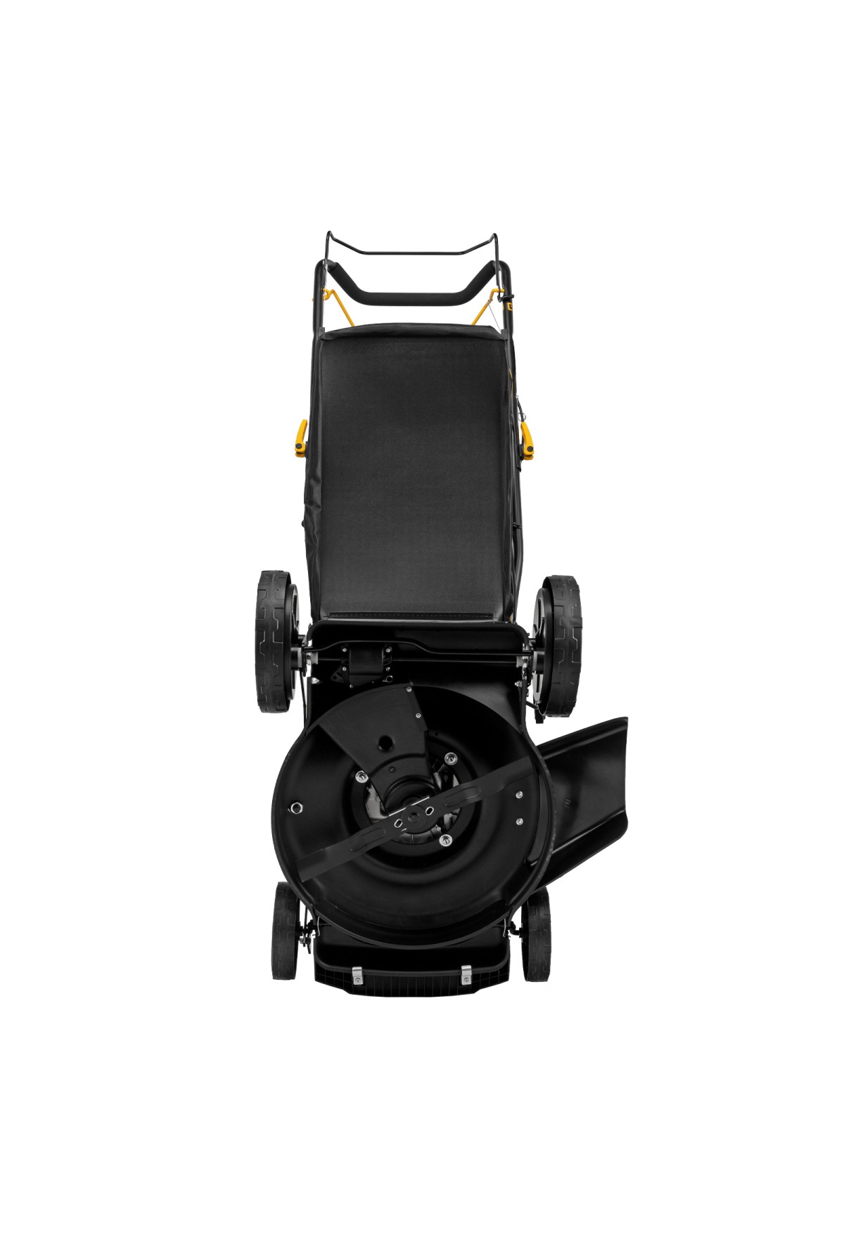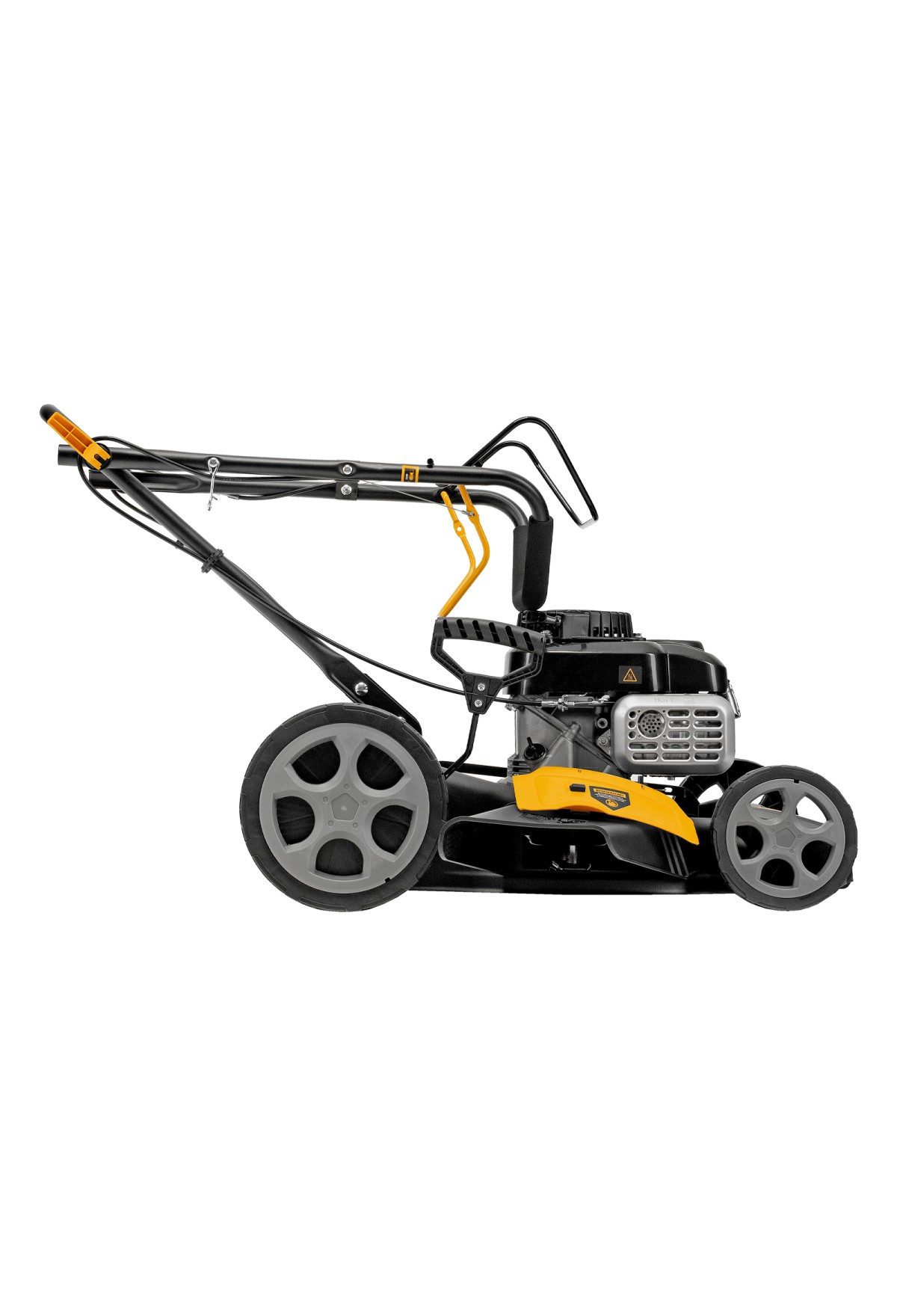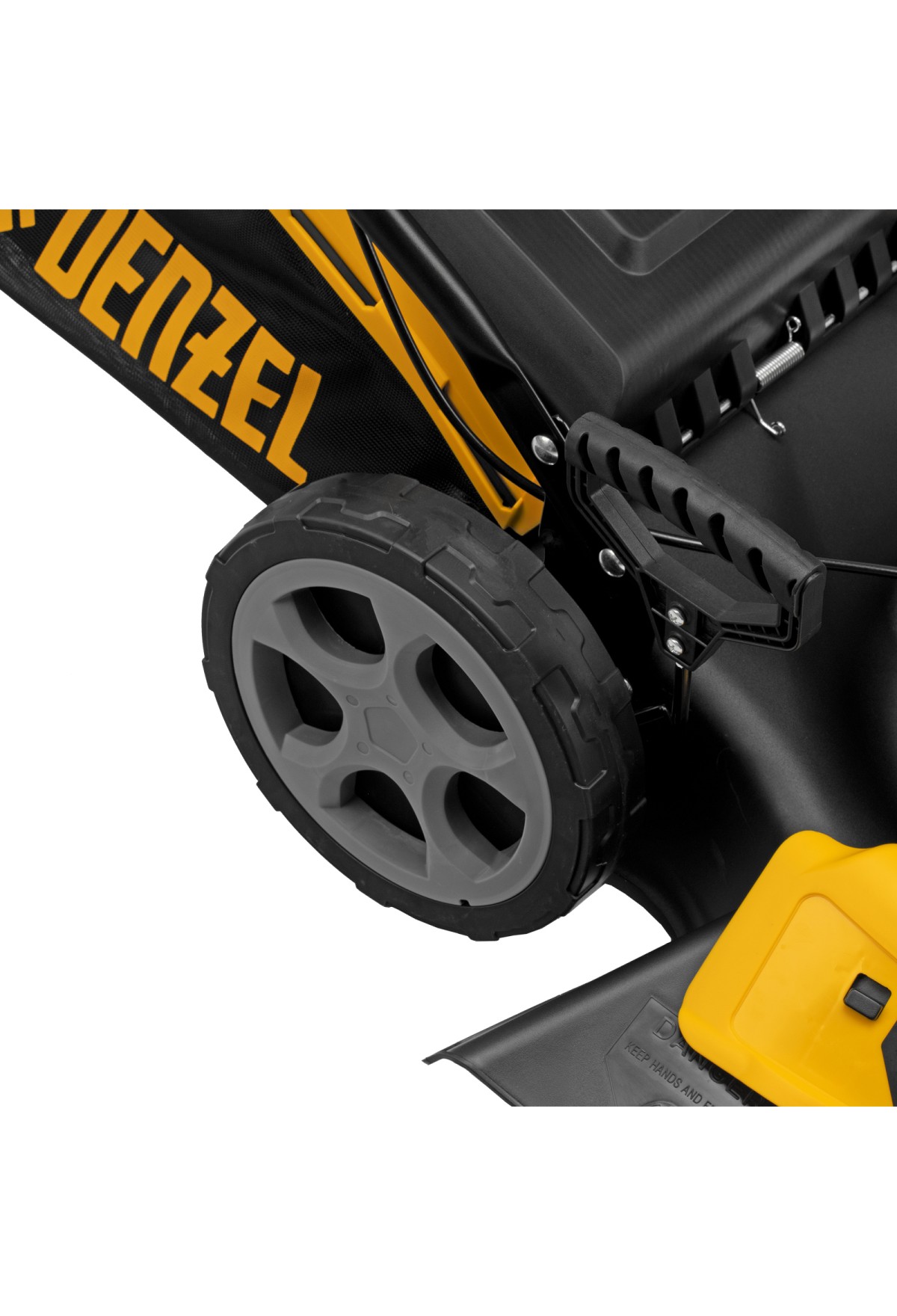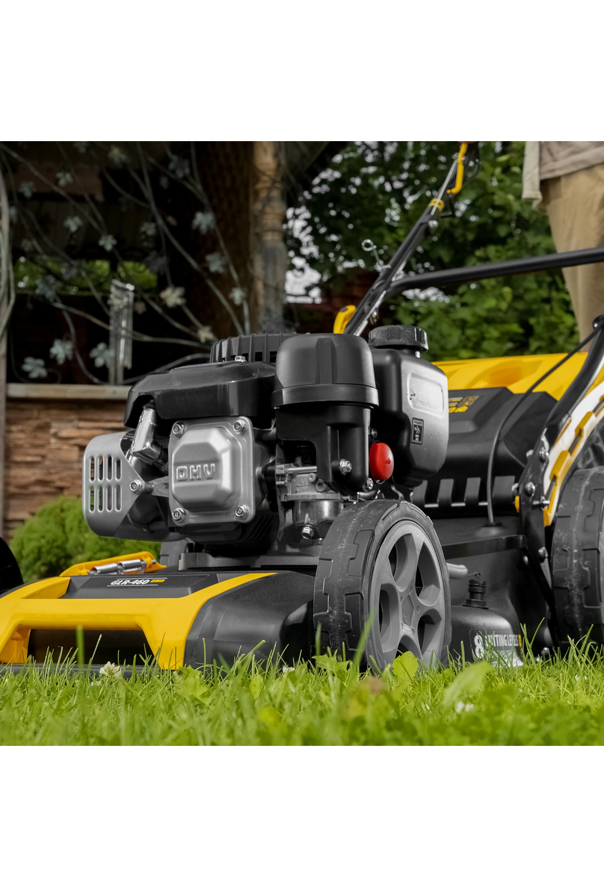- Широкие колеса Eco-friendly — газонокосилка легко проходит по газону, не повреждая его.