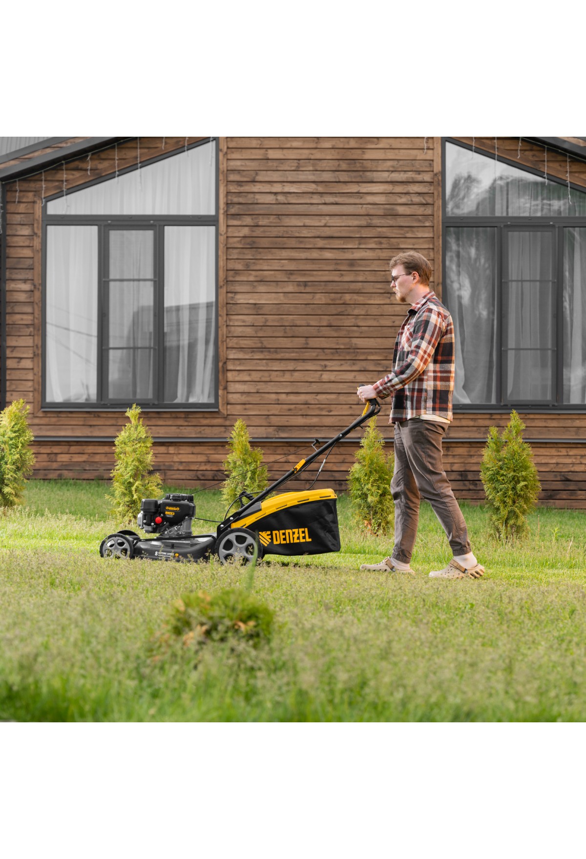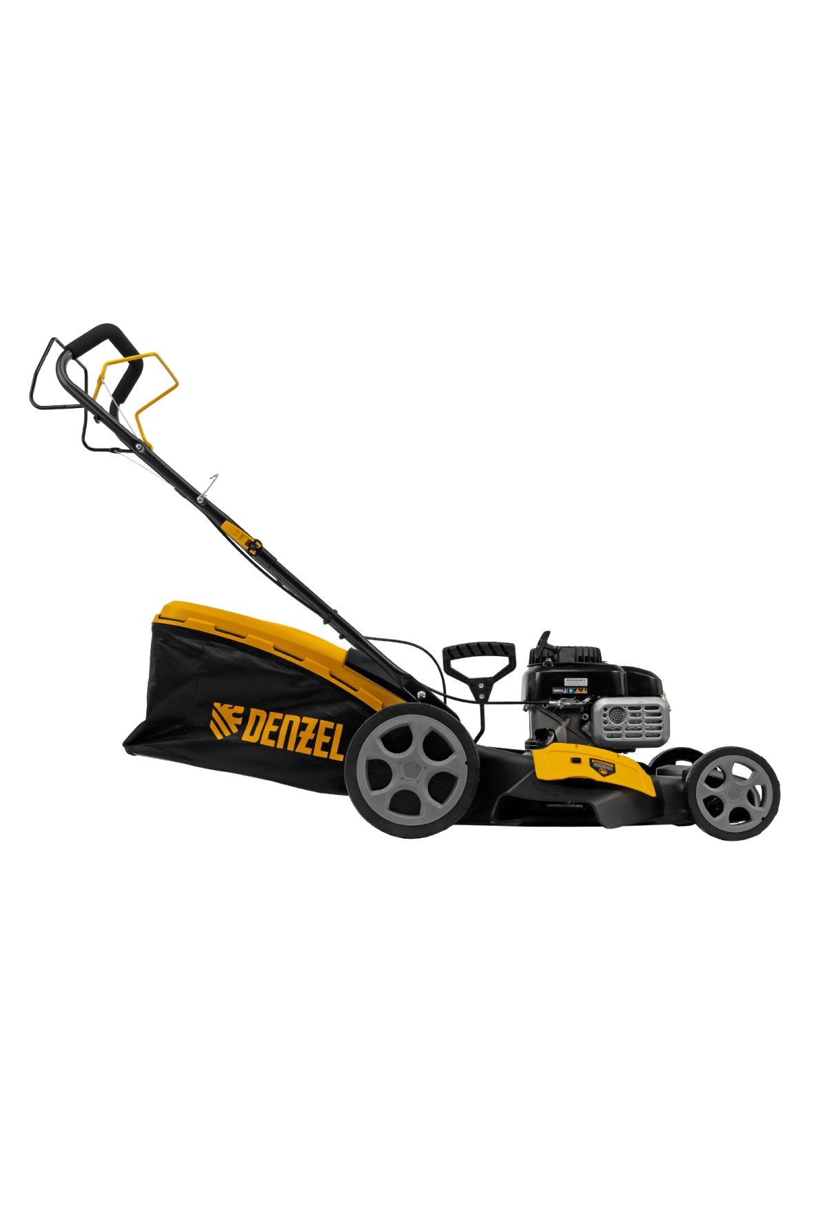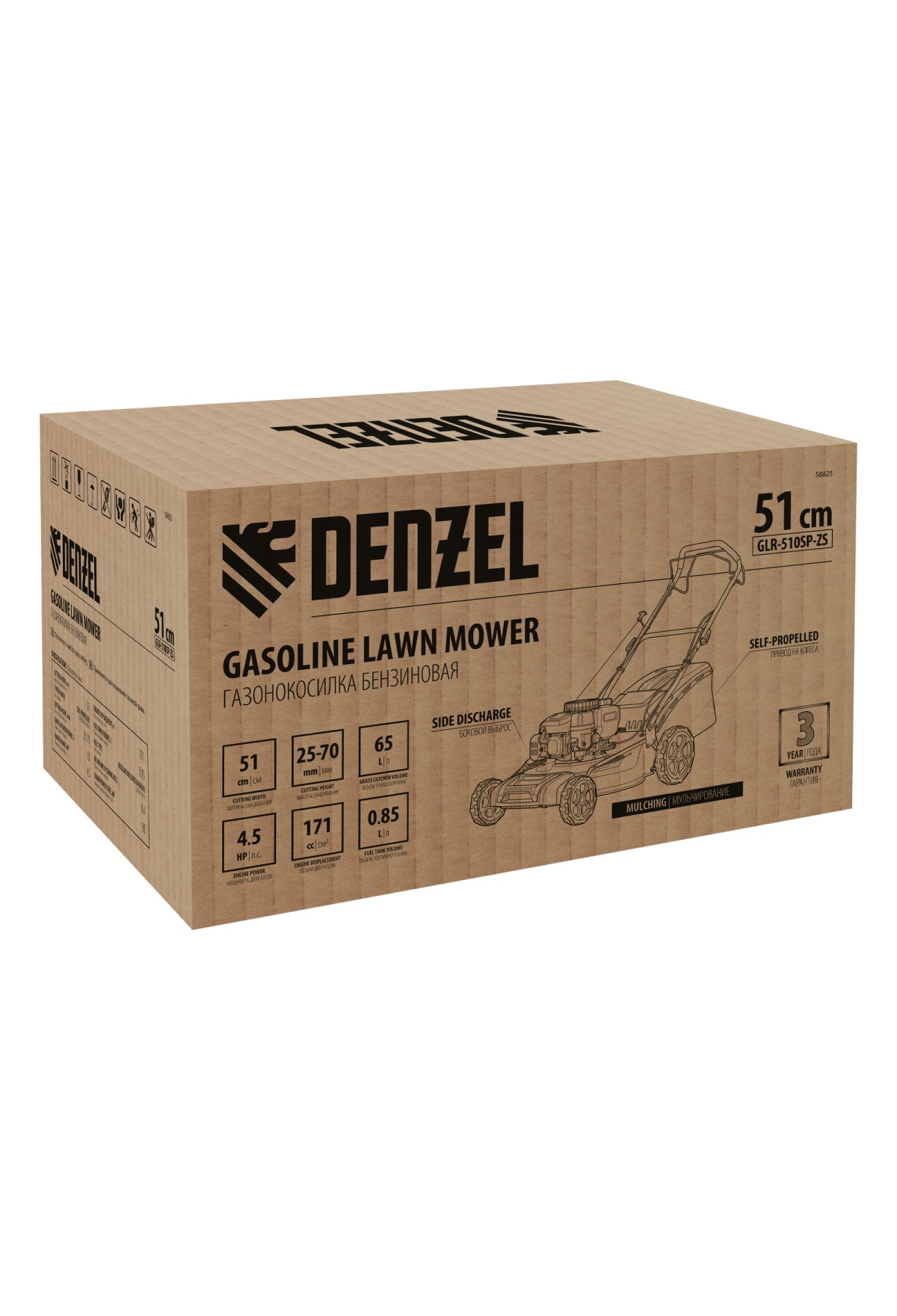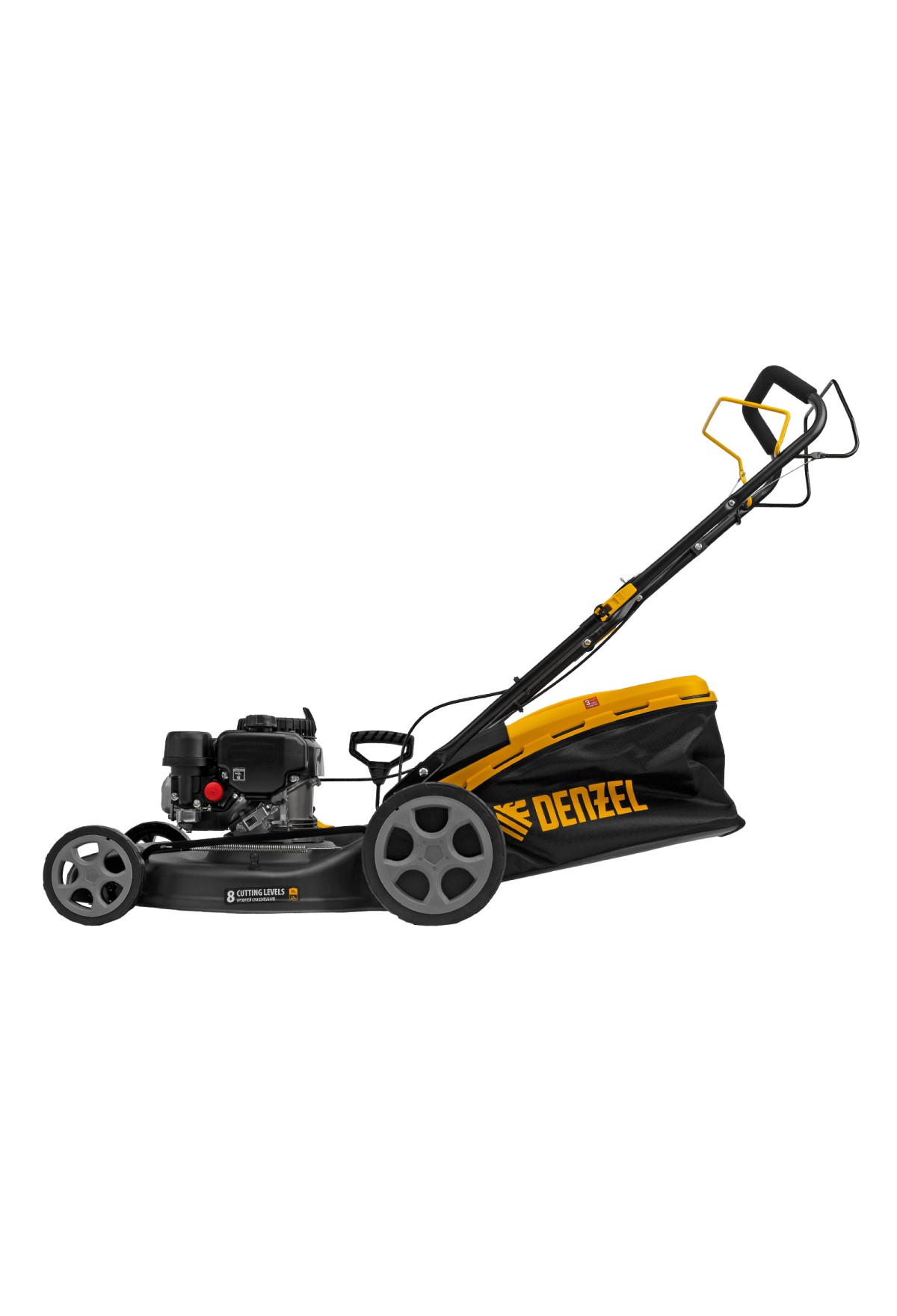 Бензиновая газонокосилка Denzel GLR-510SP-ZS 58825 с приводом на колеса и травосборником вместимостью 65 л, с надежным и экономичным 4-тактным двигателем объемом 171 см3, обеспечивает ширину прохода 51 см. Предназначена для стрижки газонов и скашивания травы в саду, будет полезна для ухода за дачным участком или придомовой территорией большой площади. Высота скашивания легко регулируется одним рычагом в диапазоне 25-70 мм (предусмотрено 8 уровней).