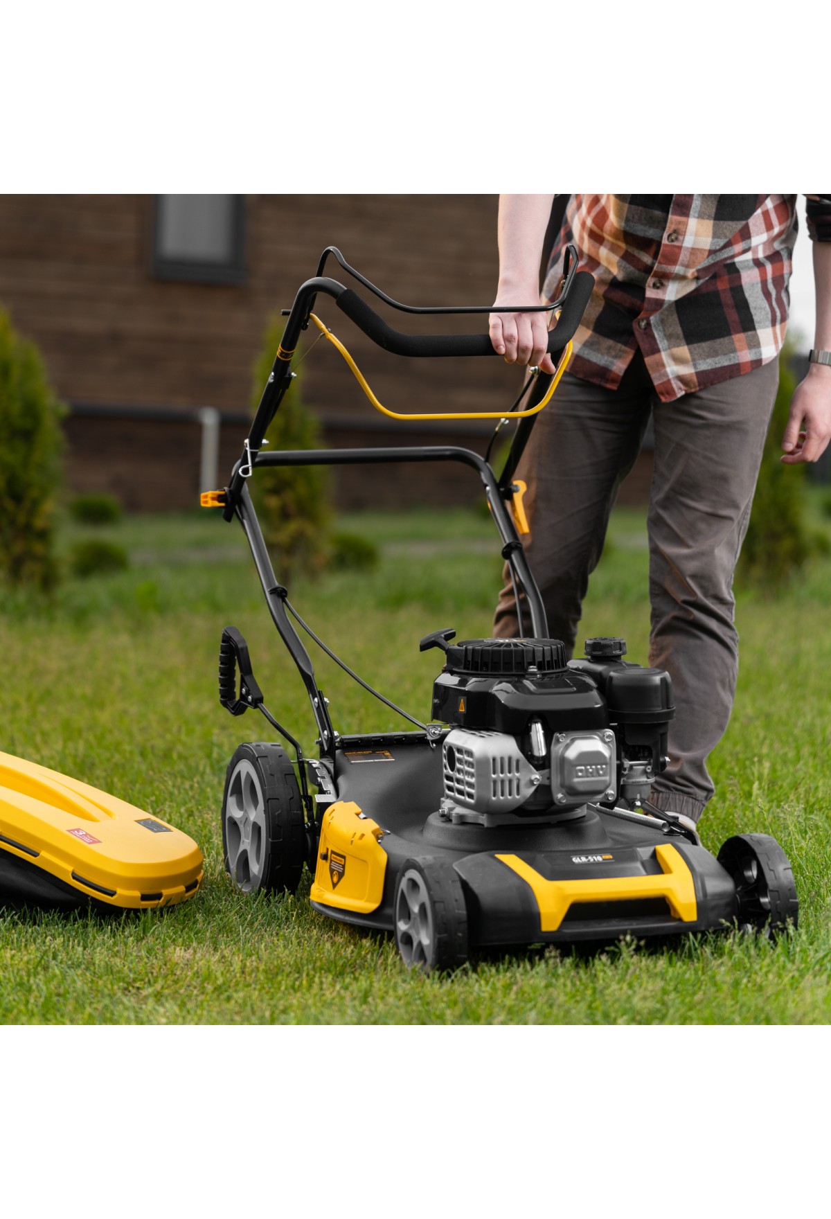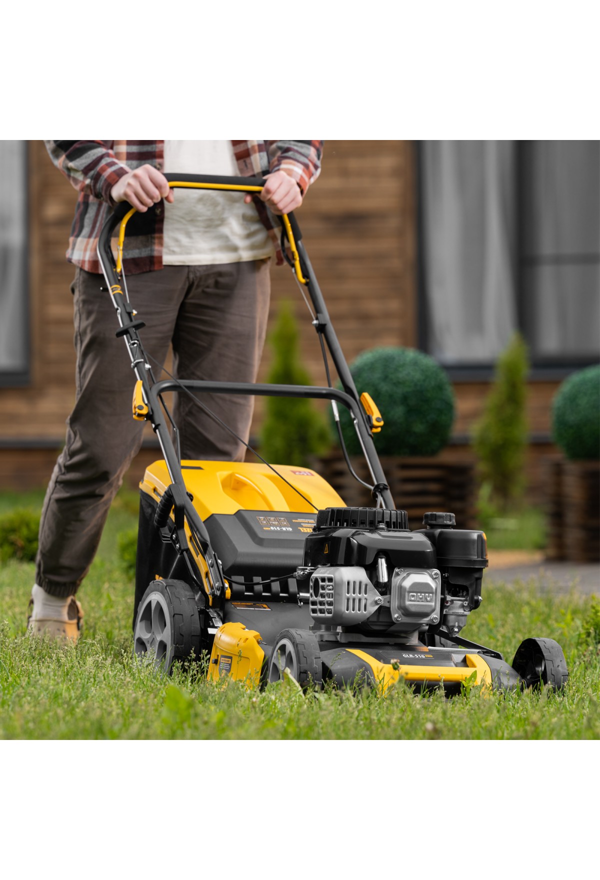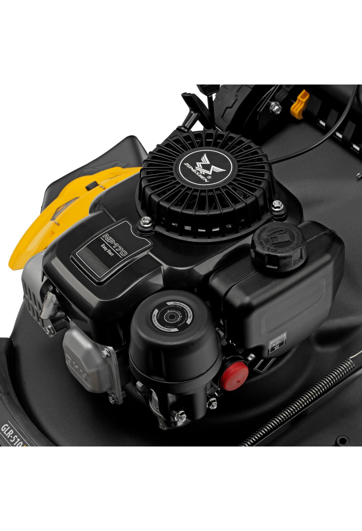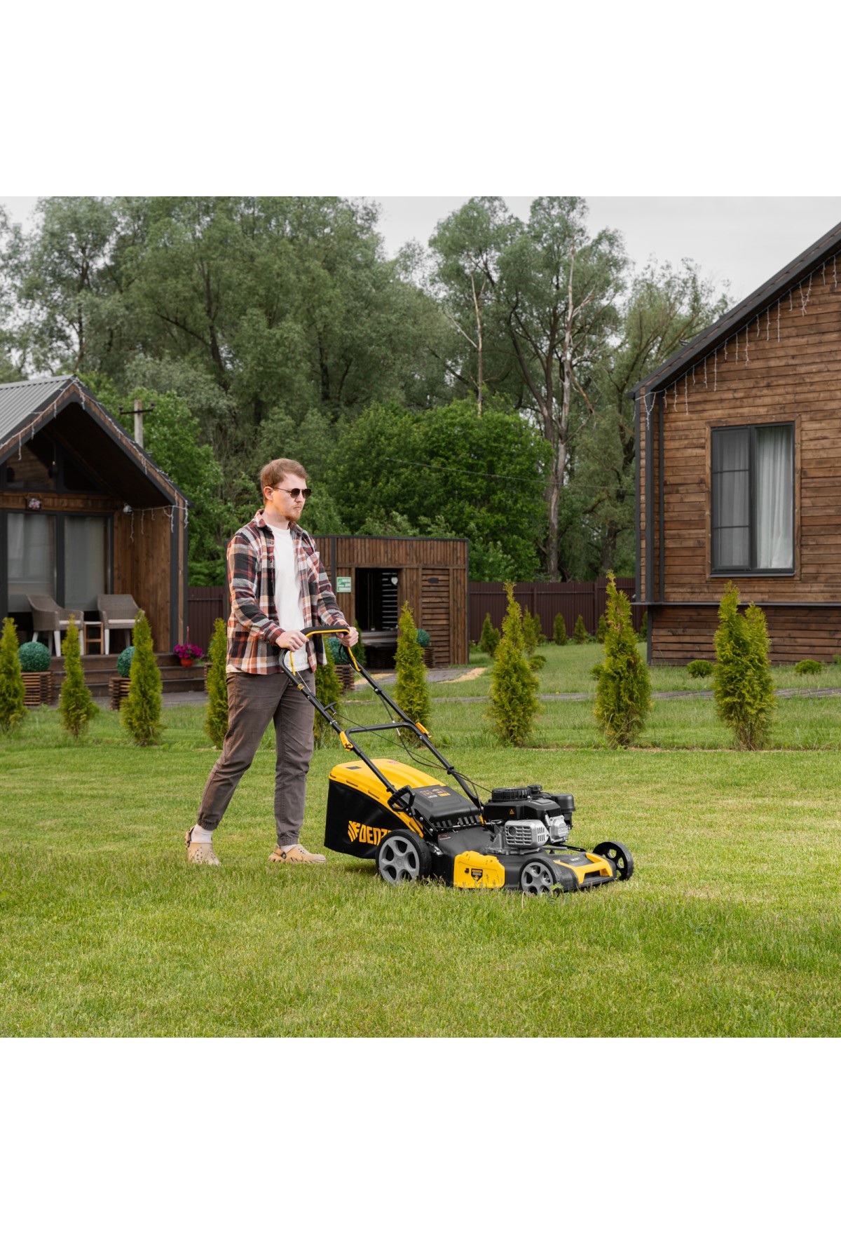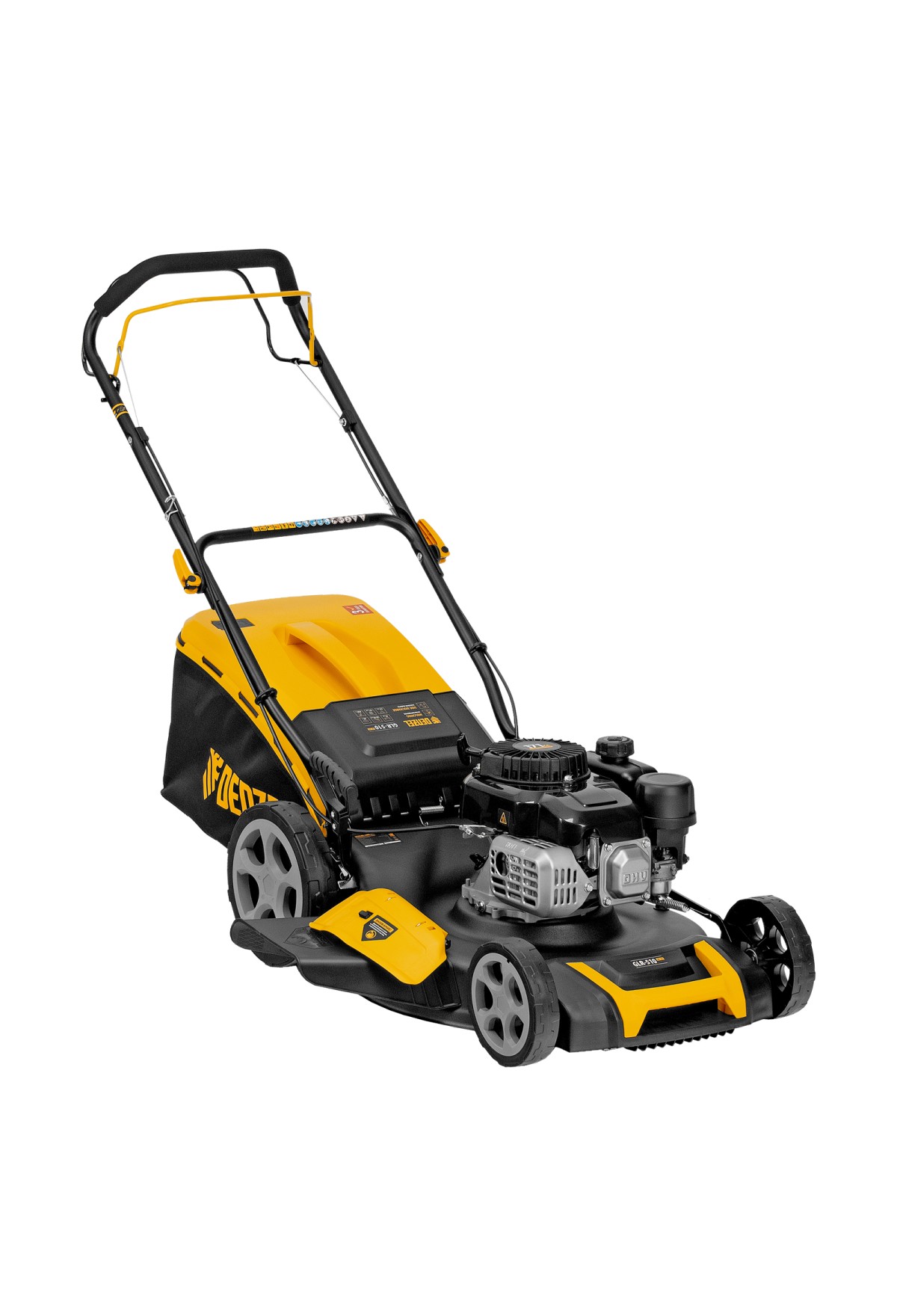 Бензиновая газонокосилка Denzel GLR-510SP-ZS 58825 с приводом на колеса и травосборником вместимостью 65 л, с надежным и экономичным 4-тактным двигателем объемом 171 см3, обеспечивает ширину прохода 51 см. Предназначена для стрижки газонов и скашивания травы в саду, будет полезна для ухода за дачным участком или придомовой территорией большой площади. Высота скашивания легко регулируется одним рычагом в диапазоне 25-70 мм (предусмотрено 8 уровней).