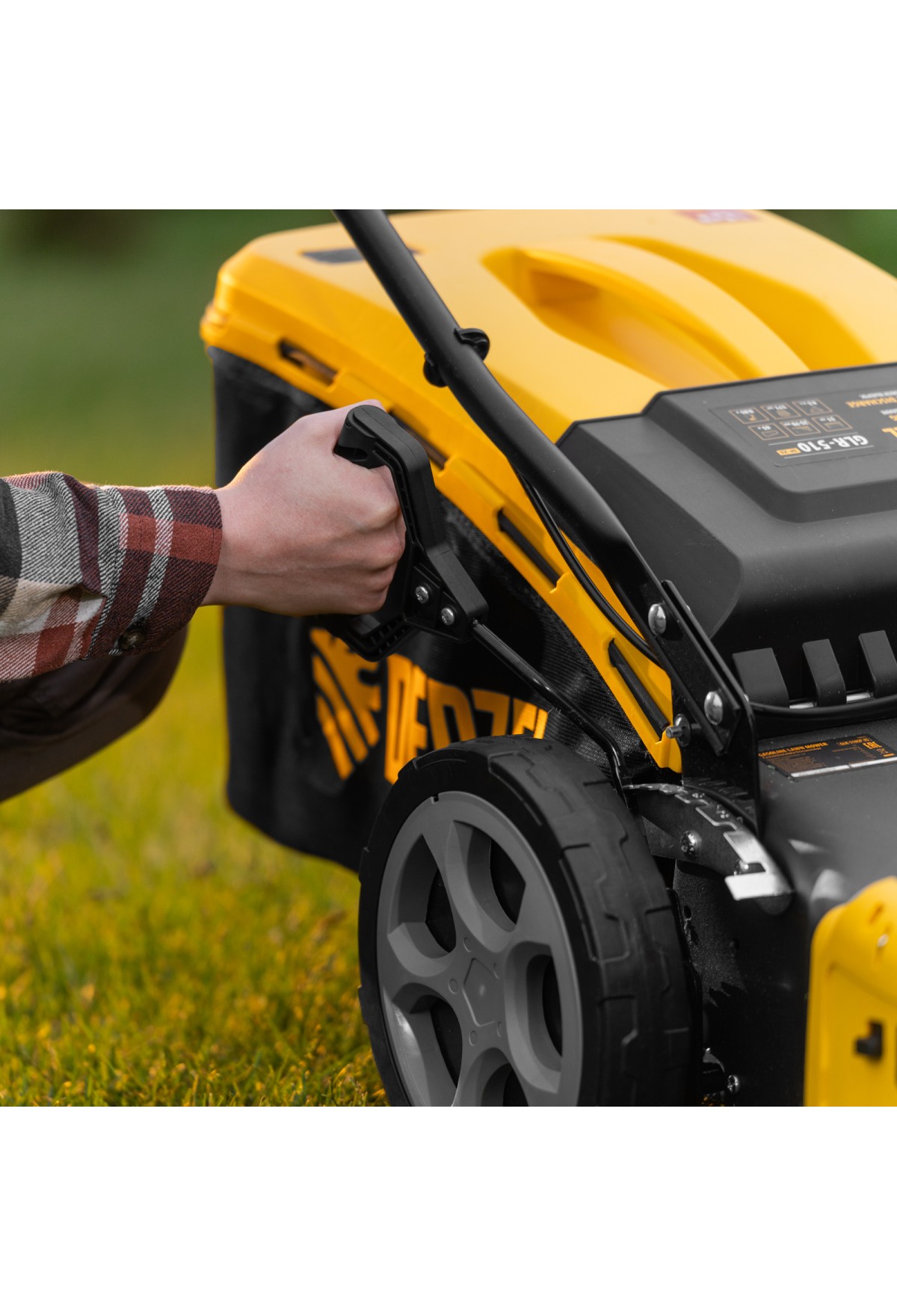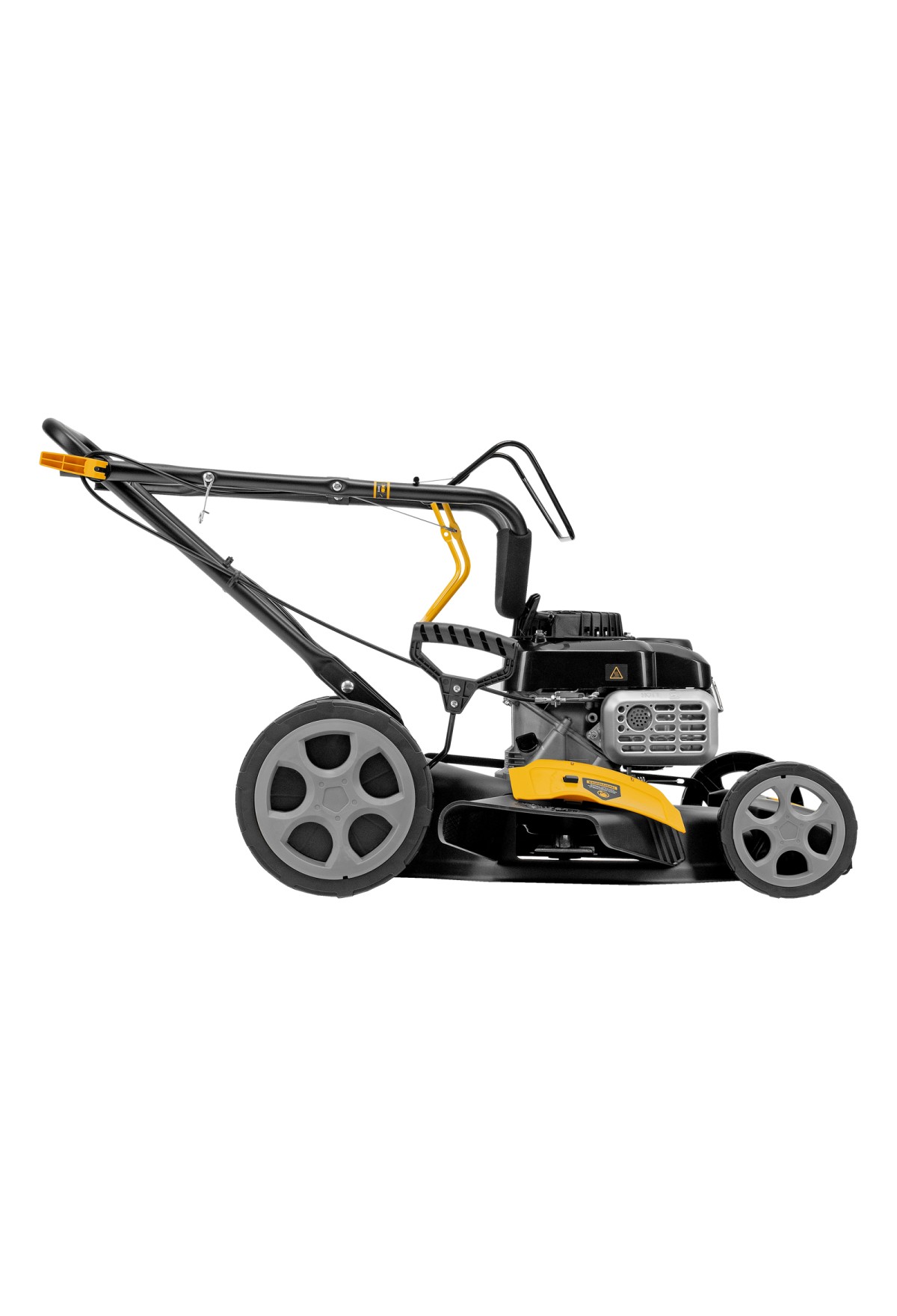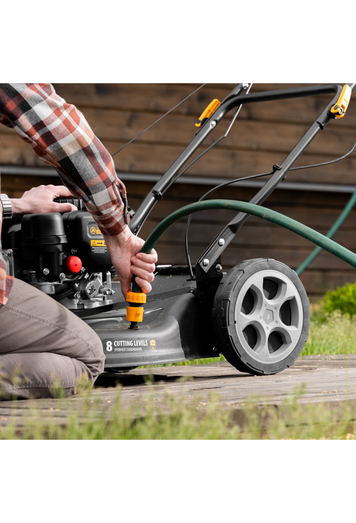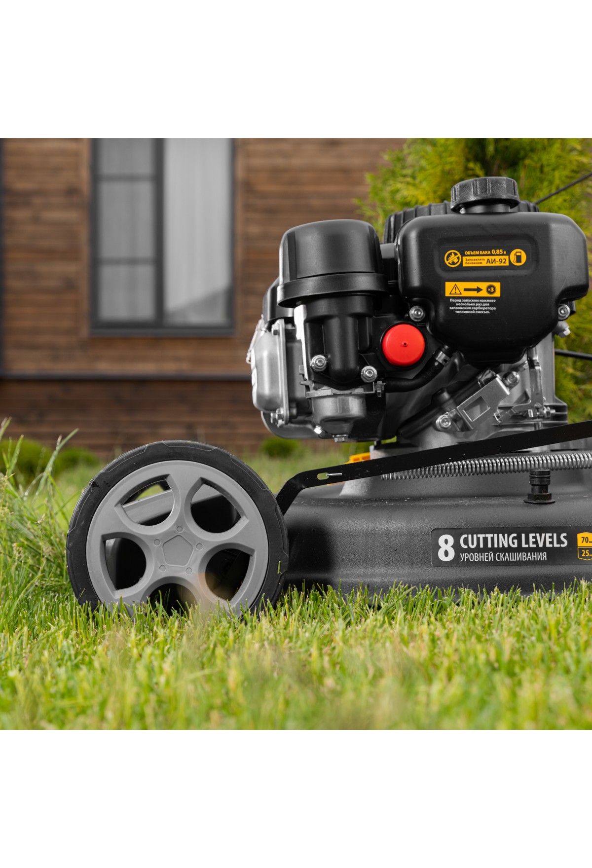 - Широкие колеса Eco-friendly — газонокосилка легко проходит по газону, не повреждая его.