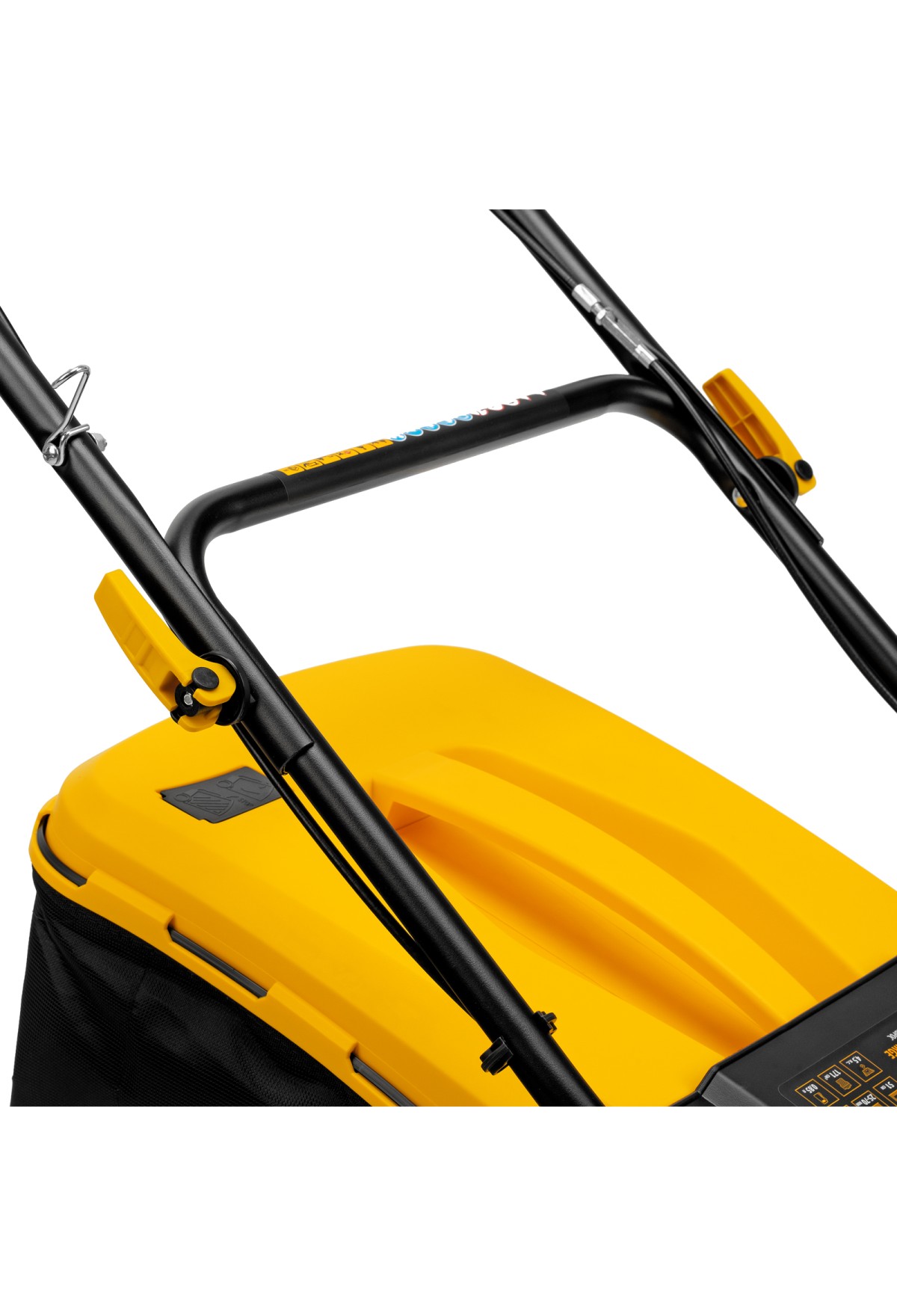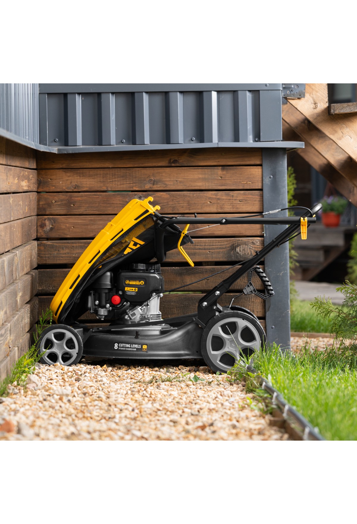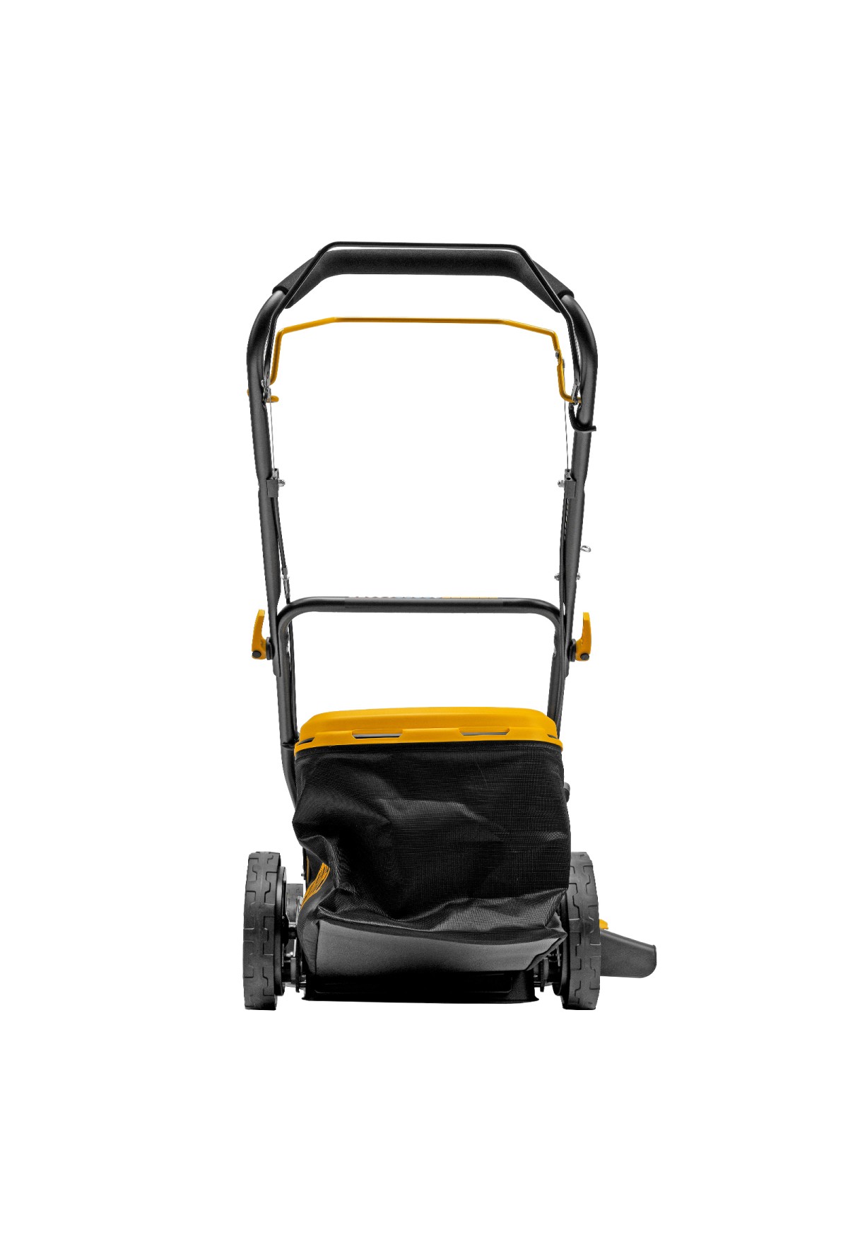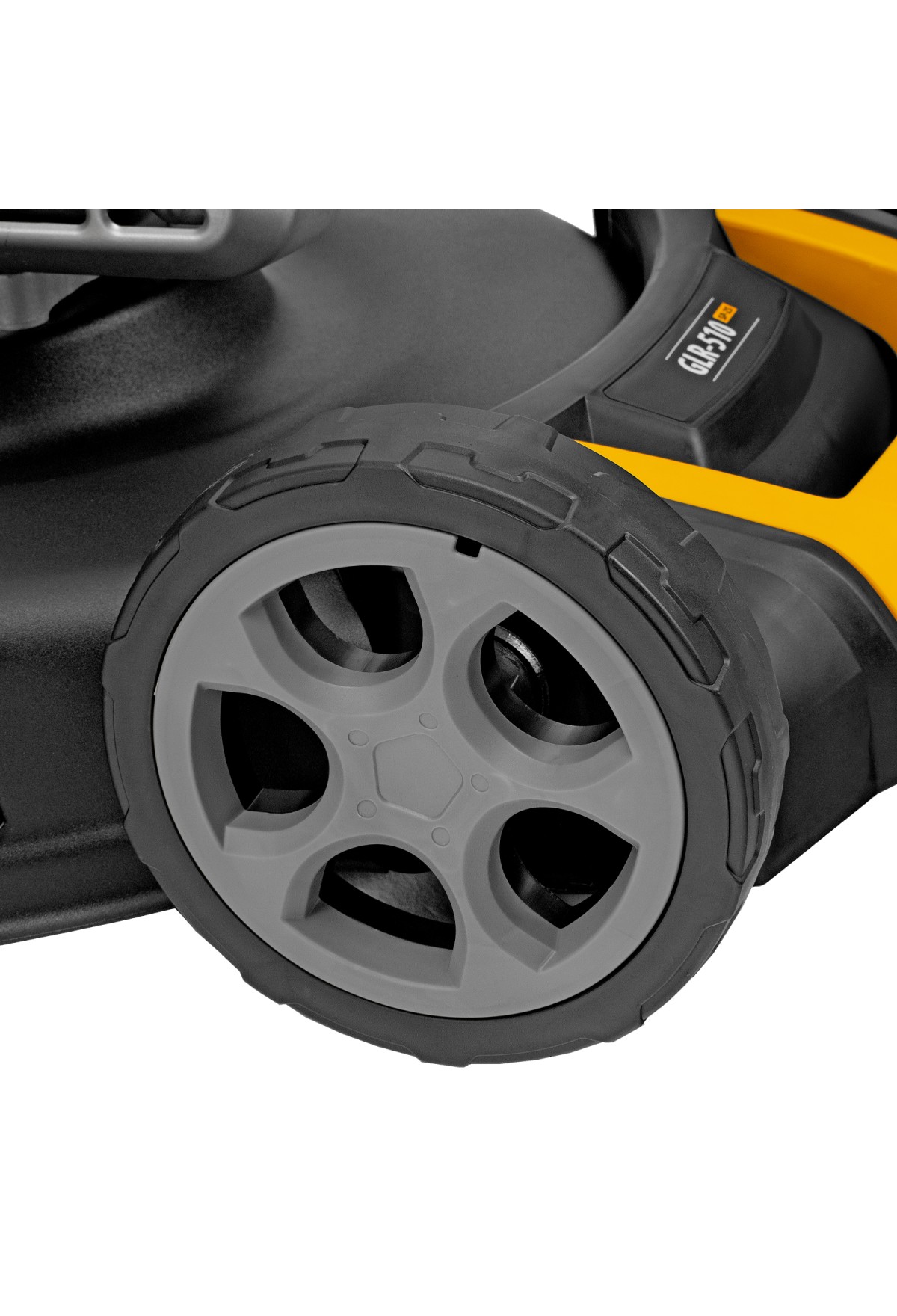 - Широкие колеса Eco-friendly — газонокосилка легко проходит по газону, не повреждая его.