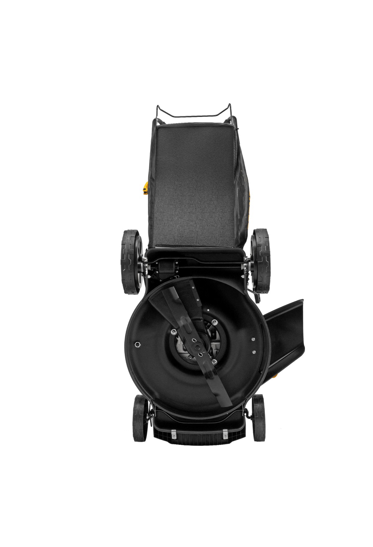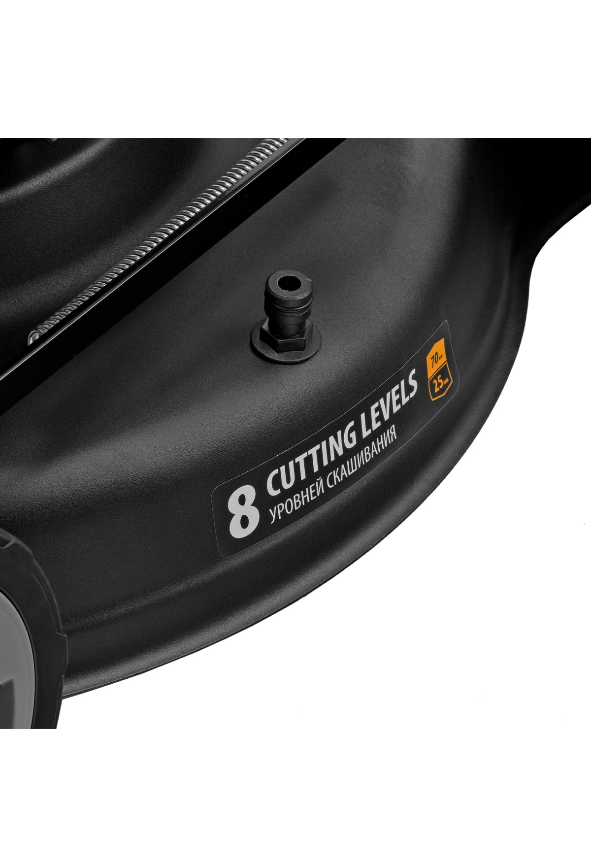- Широкий функционал «4 в 1» — газонокосилка работает в режимах сбора травы в объемный контейнер, мульчирования, бокового выброса, а также выброса травы под деку.