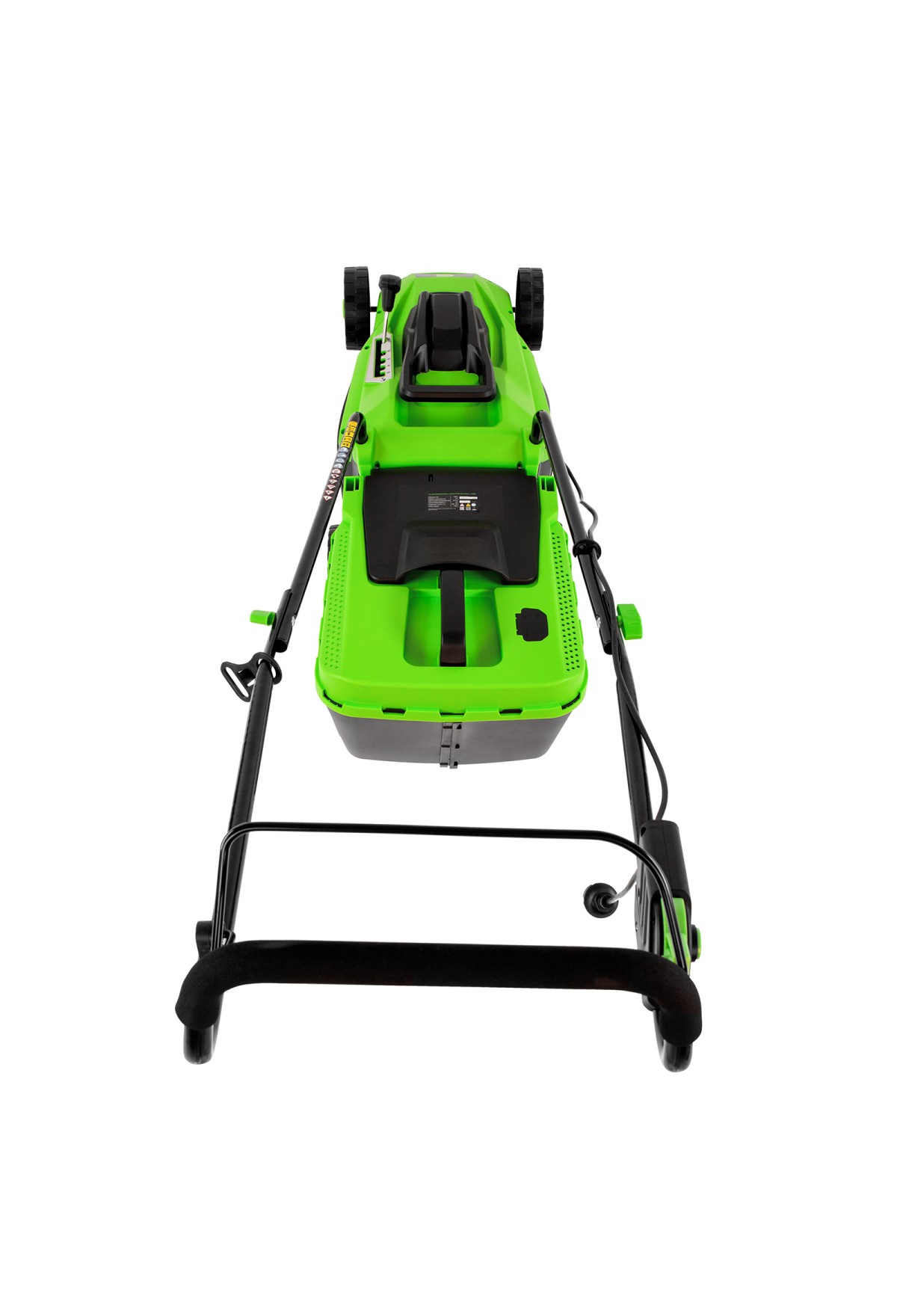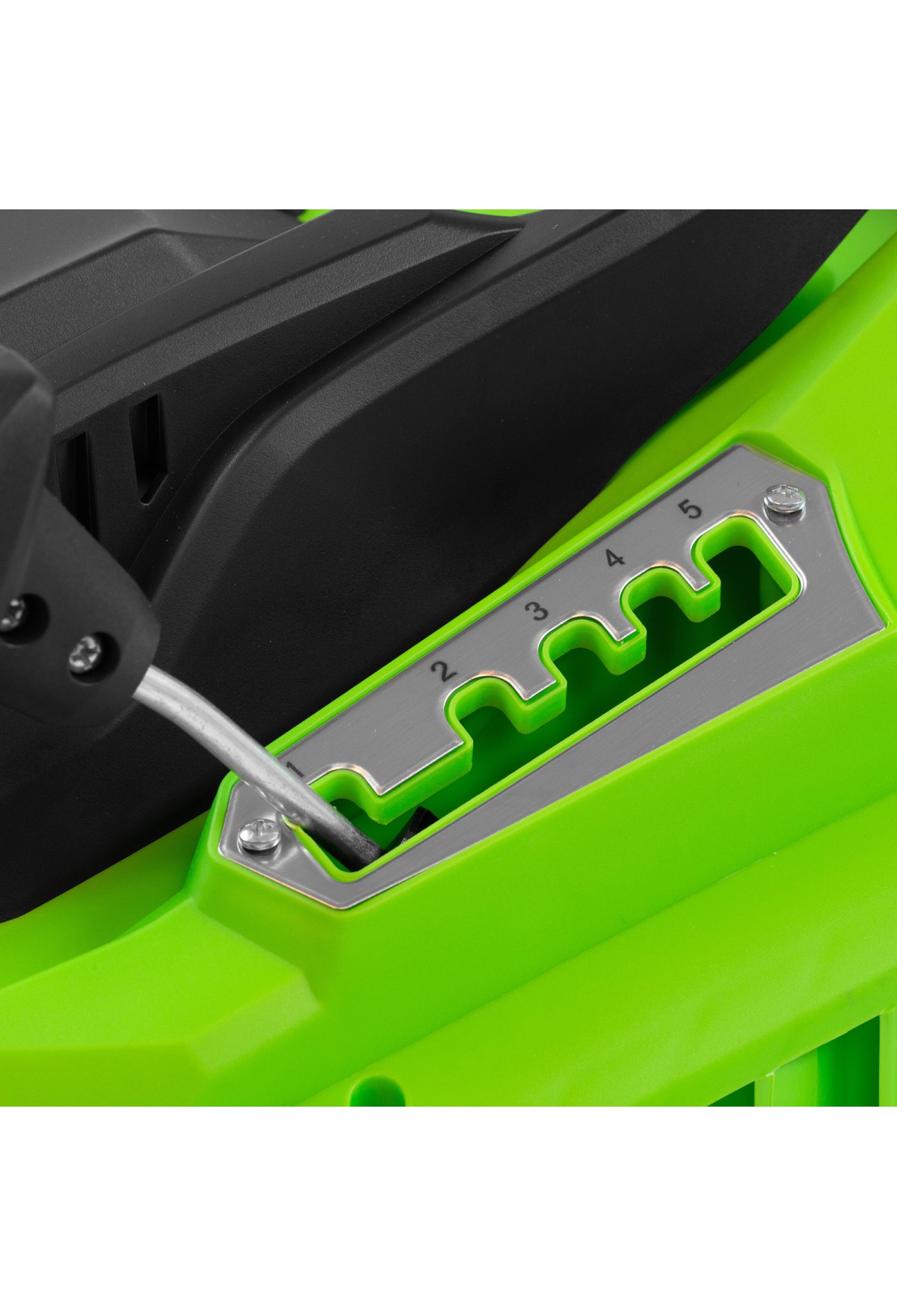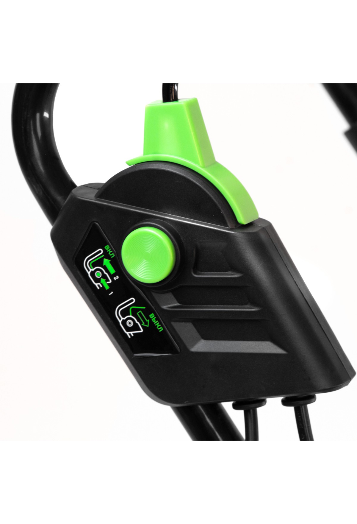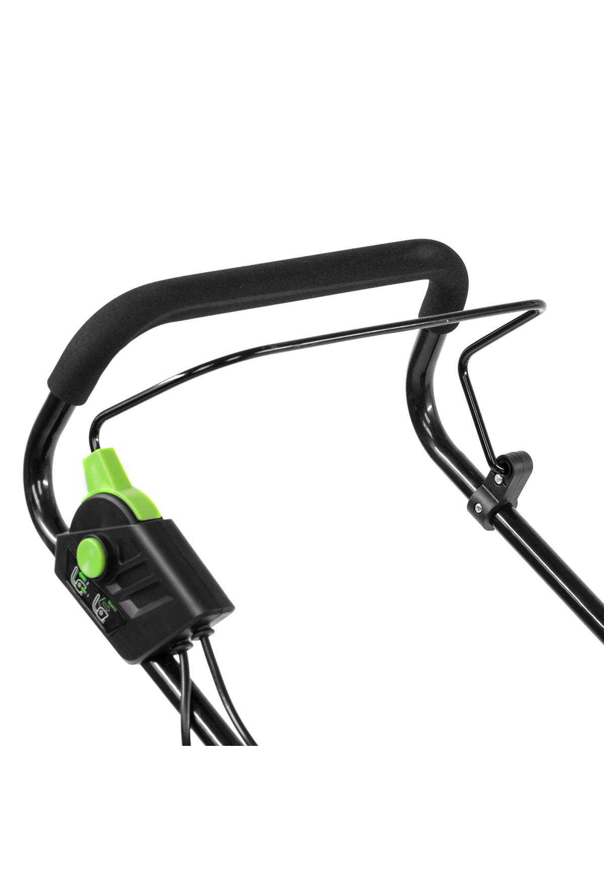 - Комфортная эксплуатация — для управления используется скоба, а не рычаг, как на большинстве электрокосилок, что делает работу удобной, особенно для левшей.
