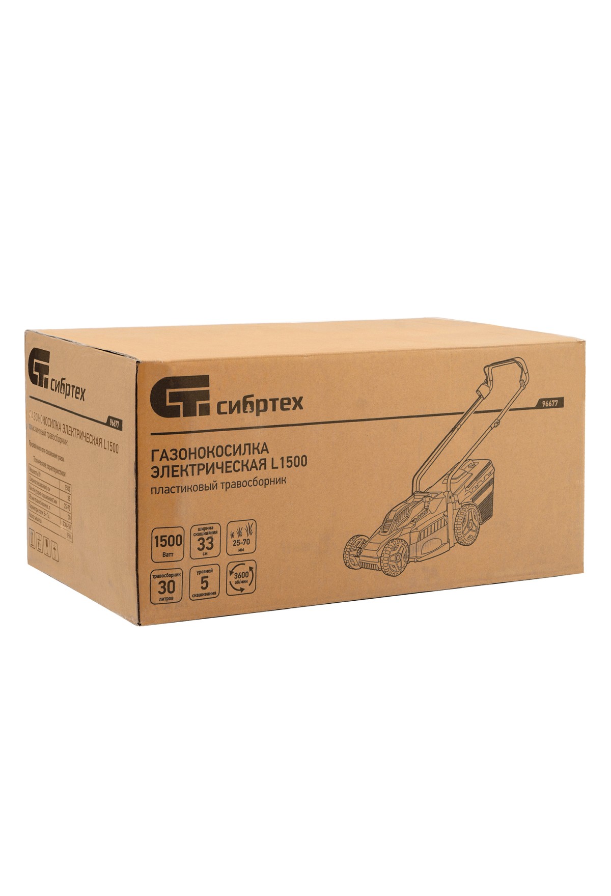 Электрическая газонокосилка Сибртех L1500 96677 мощностью 1500 Вт, с 5 уровнями скашивания, с травосборником объемом 35 л, предназначена для подрезания невысокой травы. Ширина прохода 33 см и мощность мотора 1,5 кВт позволяют за 1 час обрабатывать почти 1200 кв.м.,Косилка не наносит ущерб природе и проста в применении, т.к. работает без масла и топлива, а ее обслуживание сведено к нескольким простым шагам. Именно поэтому она подходит даже начинающим пользователям.,Настройка высоты скашивания находится в диапазоне 30–70 мм. Перемещая рычаг в одно из 5 положений, Вы сможете создать несколько типов ландшафта на своем участке, например, партерный, садово-парковый или спортивный.