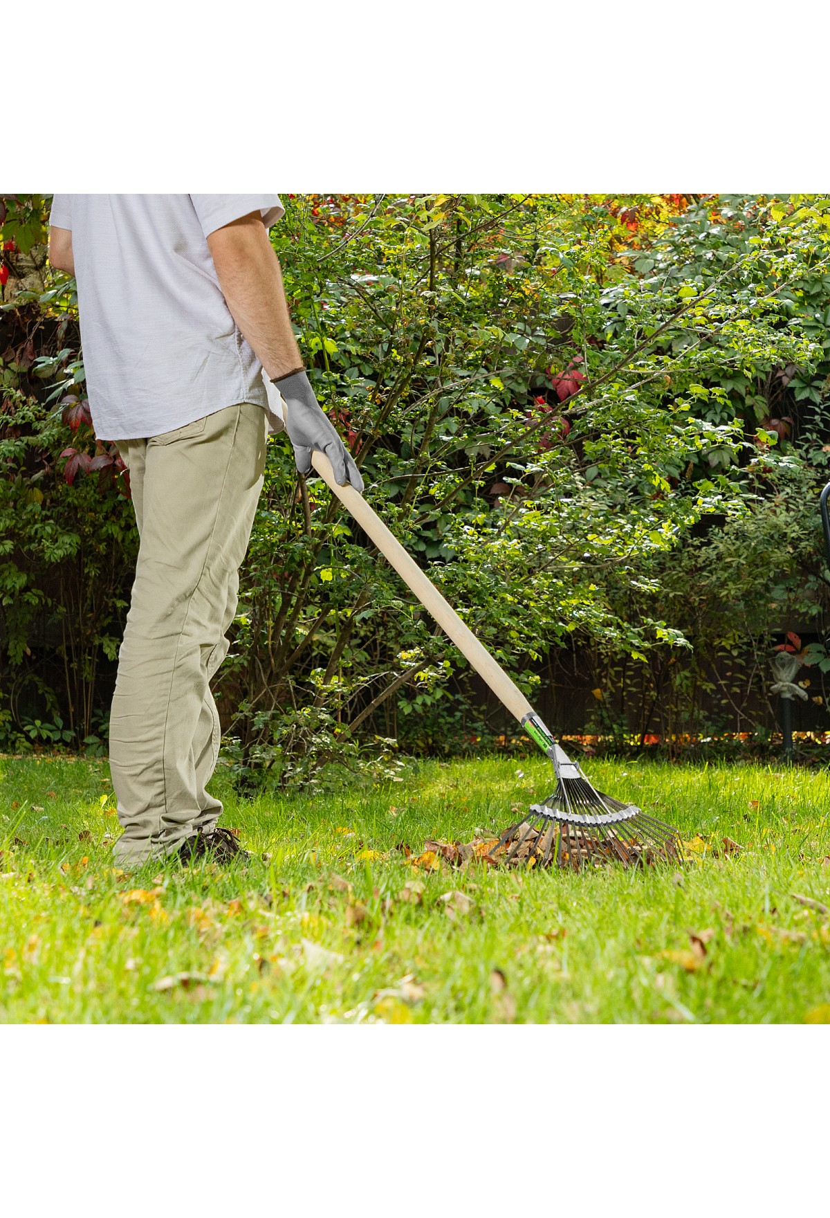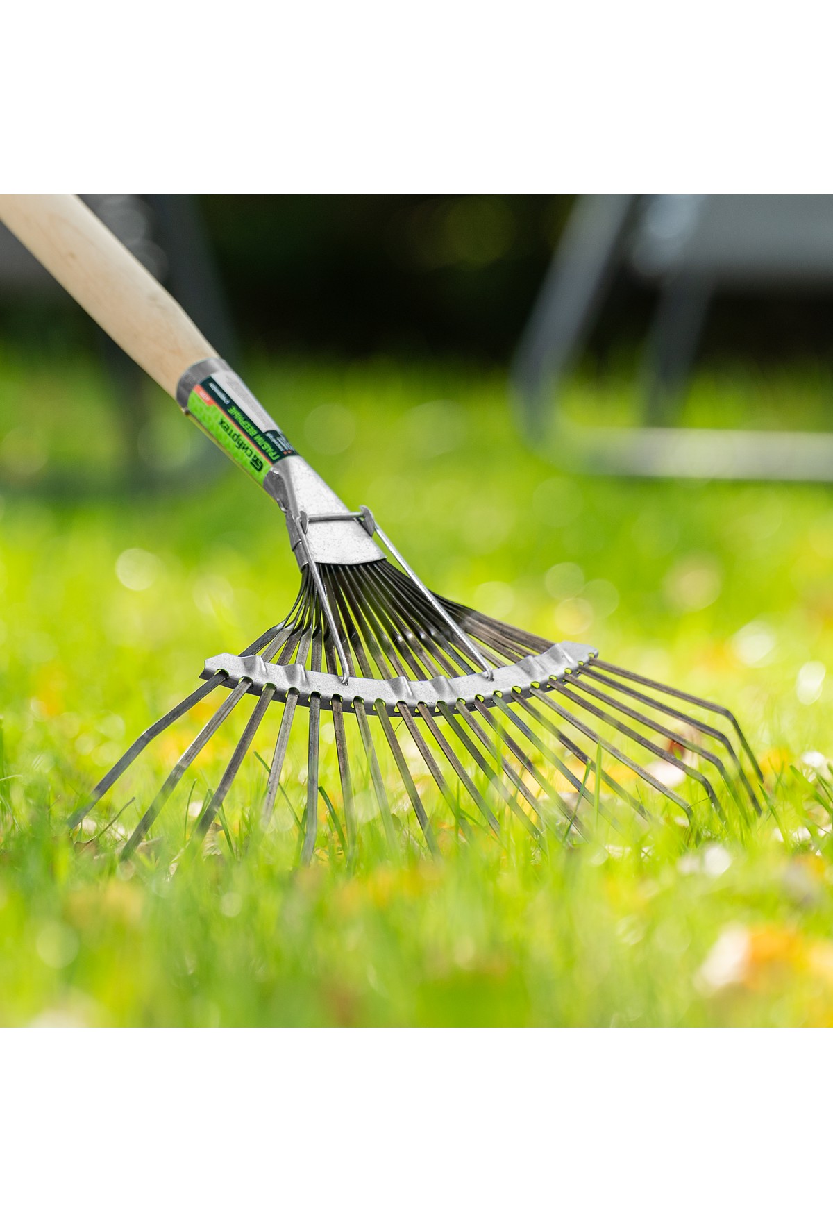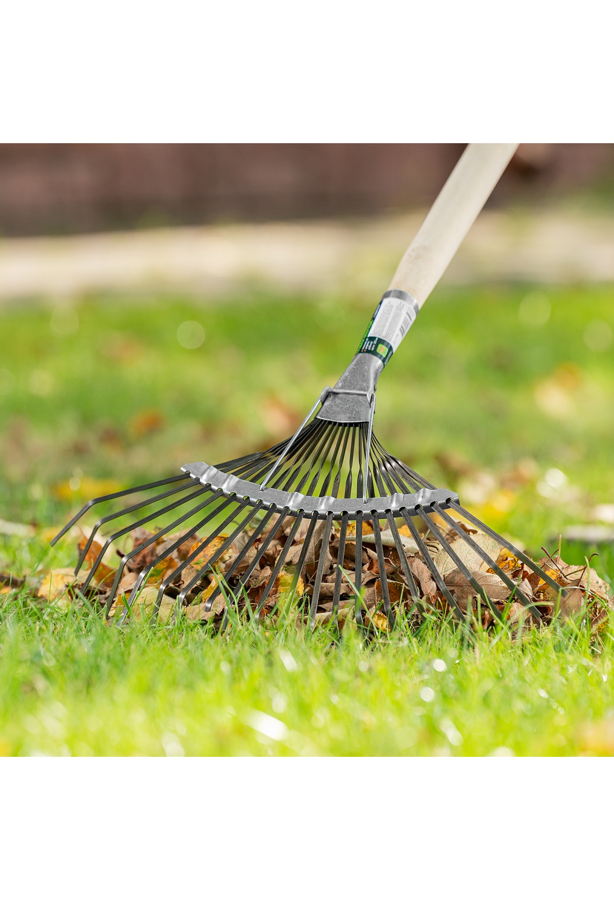 Веерные стальные грабли Сибртех 61778 с 20 плоскими зубьями, шириной 385 мм, оксидированные, без черенка, предназначены для работы на садовом участке. С их помощью удобно убирать мусор, листву и ветки с лужаек и грядок. Грабли можно установить на любой удобный черенок диаметром 25 мм.