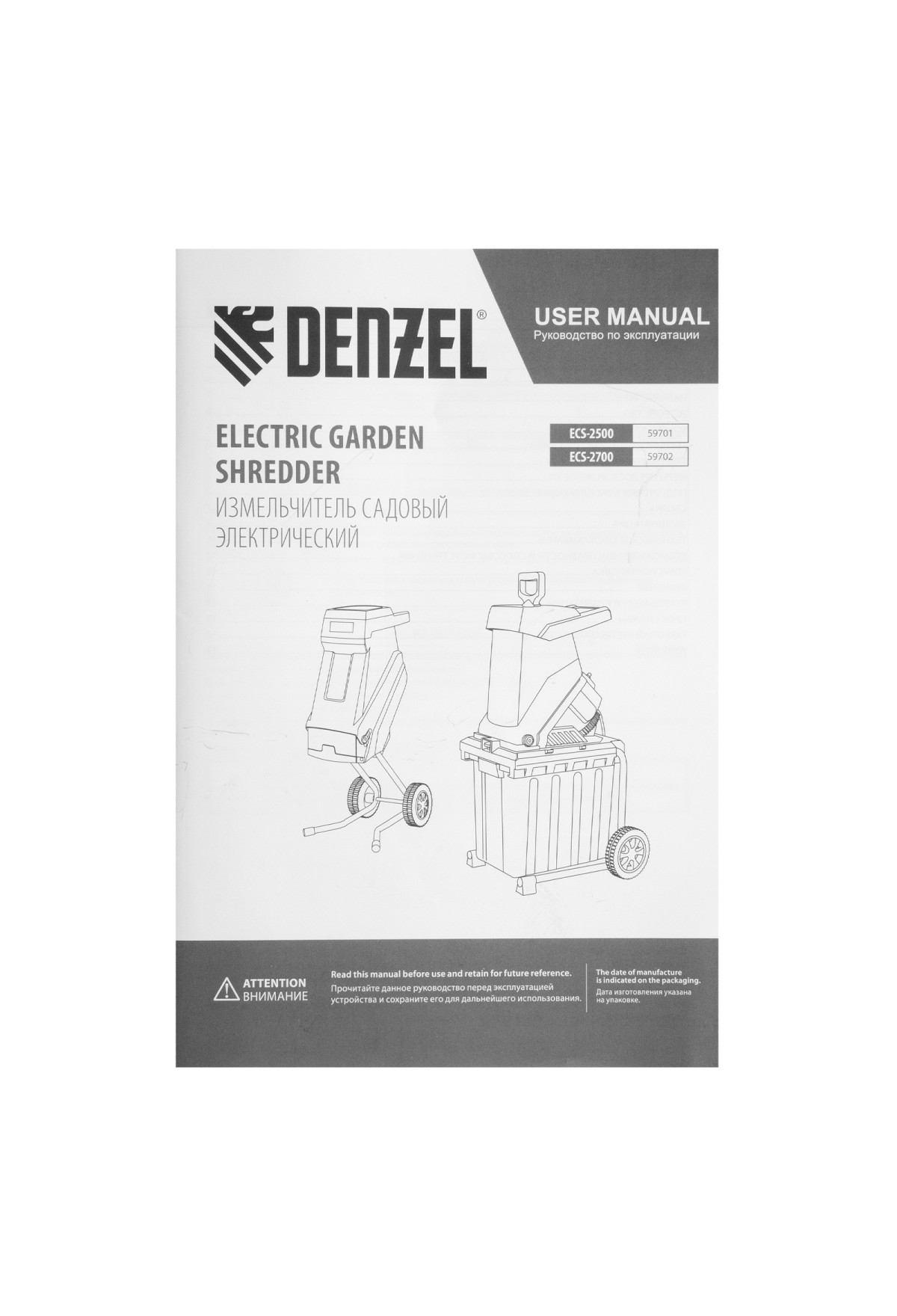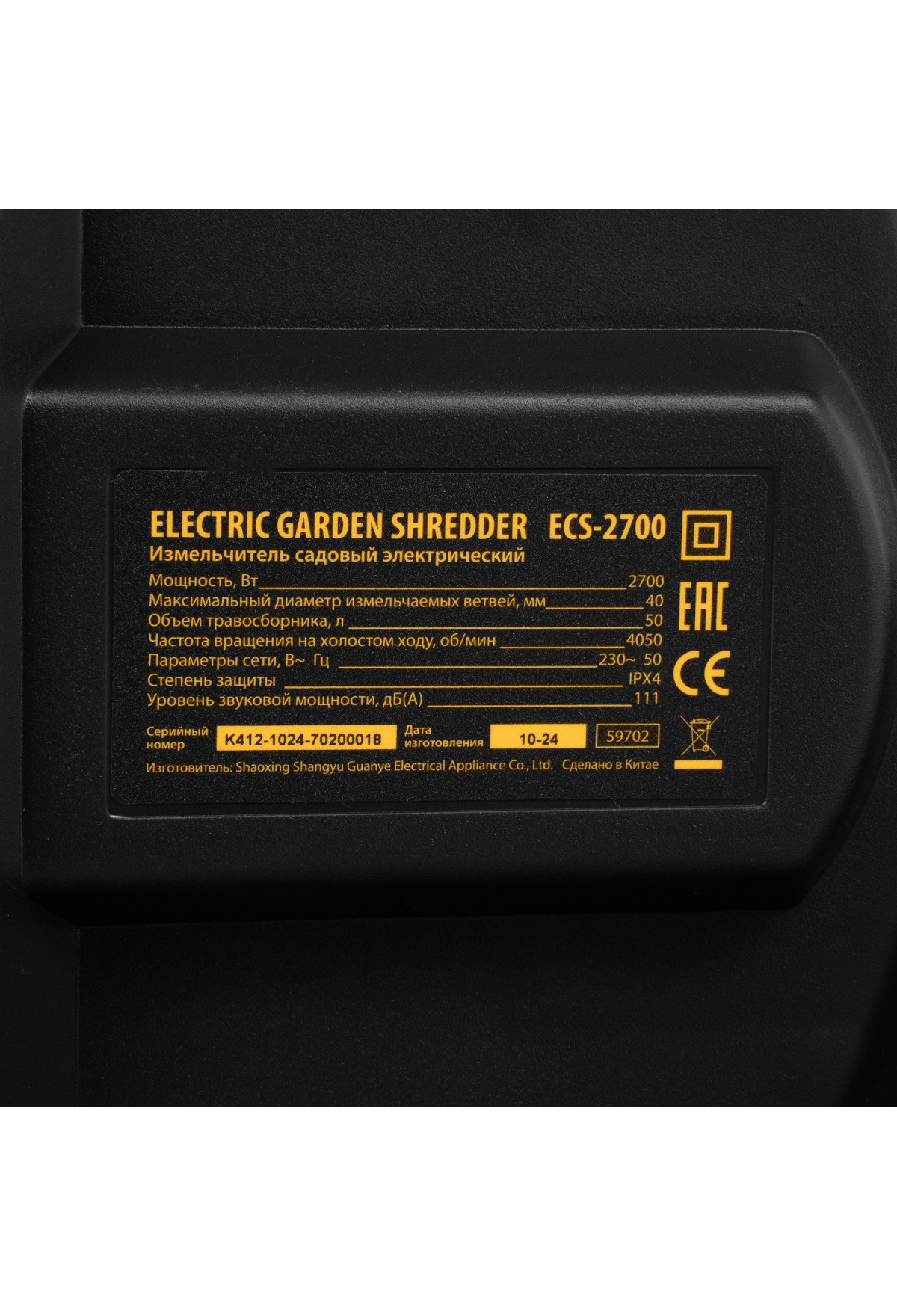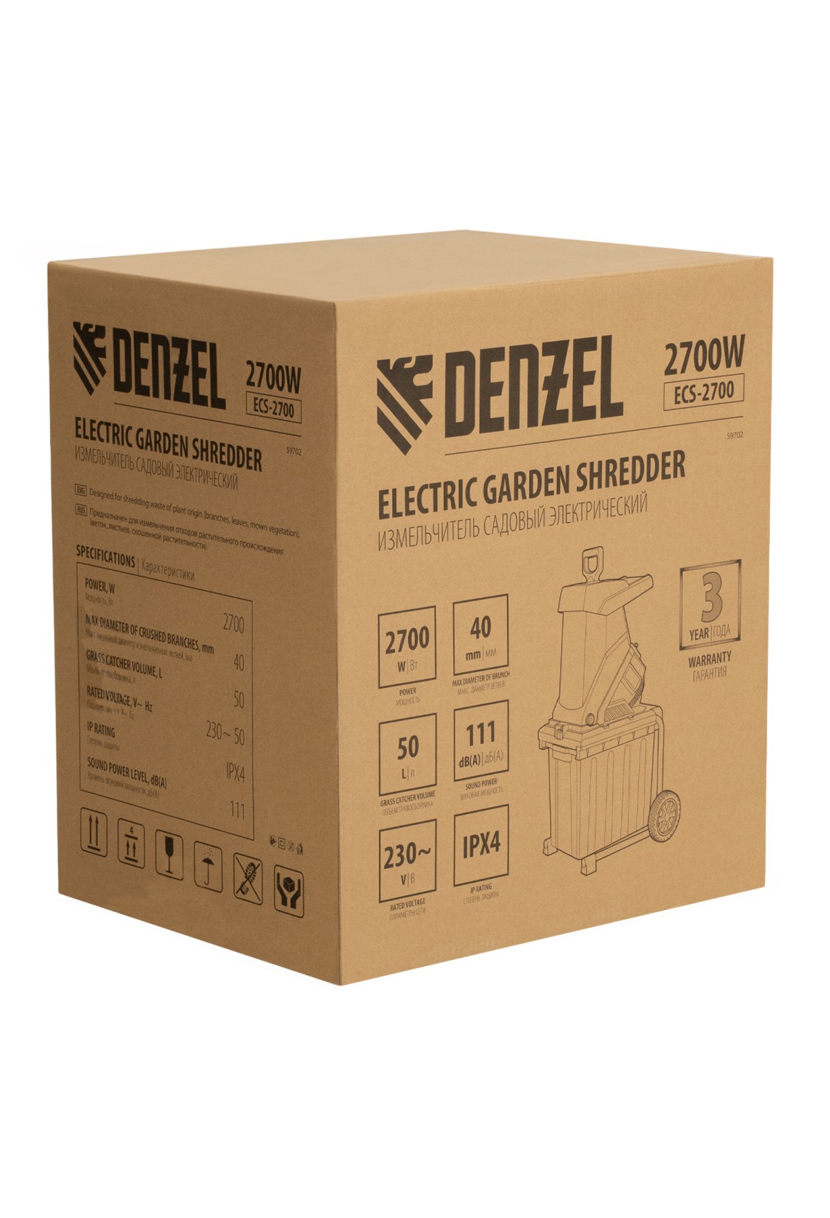Технические характеристики Измельчитель садовый электрический ECS-2700, 2700 Вт, 40 мм Denzel