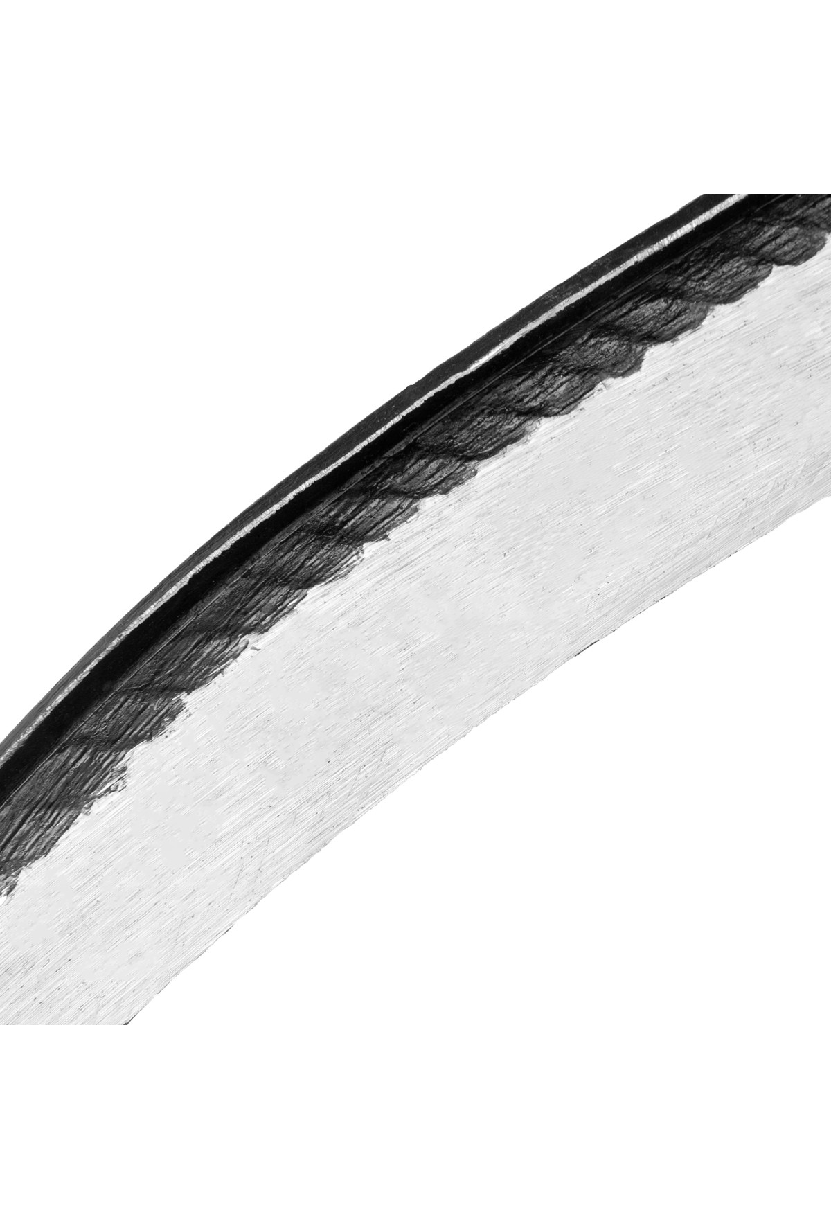 - Высокие режущие свойства — твердость рабочей кромки составляет 39-49 HRC, поэтому коса долго держит заточку.