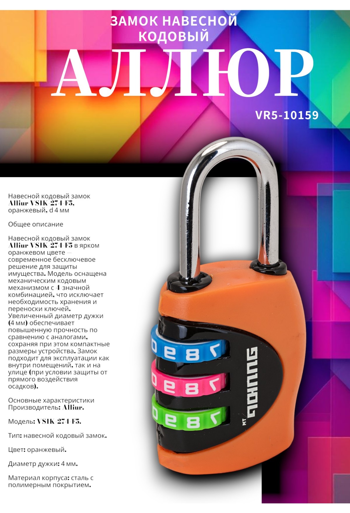 Навесной кодовый замок Alliur VS1K‑274‑F5, оранжевый, d 4 мм