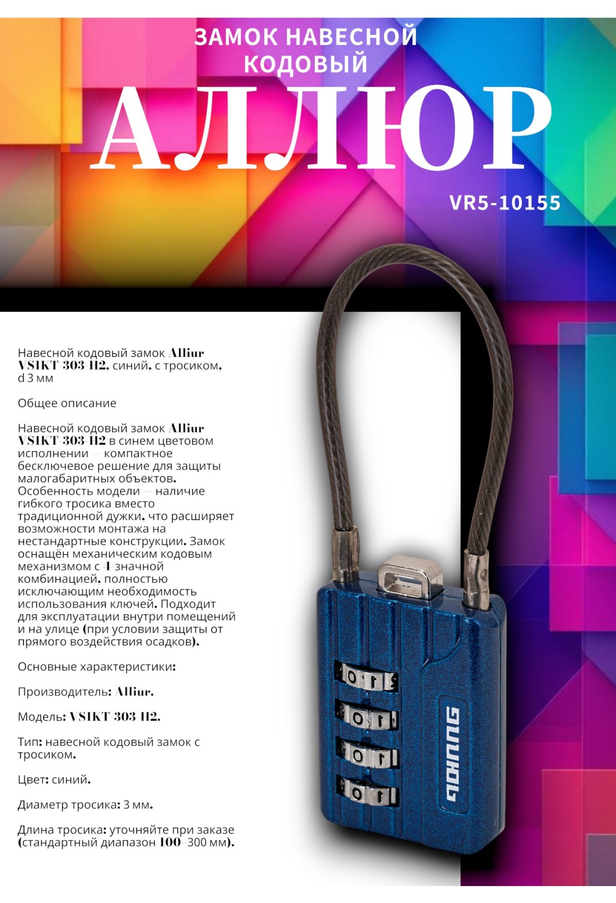 Навесной кодовый замок Alliur VS1KT‑303‑H2, синий, с тросиком, d 3 мм